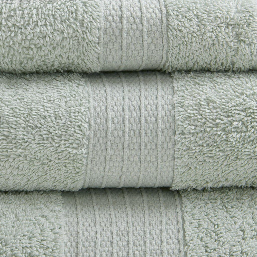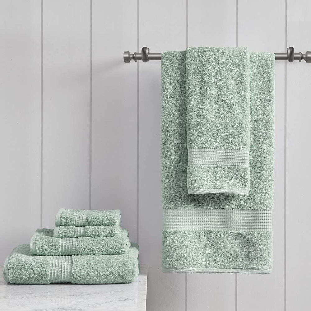 Madison Park Organic 100% Cotton Bathroom Towel Set, Hotel & Spa Quality Highly Absorbent, Quick Dry, Include for Shower, Handwash & Facial Washcloth, Multi-Sizes, Seafoam Cotton Featuring GOTS certified Premium 100% organic long staple cotton yarn, these 650GSM towels bring an all-natural, fresh touch to your bathroom décor. The Towel set is OEKO-TEX certified, meaning it includes no harmful substances or chemicals ensuring quality and wellness. Low twist cotton yarn construction provides more air and space between fibers to dry faster. Set includes: 2 Bath Towels:30"W x 54"L, 2 Hand Towels:18"W x 30"L, 2 Wash Towels:13"W x 13"L Care instructions: Wash before first use. Machine wash warm on gentle cycle with like colors. Only use non-chlorine bleach when needed. Avoid contact with products containing benzoyl peroxide. Do not wash with sharp items that may pull the towel fibers, such as zippers or hooks. To maintain the quality and performance of your towels, avoid the use of fabric softeners and dry sheets. Tumble dry low, remove promptly. Do not iron. Before use, simply shake towels to restore fluff and pile. The Madison Park Organic 6 Piece Cotton Towel Set brings an all-natural, modern style to your bathroom décor. These 650 GSM towels are exceptionally thick and soft, creating the perfect spa-like look and feel. Highly absorbent, this organic 100% cotton towel set is true quality and machine washable for easy care. Set includes: 2 bath towels, 2 hand towels, and 2 wash towels.