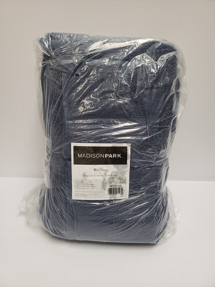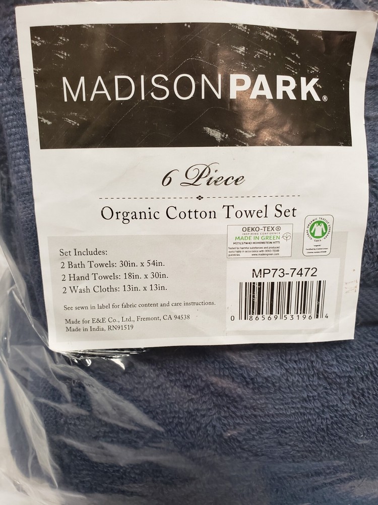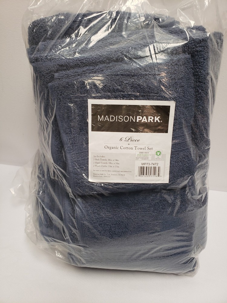 Description: The Madison Park Organic 6 Piece Organic Cotton Towel Set. These 650gsm towels feature long staple GOTS certified organic yarns that are exceptionally soft and absorbent, while the low twist construction provides more air and space between fibers to dry faster for maximum use and comfort throughout the day. Machine washable for easy care, each towel is also OEKO-TEX certified, meaning it does not contain any harmful substances or chemicals, ensuring quality comfort and wellness. Set includes: 2 oversized 30x54" bath towels, 2 standard 18x30" hand towels, 2 standard 13x13" wash towels. Care Instruction: Wash before first use. Machine wash warm on gentle cycle with like colors. Only use non-chlorine bleach when needed. Avoid contact with products containing benzoyl peroxide. Do not wash with sharp items that may pull the towel fibers, such as zippers or hooks. To maintain the quality and performance of your towels, avoid the use of fabric softeners and dry sheets. Tumble dry low, remove promptly. Do not iron. Before use, simply shake towels to restore fluff and pile. Material Details: 100% organic cotton