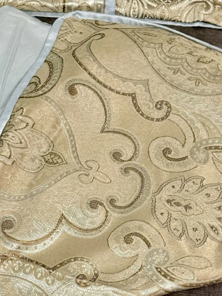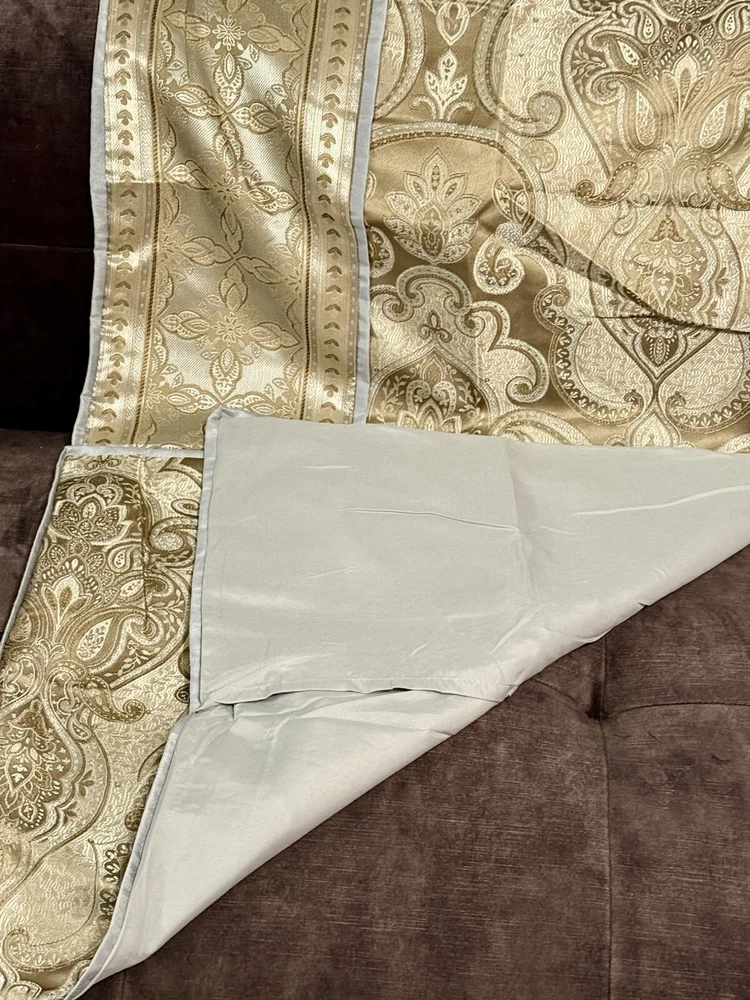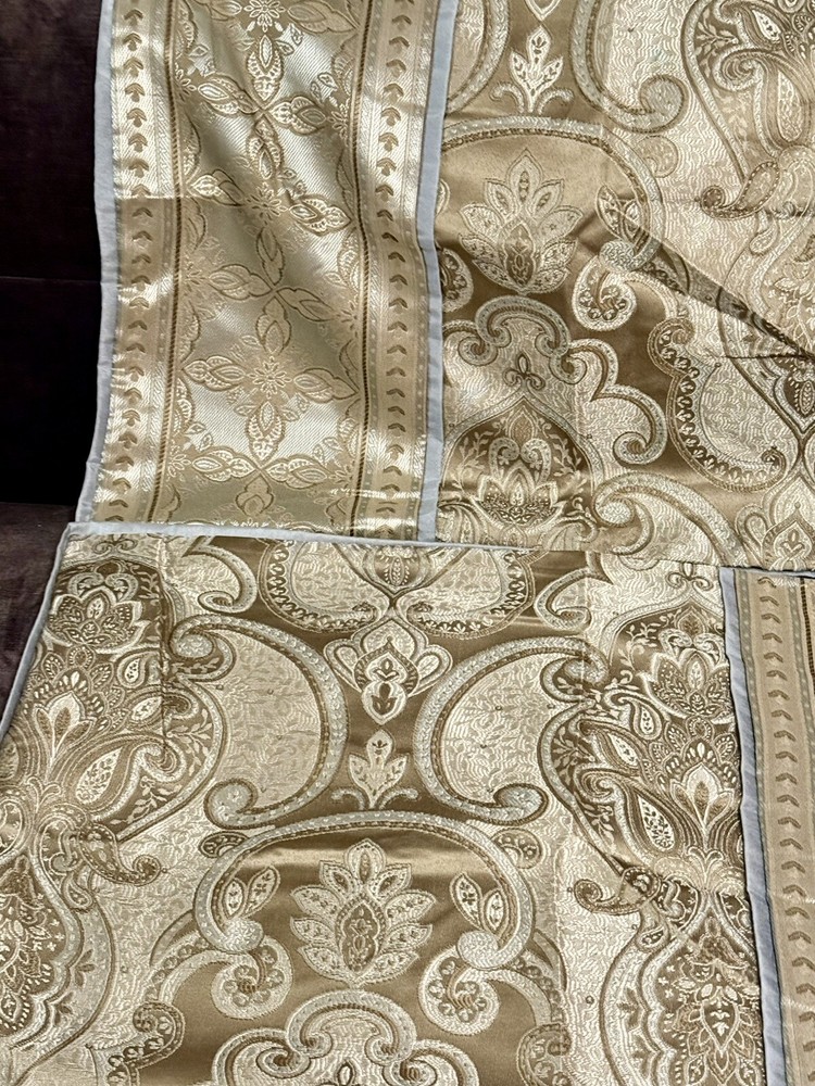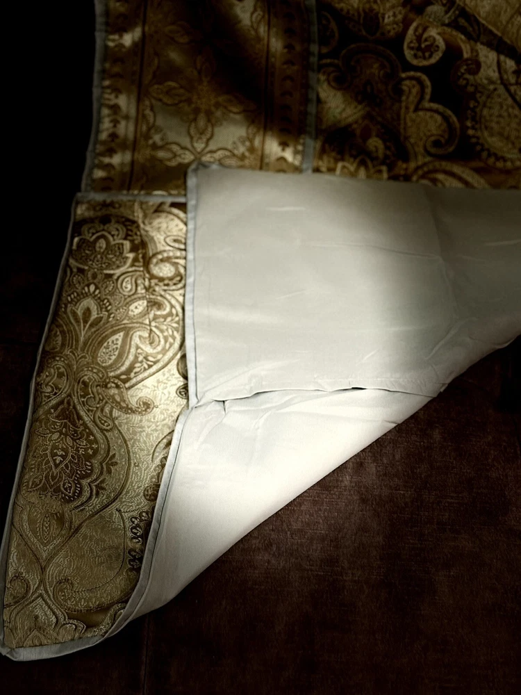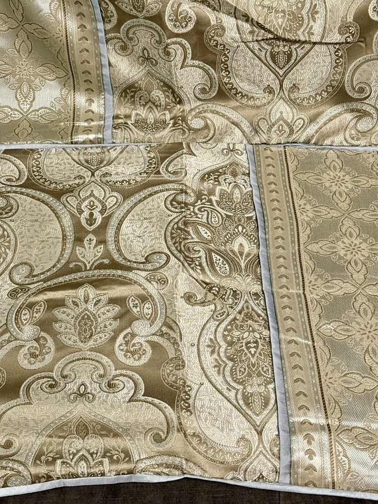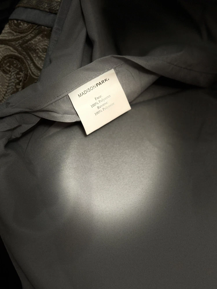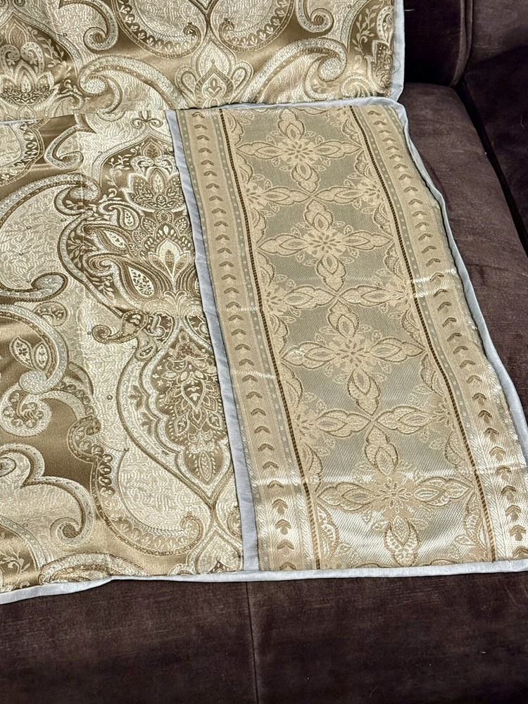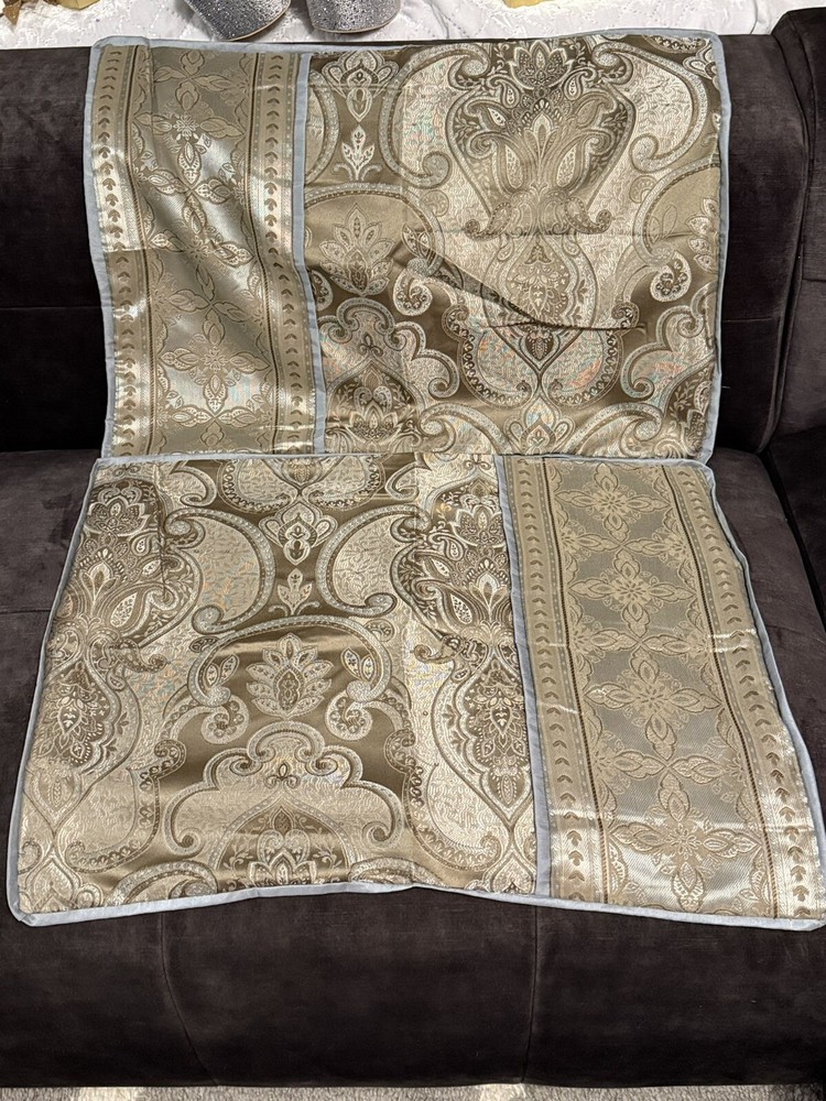 This product is a set of two Madison Park Queen Pillow Shams in a traditional style featuring a paisley pattern with metallic sheen. The shams are in shades of blue, gray, and brown, made of polyester material that is machine washable. They have a press fastening closure and are designed for use in the bedroom.