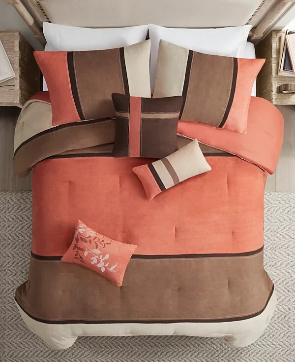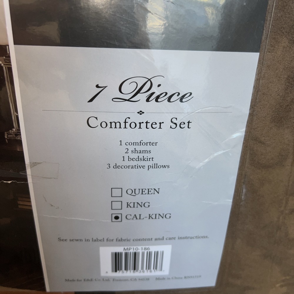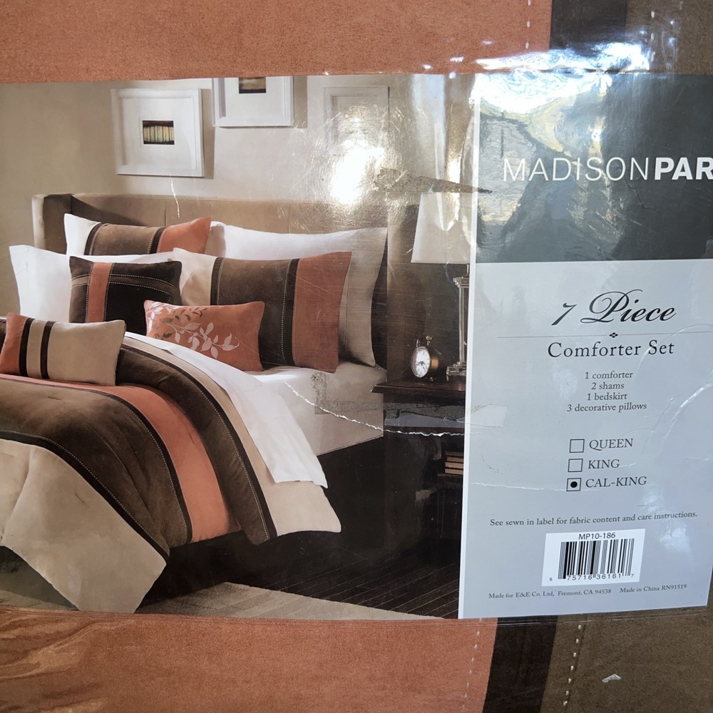 The Palisades comforter set from Madison Park features the soft comfort of polyester microsuede, a fabric known equally for its ease-of-care and it gentle touch. Product Features Set includes: comforter (104" x 92"), two king shams (20" x 36"), one bed skirt (72" x 84" + 15") and three decorative pillows (18" x 18", 16" x 16", 12" x 18") Comforter and sham feature a polyester microsuede front Comforter/sham: polyester print; reverses to brushed polyester Comforter: polyester fill Bed skirt: polyester Pillows: polyester cover and fill Asian American & Pacific Islander Owned, Woman Owned Polyester Machine washable Imported This item will be chipped in compression bag with all tags