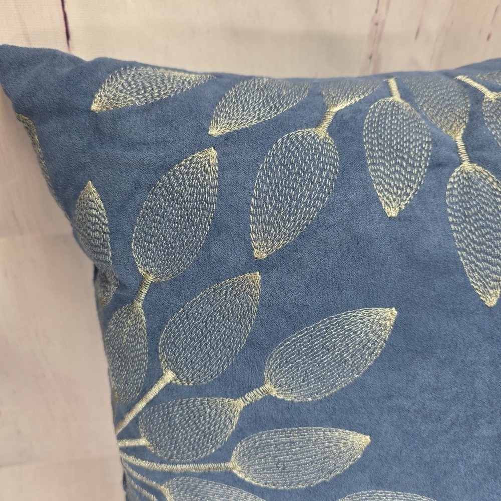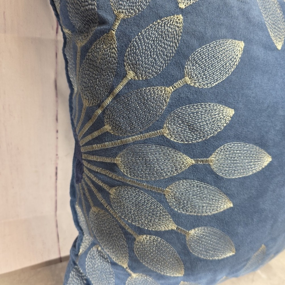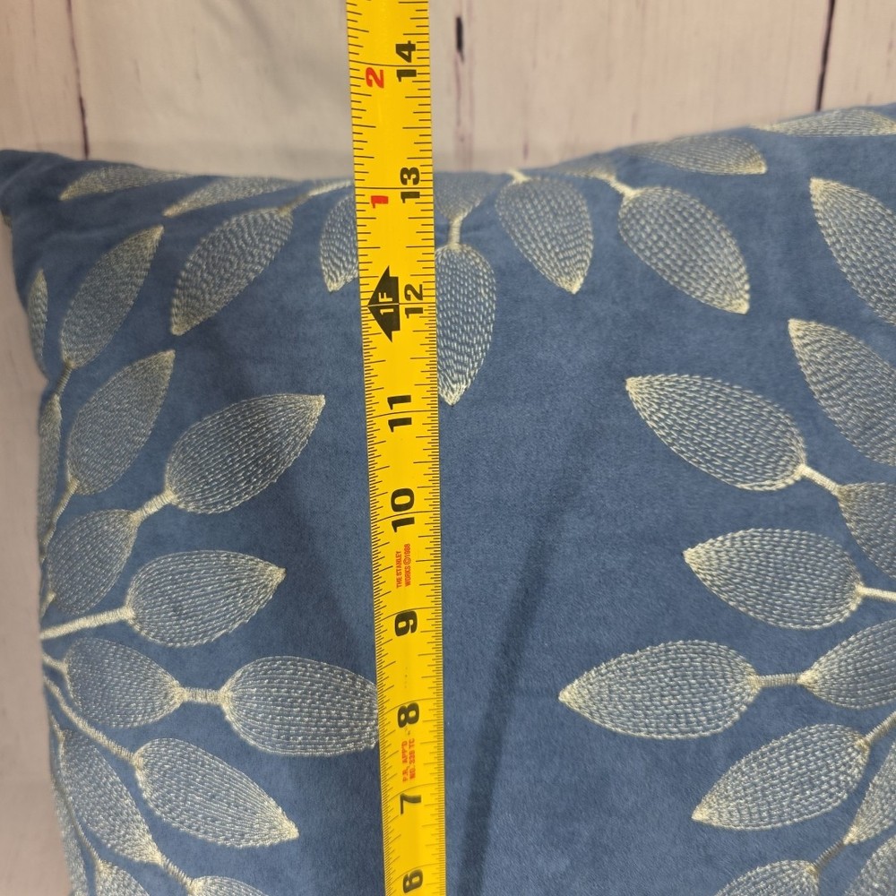 Someone did cut the tag off. I ship fast from south Dakota. The Madison Park Palmer Blue Suede Accent Throw Pillow features a floral design with stitched flowers, adding a touch of elegance to any room. Measuring 14 x 14 inches, this decorative throw pillow is made of suede material and embroidered for a stylish look. It is suitable for indoor use and can complement various settings such as the bedroom, living room, nursery, and dining room, enhancing the overall decor with its blue color and flower theme.