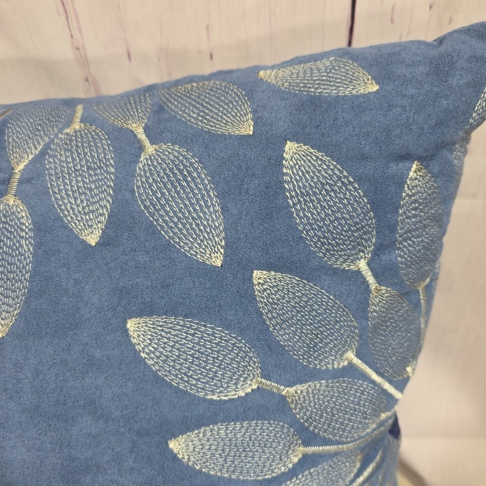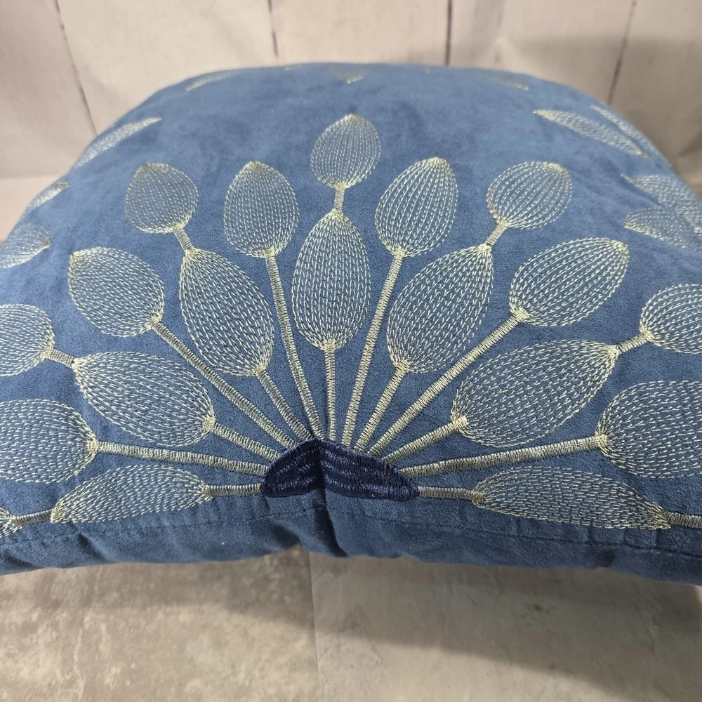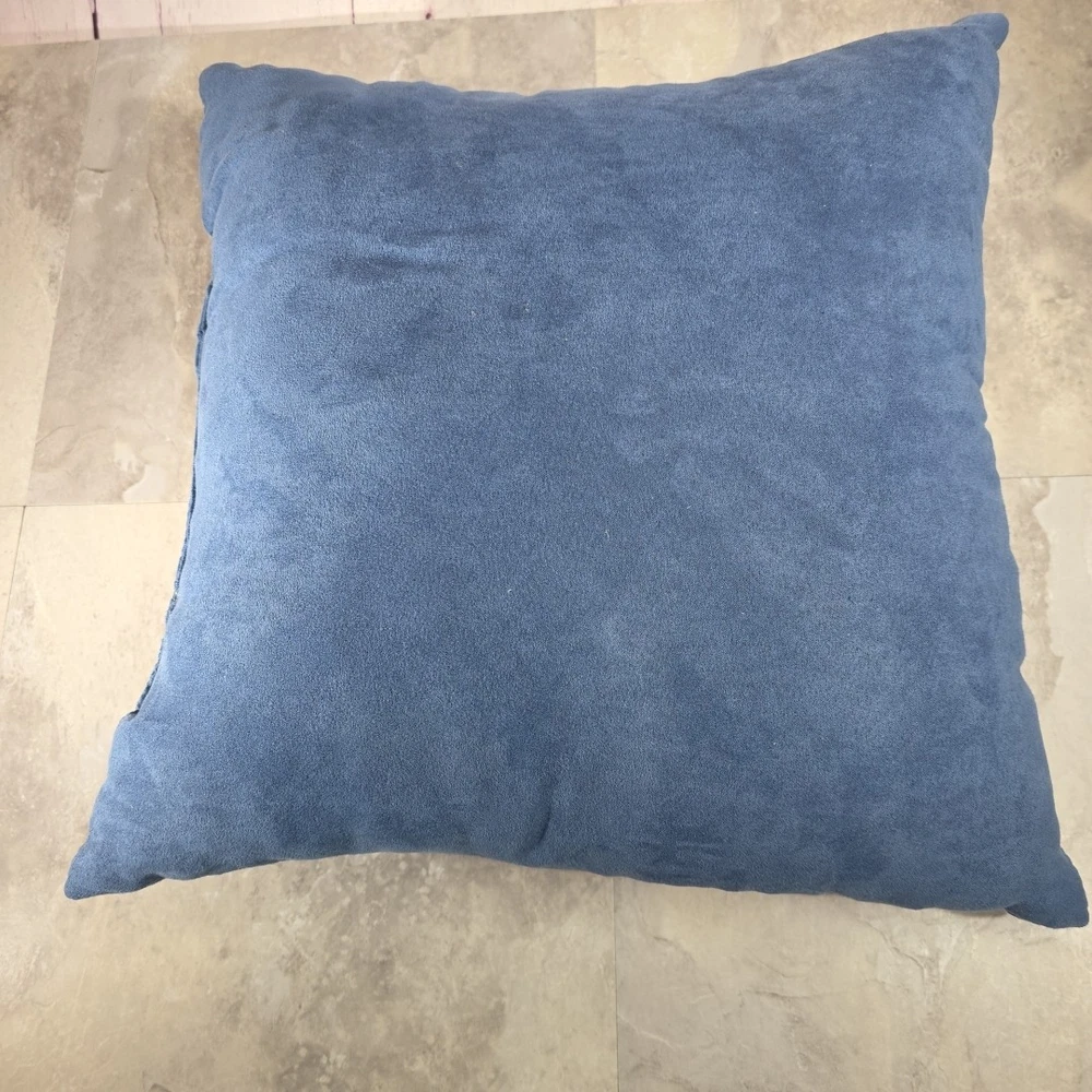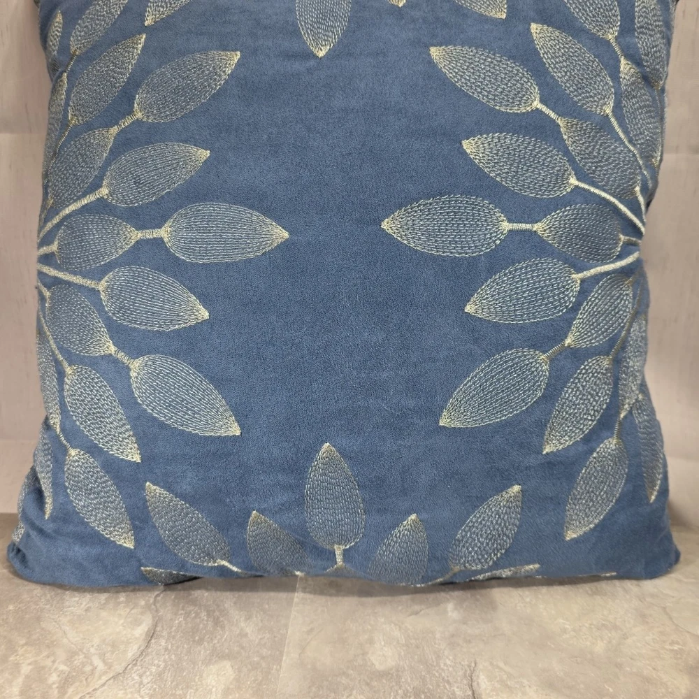 Someone did cut the tag off. I ship fast from south Dakota. The Madison Park Palmer Blue Suede Accent Throw Pillow features a floral design with stitched flowers, adding a touch of elegance to any room. Measuring 14 x 14 inches, this decorative throw pillow is made of suede material and embroidered for a stylish look. It is suitable for indoor use and can complement various settings such as the bedroom, living room, nursery, and dining room, enhancing the overall decor with its blue color and flower theme.