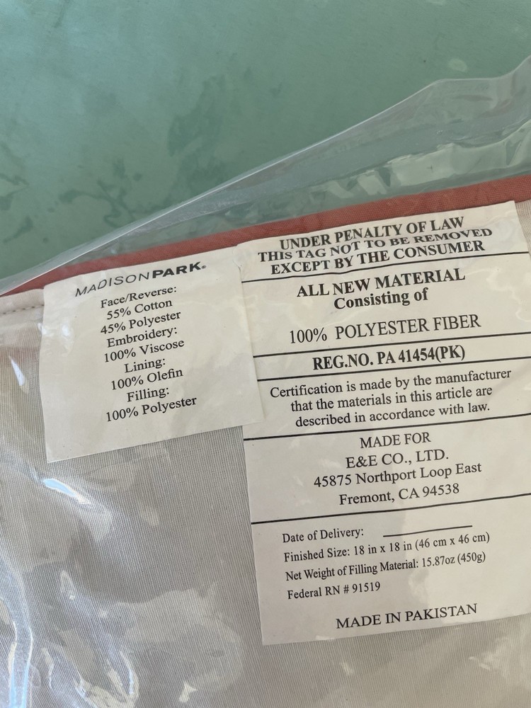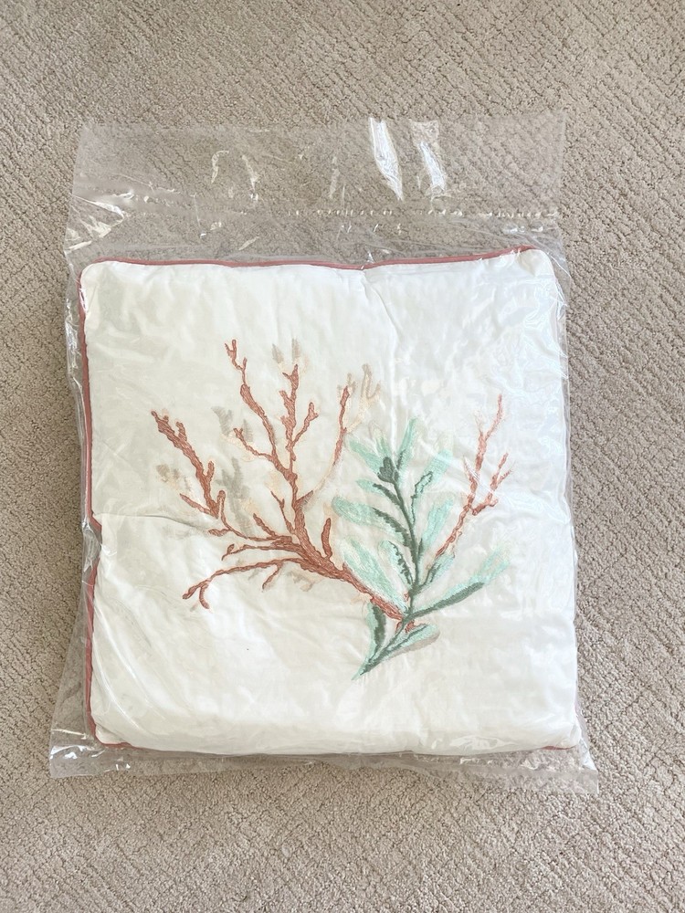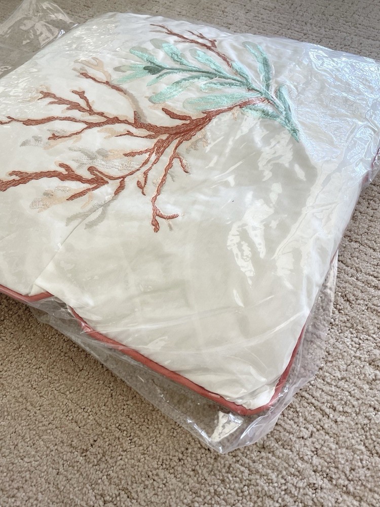 Add a touch of the beach to your home with this beautiful Madison Park Pebble Beach pillow. The 18 x 18 inch size is perfect for a couch, chair or bedding. Th embroidered coral pattern in teal, aqua and coral are eye catching. The coral piping trim makes it pop! This pillow is a great addition to any room that needs a bit of a seaside vibe. The pillow comes factory sealed and will plump up when plastic is removed. Never used, it was part of a set and was just not needed.
