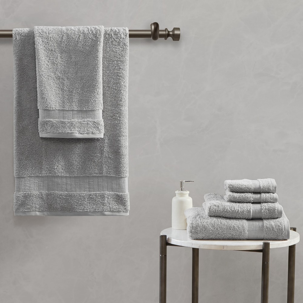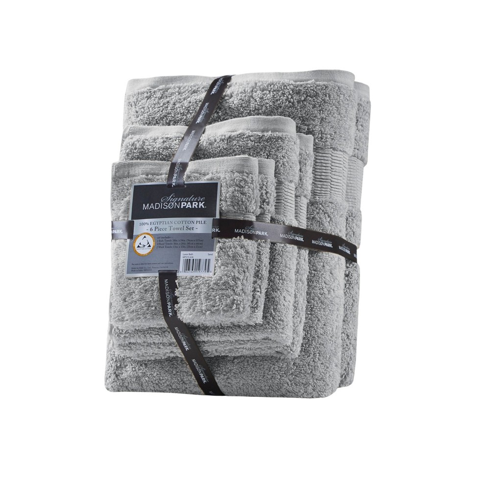Madison Park Signature 100% Egyptian Cotton 6 Piece Towel Set Description: Treat yourself with the luxurious comfort of our Madison Park Signature Luxor 100% Egyptian Cotton 6 Piece Towel Set. The long staple cotton yarn creates a rich plush softness, for a glamorous look and silk-like feel. Made from gold seal certified 100% Egyptian cotton, this towel set features 650gsm construction that ensures a premium quality and heavy weight for pure comfort. In addition, these towels are also Made in Green by OEKO-TEX certified, meaning they do not contain any harmful substances or chemicals while also using sustainable processes and socially responsible working conditions, ensuring the best in quality and wellness. With its incredibly soft touch, this 6 piece bath towel set is machine washable for easy care and offers the perfect lavish update to your bathroom decor. Set includes: 2 large 30x54" bath towels, 2 standard 16x26" hand towels, and 2 standard 13x13" wash towels. Care Instruction: Wash before first use. Machine wash warm on gentle cycle with like colors. Only use non-chlorine bleach when needed. Avoid contact with products containing benzoyl peroxide. Do not wash with sharp items that may pull the towel fibers, such as zippers or hooks. To maintain the quality and performance of your towels, avoid the use of fabric softeners and dry sheets. Tumble dry low, remove promptly. Do not iron. Before use, simply shake towels to restore fluff and pile. Material Details: 100% Egyptian cotton