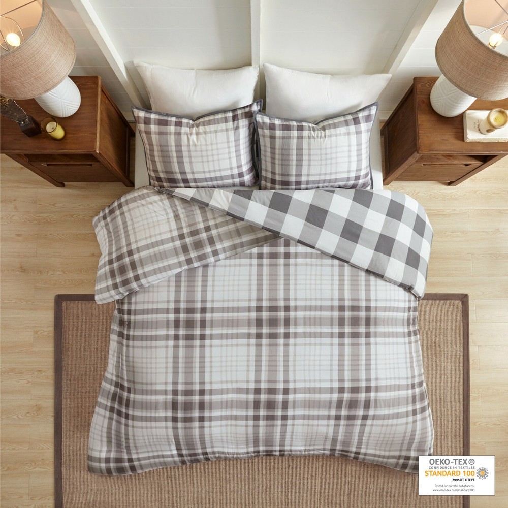 Create a casual farmhouse atmosphere in your bedroom with the Home Essence Prewitt 3 Piece Cotton Printed Reversible Duvet Cover Set. This cotton duvet features a plaid print on the face with a checkered pattern on the reverse, for a charming country look. Two reversible shams with hidden zipper closures match the patterns on the duvet cover, completing the bedding set. Made with 100% cotton percale, this bedding set is also OEKO-TEX certified, meaning it does not contain any harmful substances or chemicals to ensure quality comfort and wellness. A button closure helps secure a comforter insert within the duvet cover and inside ties in the corners help prevent it from shifting (insert is NOT included). Material Cotton Assembled Product Weight 4.46 lbs Count 3 Assembled Product Dimensions (L x W x H) 92.00 x 104.00 x 0.13 Inches 3 Piece: COVER and 2 shams FULL/QUEEN NEW