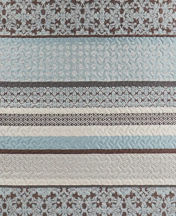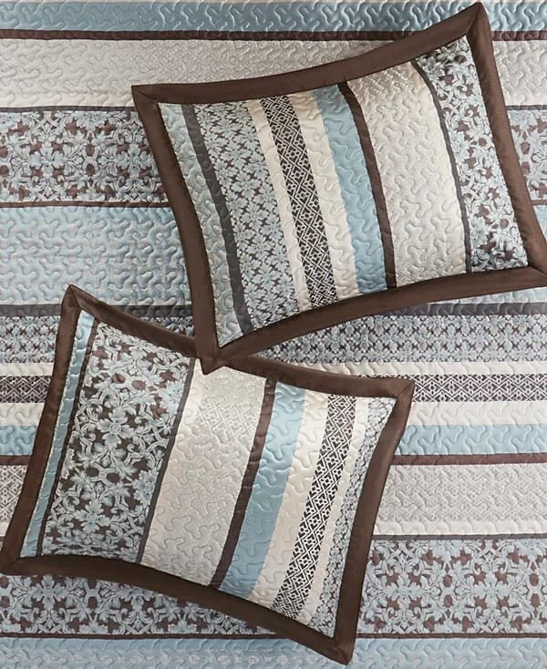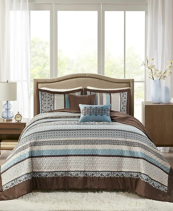Add a touch of richness to your home décor with the Madison Park Princeton 5 Piece Bedspread Set. Made from polyester jacquard, the bedspread and shams share leaf, striping, and medallion motifs that are accentuated by a solid chocolate brown border and reverse. Pops of red and ivory are also used throughout this bedding collection, adding a lavish feeling to your décor. Two decorative pillows feature pleating and embroidery details that coordinate with the top of the bed to bring the entire look together. Product Features bedspread, 2 king shams, 2 decorative pillows bedspread:118" x 120", king sham (2):20" x 36" + 2", decorative pillows (2):18" x 18"/12" x 18" Stripe - Geometric Colors: Brown ground with red, white accents Asian American & Pacific Islander Owned, Woman Owned 100% polyester; Bedspread fill: 90% cotton, 5% polyester, 5% other fiber Machine Washable, Spot Clean Pillows Imported Retails $382.00