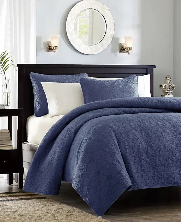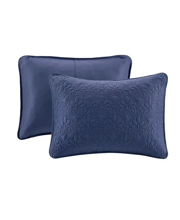 Quebec is the perfect coverlet to use as a layering piece or an alternative to your comforter for a new solid look. The classic stitch pattern pairs easily with your existing décor and will be sure to add a new decorative element to your bedroom. The coverlet has 100% cotton fill and the face and the reverse of the coverlet are a super soft brushed fabric. Product Features Dimensions: coverlet 90" x 90", standard shams 20" x 26" Set includes: 1 coverlet and 2 standard shams Asian American & Pacific Islander Owned, Woman Owned Polyester with cotton fill Machine washable Color: Navy Imported