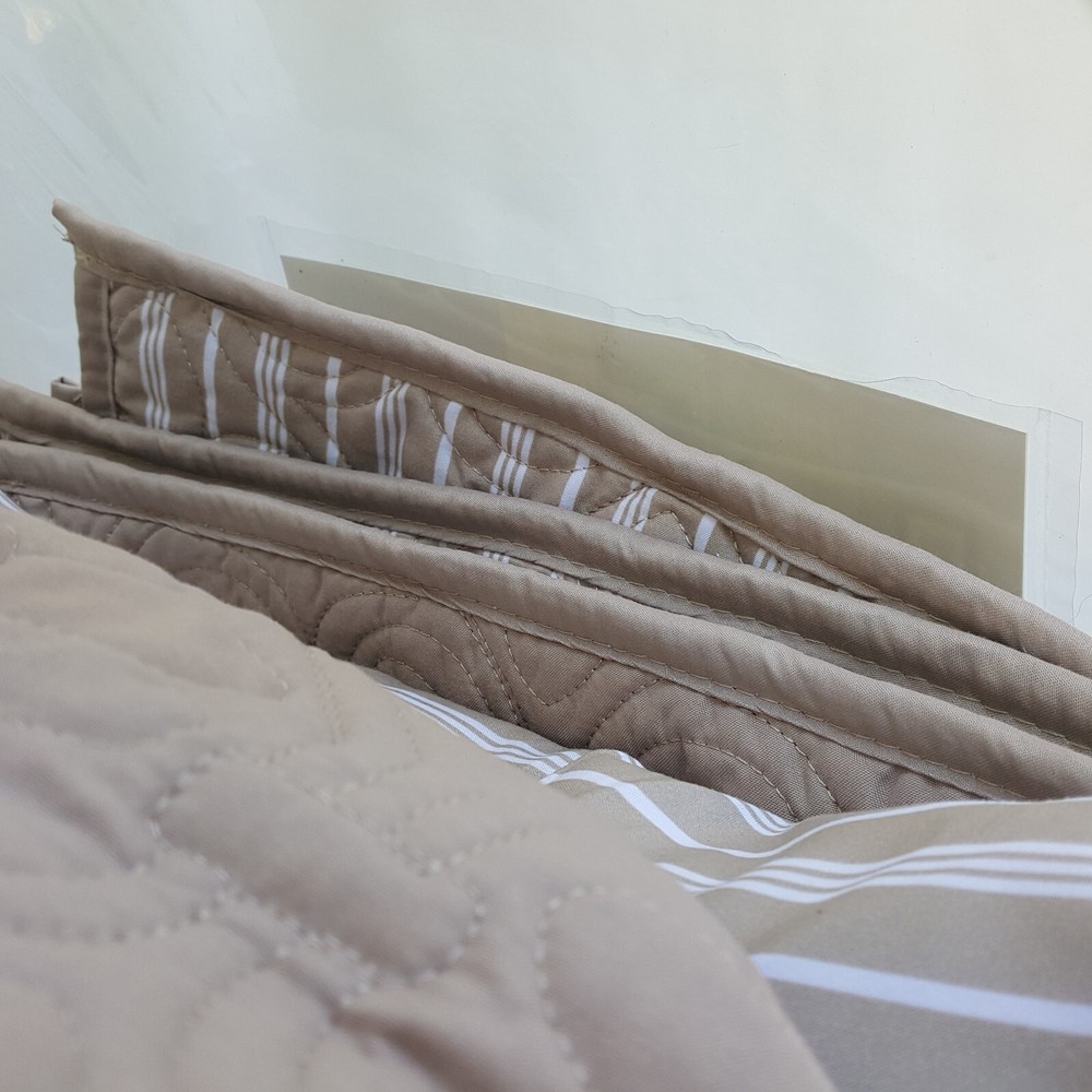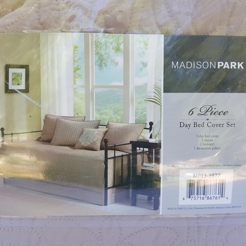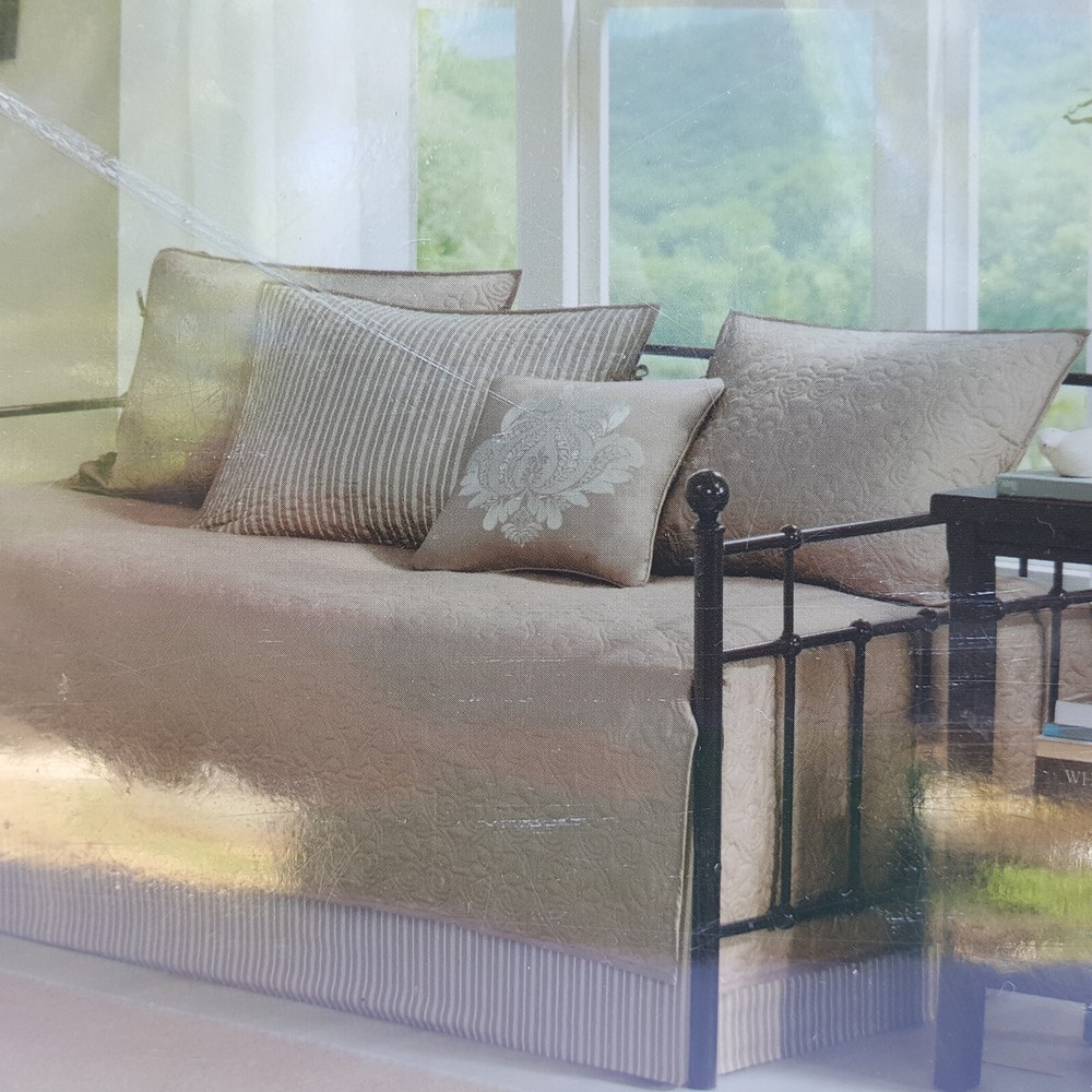 Madison Park Quebec 6-Pc. Daybed Bedding Set Khaki Quebec 6-piece reversible daybed cover set offers a charming cottage-inspired update to your guest bedroom. The daybed cover and shams flaunt a classic stitch pattern that creates a rich depth and texture on the face of the bedding set. A square decorative pillow with an elegant embroidery bed skirt adds the finishing touches to the daybed set. This daybed cover also has an antimicrobial treatment that provides built-in freshness protection, reducing the growth of odor-causing bacteria to keep the fabric lasting longer. What's Included? 1 Day Bed Cover 75" x 39" 3 Shams 26'' X 20'' 1 Bedskirt 39" x 75" + 15" 1 Decorative Pillow 16'' X 16'' The decorative pillow and bedskirt use coordinating fabrics to complete this look The cover features decorative quilting and 3 reversible shams for you to decorate the top of bed however you like Pattern quilted cotton filling for maximum comfort Daybed Cover, Sham, Bedskirt, Pillow - Polyester Microfiber, Daybed Cover with Cotton and Polyester Filling, Pillow with Polyester Filling Machine Washable Imported