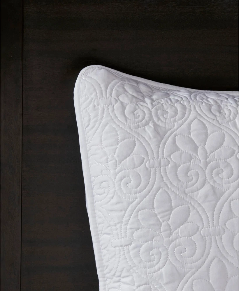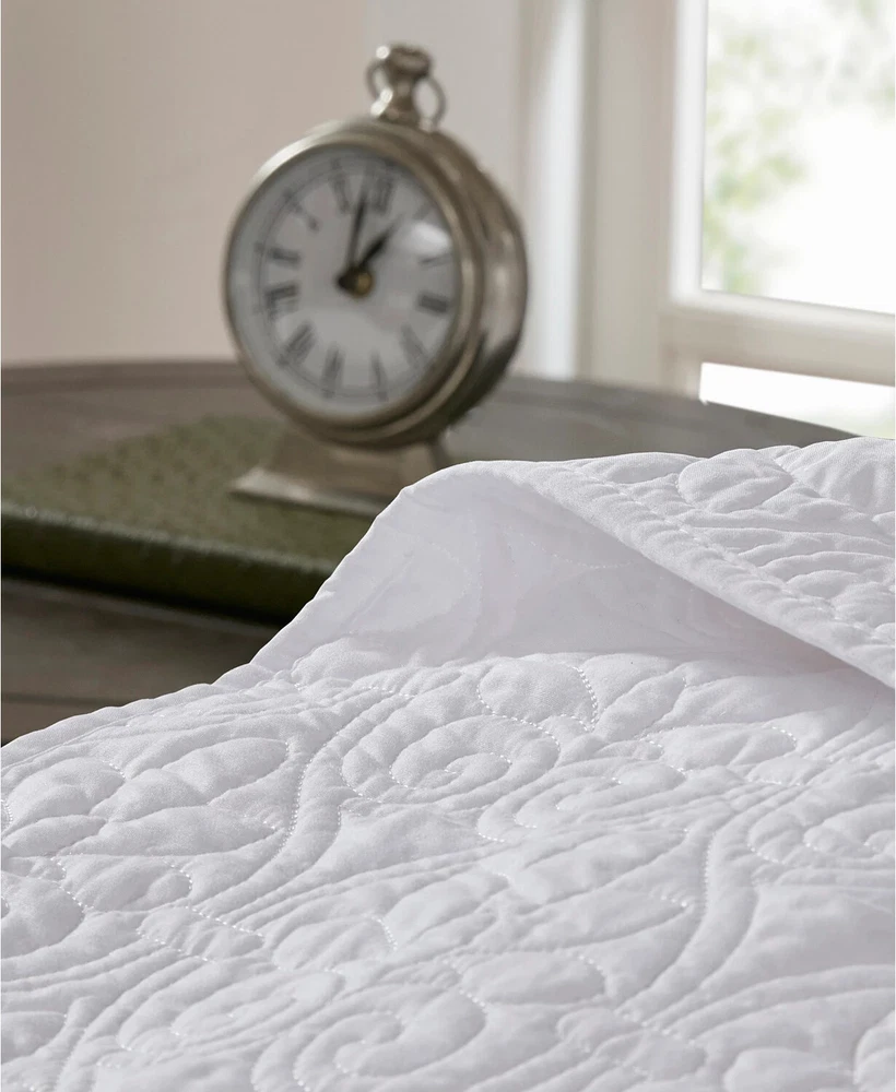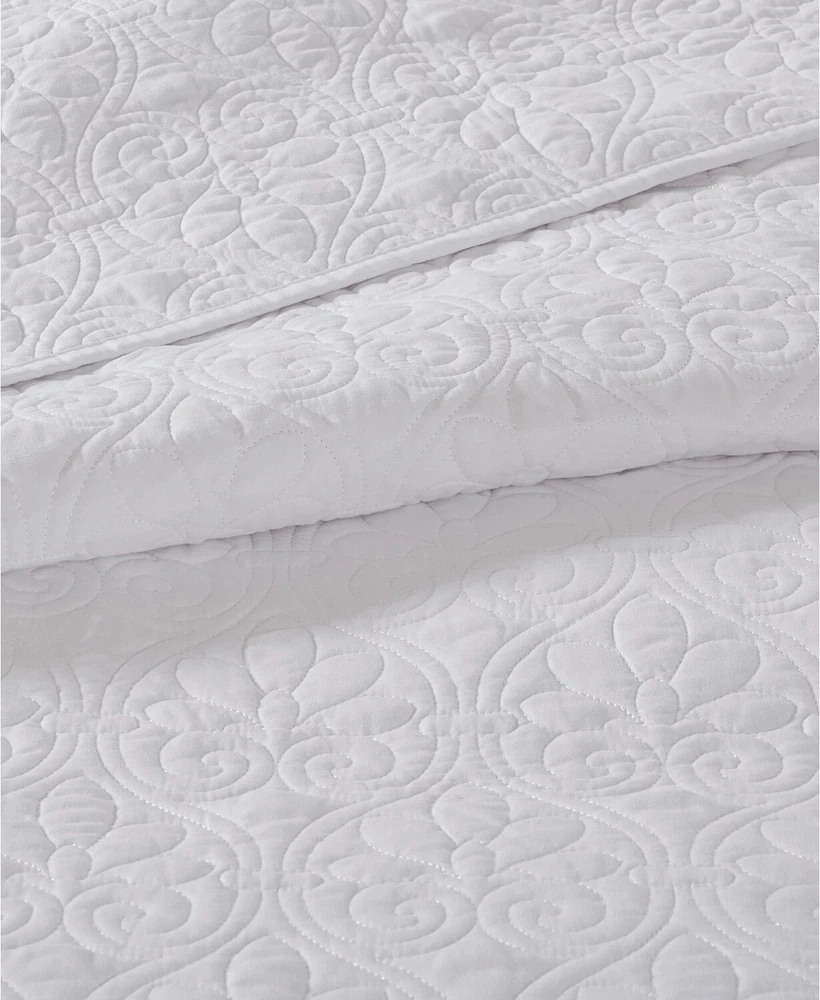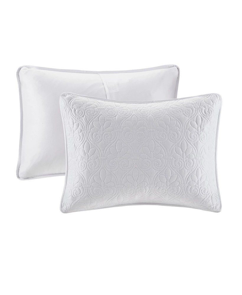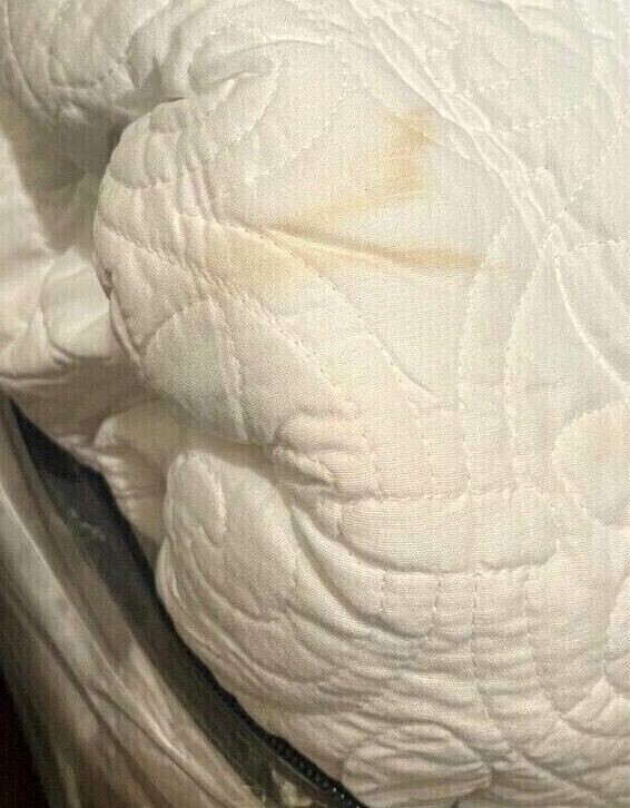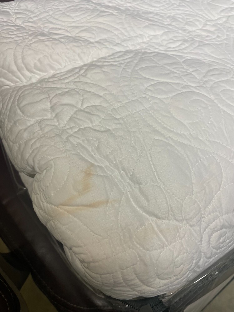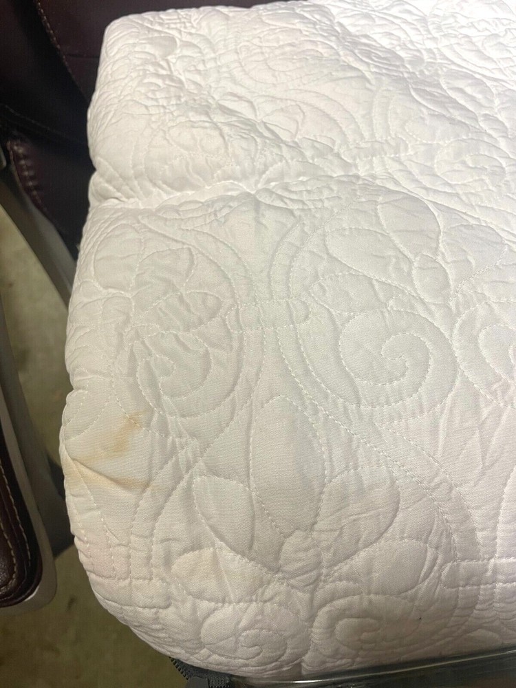 Brand New - Has stain on it which can be seen in photos from different angles. Color: White Size: King Quebec is the perfect bedspread to use as a layering piece or an alternative to your comforter for a new solid look. The classic stitch pattern pairs easily with your existing décor and will be sure to add a new decorative element to your bedroom. The bedspread has 100% cotton fill while the face and reverse are a super soft brushed fabric. Bedspread, 2 king shams Bedspread: 120" x 118", king sham (2):20" x 36" Solid Polyester; Bedspread fill: cotton/polyester Machine Washable Imported