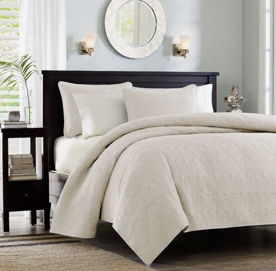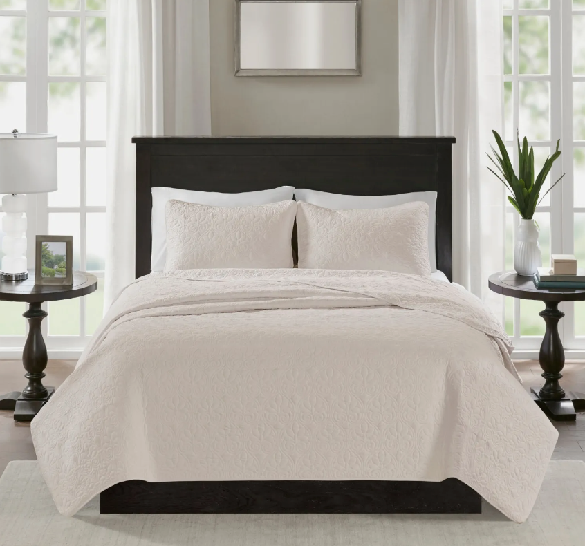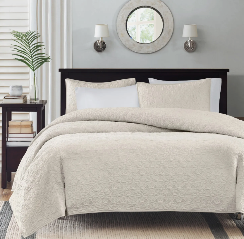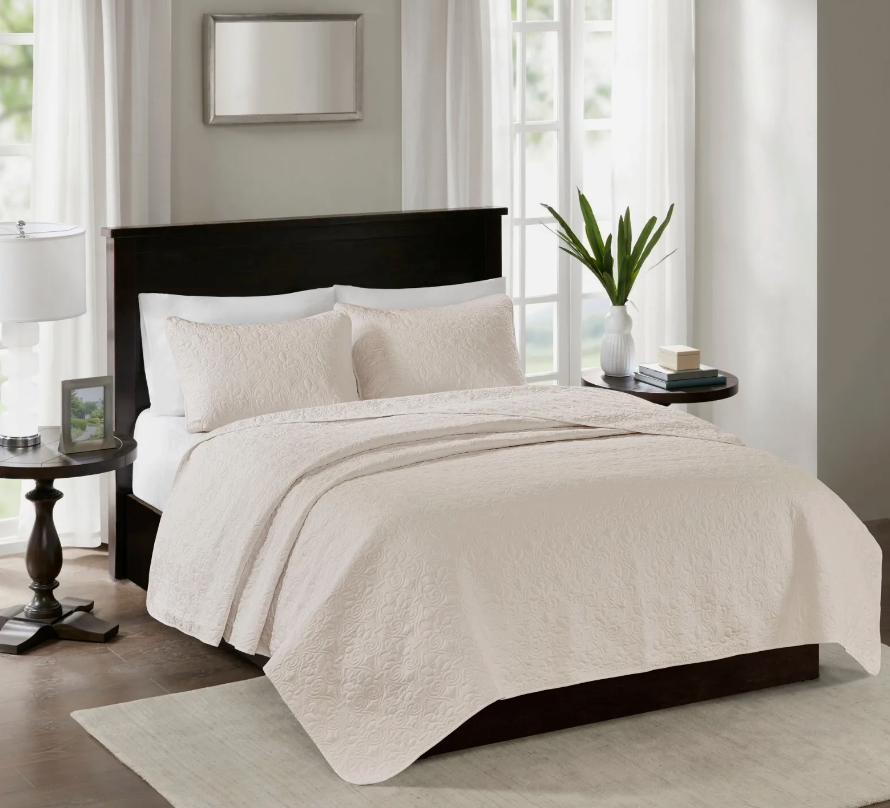 DESCRIPTION The Madison Park Quebec Reversible Coverlet Set offers a charming cottage-inspired update to your bedroom. The coverlet and shams (1 in Twin/TwinXL) flaunt a classic stitch pattern that creates a rich depth and texture on the face of the bedding set. Prewashed cotton filling provides added comfort and durability making it the perfect for use in the summer or as a layering piece in the winter. This coverlet also has an antimicrobial treatment that provides built-in freshness protection, reducing the growth of odor causing bacteria to keep fabric lasting longer. FEATURES • Casual bedding set that is perfect for summer use or layer it on for warmth • 3 piece reversible coverlet set with patterned quilting • Pre-washed cotton filling for comfort and stability • Set includes coverlet and two matching shams (1 for Twin/TwinXL) • Anti-microbial treatment for health and wellness - provides odor control, prevents bacteria buildup, enhances hygiene, and extends product life by keeping linen fresh • Machine washable MATERIAL Soft brushed Microfiber Face and Back, 90% Cotton, 10% other Fibers fill, prewash finish. King/Cal King Quilt Set includes: 1 Quilt: 104"W x 94"L 2 King Shams: 20"W x 36"L
