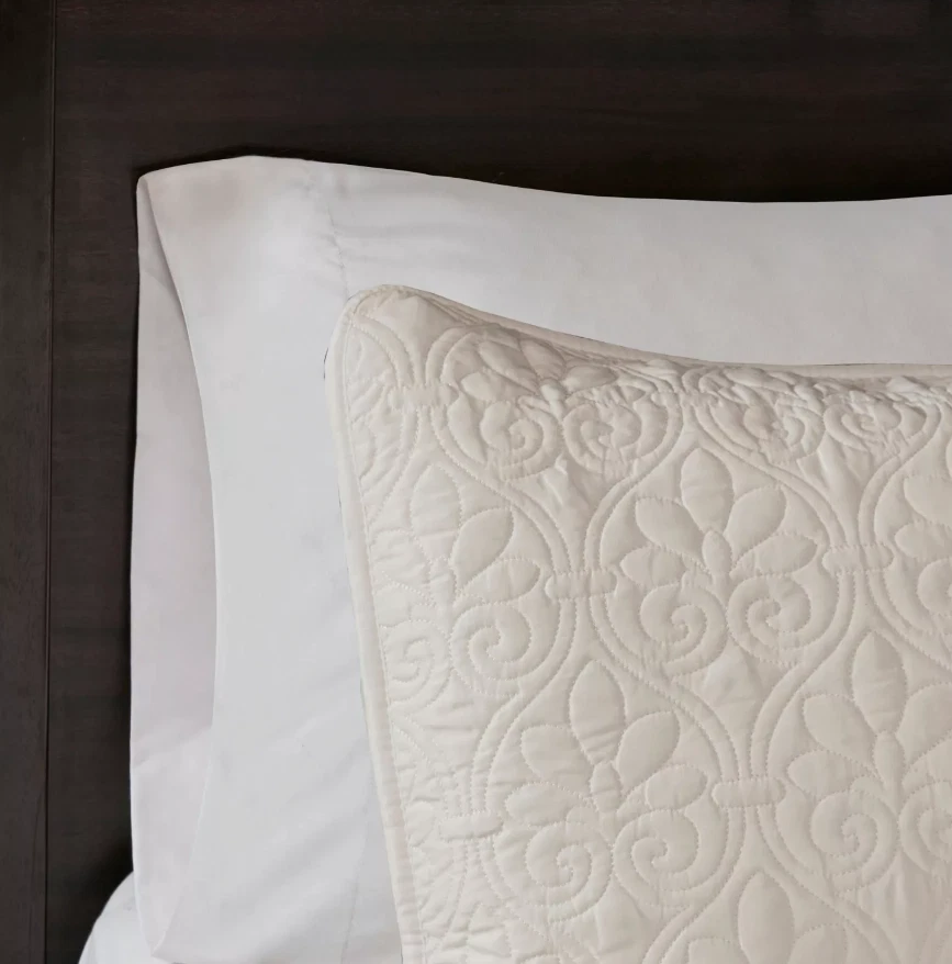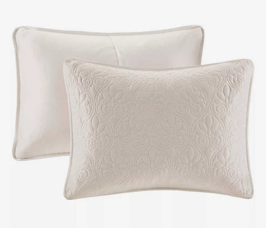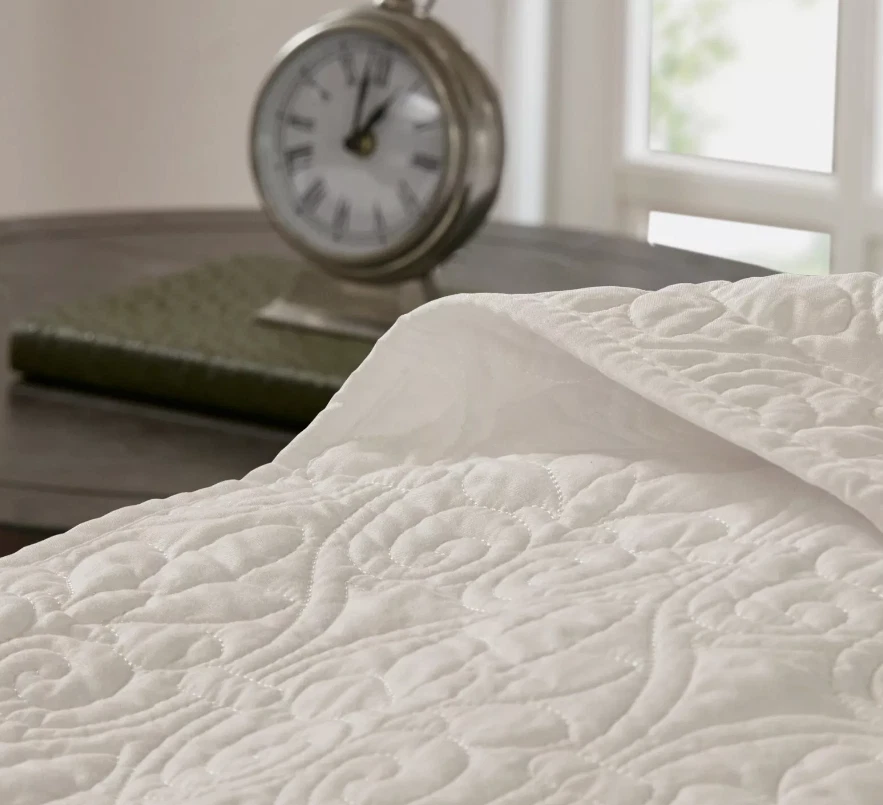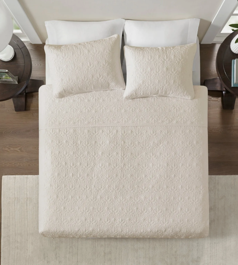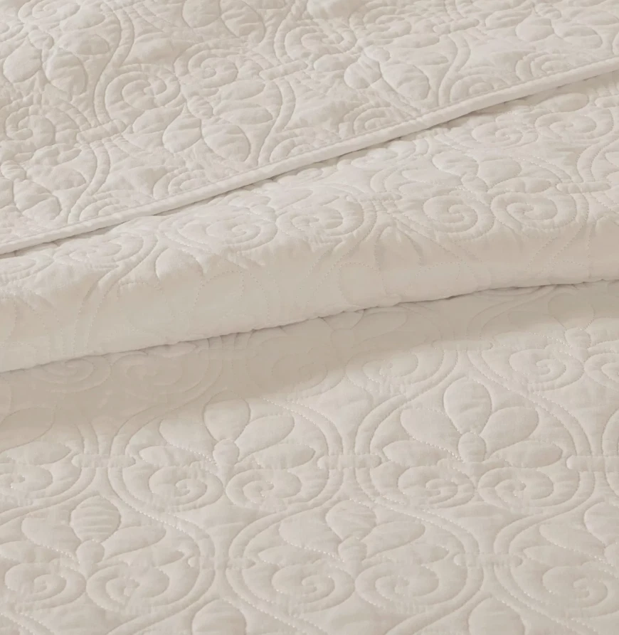 DESCRIPTION The Madison Park Quebec Reversible Coverlet Set offers a charming cottage-inspired update to your bedroom. The coverlet and shams (1 in Twin/TwinXL) flaunt a classic stitch pattern that creates a rich depth and texture on the face of the bedding set. Prewashed cotton filling provides added comfort and durability making it the perfect for use in the summer or as a layering piece in the winter. This coverlet also has an antimicrobial treatment that provides built-in freshness protection, reducing the growth of odor causing bacteria to keep fabric lasting longer. FEATURES • Casual bedding set that is perfect for summer use or layer it on for warmth • 3 piece reversible coverlet set with patterned quilting • Pre-washed cotton filling for comfort and stability • Set includes coverlet and two matching shams (1 for Twin/TwinXL) • Anti-microbial treatment for health and wellness - provides odor control, prevents bacteria buildup, enhances hygiene, and extends product life by keeping linen fresh • Machine washable MATERIAL Soft brushed Microfiber Face and Back, 90% Cotton, 10% other Fibers fill, prewash finish. King/Cal King Quilt Set includes: 1 Quilt: 104"W x 94"L 2 King Shams: 20"W x 36"L