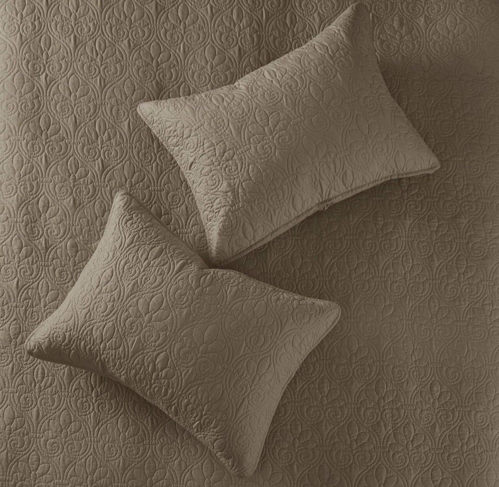 Madison Park Quebec Cotton Reversible Quilt Set is a 3-piece bedding set that includes a coverlet and pillow sham. The quilt set is made of a soft and durable microfiber and cotton blend material. It features a solid color pattern with a cottage style and is suitable for all seasons. The set is hypoallergenic and can be machine washed. Coverlet: 94 Inches (L) x 104 Inches (W)
