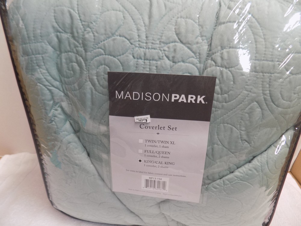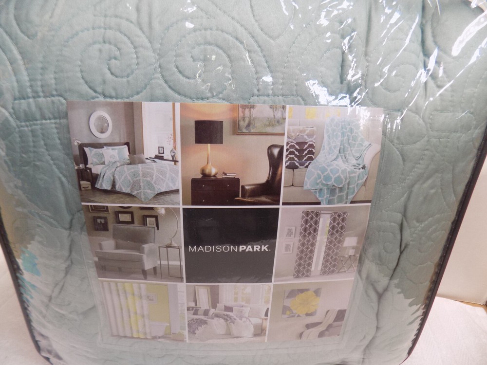 MADISON PARK - COVERLET SET COVERLET Color: DUSTY PALE SEAFOAM Retail: 140 Description Quebec 3 Piece Coverlet Set Size: King, Color: Seafoam Size King/California King(104 in x 94 in) Included Components 1 Coverlet, 2 King Shams Color Seafoam Style Reversible Coverlet Set Brand Madison Park About this item 100% Polyester Imported FEATURE Soft microfiber fabric in Seafoam all over floral pattern quilting Face fabric - 100% polyester, 90/10 cotton/other fiber filling for optimal comfort Measurement 104-by-94 inch coverlet, 20-by-36 inch King sham Machine washable for easy care Materials: 100%POLYESTER Shipping to Hawaii, Puerto Rico and Alaska is not free. We offer a 30 days refund policy only if the items sold are found to be incorrectly described. We are not responsible for pictures showing incorrectly on your monitor. The refunds will only be made if the following return guidelines are followed: The item must be returned in all the original packaging, including cartons, boxes and must not have been cleaned or laundered. All returns must be boxed and packed securely for shipping. Refunds are within 30 days from the day the customer received the original item. We will send you a prepaid label to send the item back. If the item is found to be as described you will receive a refund of your winning bid minus shipping both ways and a 20% restocking fee. We may except returns that do not qualify under our return policy. These returns will only be accepted at our discretion and a restocking fee may apply. Refund will be made within 5 days of getting the item back.
