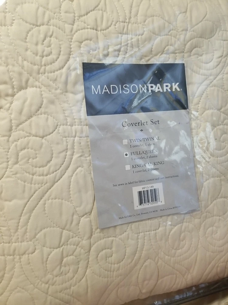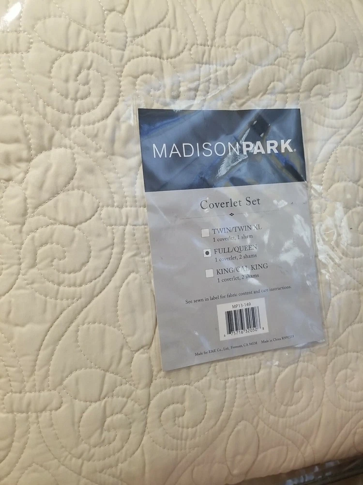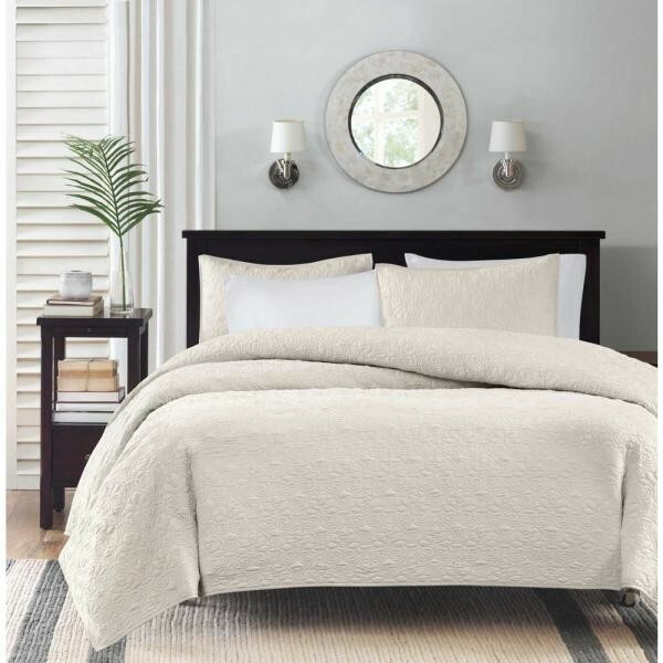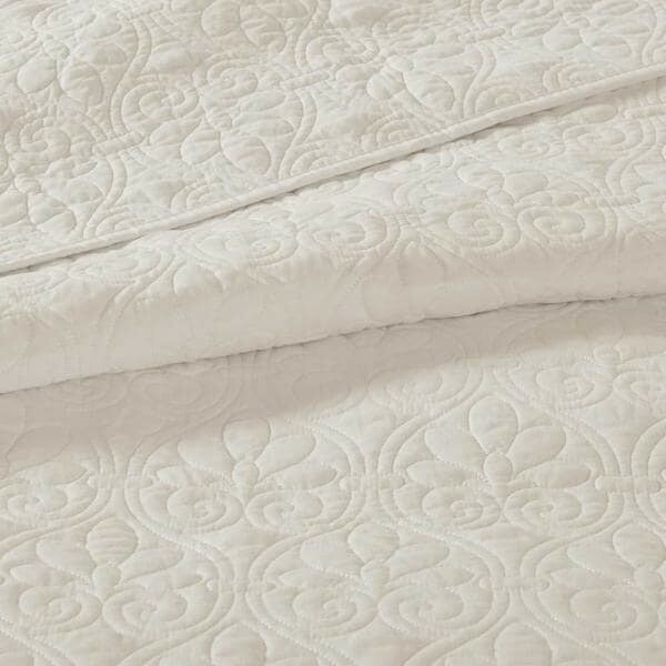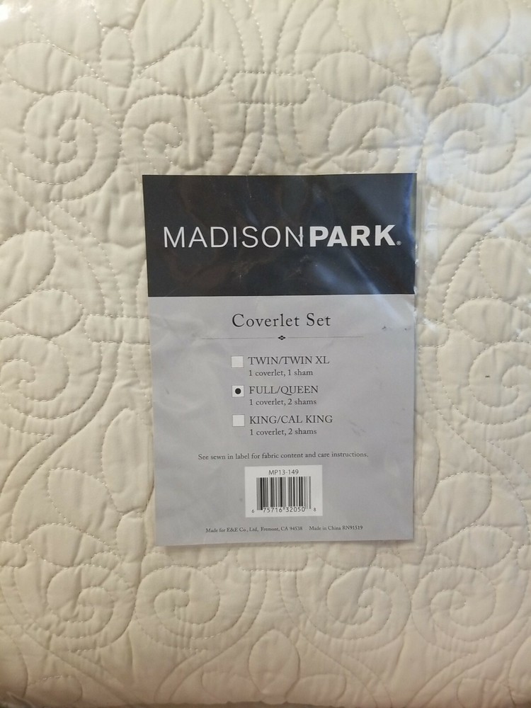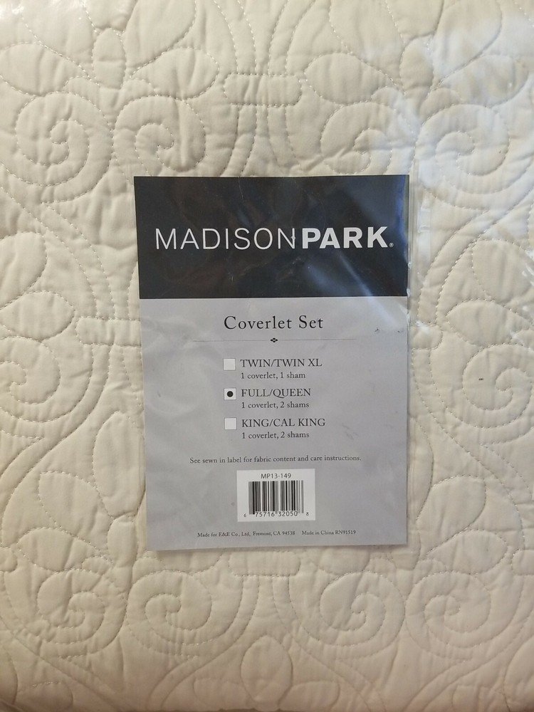 Madison Park Quebec Full/Queen Coverlet Mini Set in Ivory - Olliix MP13-149. Madison Park Quebec Full/Queen Coverlet Mini Set in Ivory - Olliix MP13-149 Quebec is the perfect coverlet to use as a layering piece or an alternative to your comforter for a new solid look. The classic stitch pattern pairs easily with your existing decor and will sure to add a new decorative element to your bedroom. The coverlet has 100% cotton fill and the face and the reverse of the coverlet are a super soft brushed fabric.