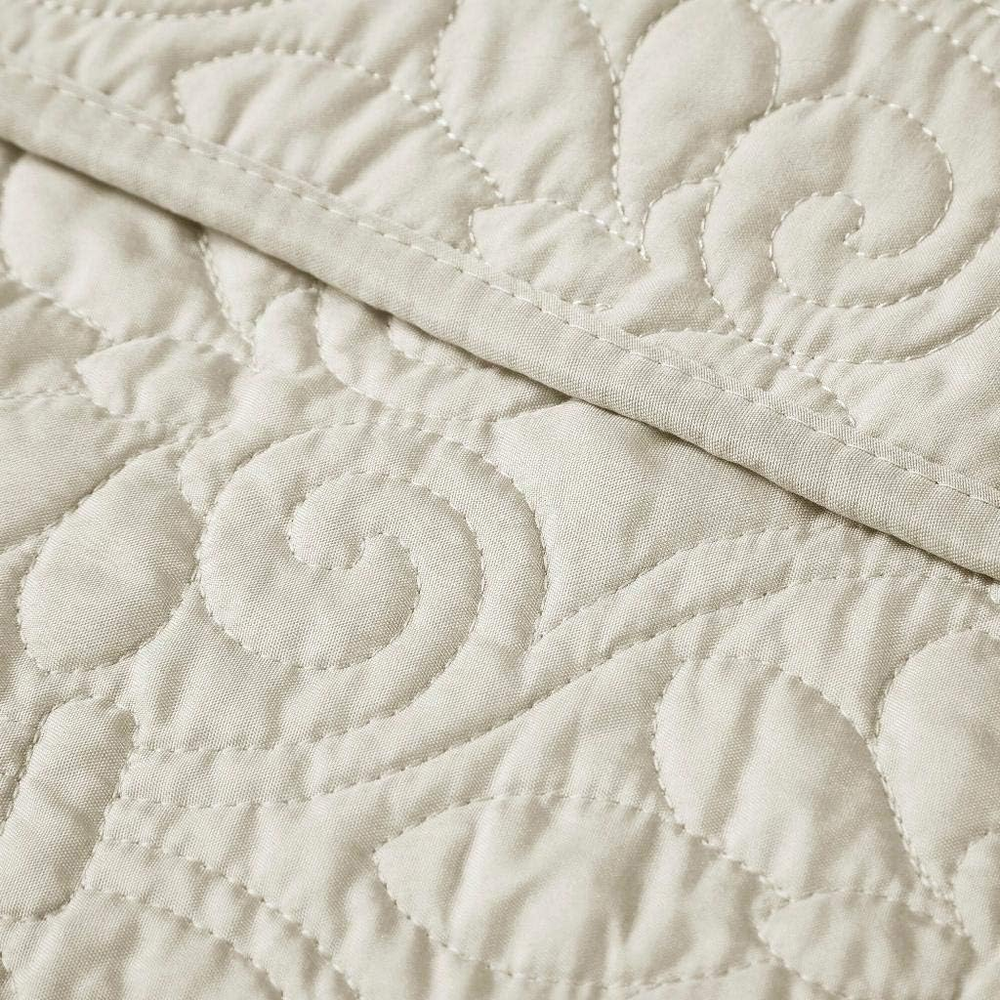 Madison Park Quebec Oversized Quilted Throw in Ivory Finish MP50-2985, 60"x70" 100% Microfiber Face & Reverse, Filling: 90% Cotton, 10% Olefin Quebec Damask Throw: Elevate your décor with a charming damask-elegance oversized throw, featuring embossed damask quilting. Oversized coverage for added comfort, it's perfect for a chic bedroom refresh Cotton Filling Quilt: Embrace the softness of pre-washed brushed microfiber and cotton-filling in this lofty and breathable, all-season quilted throw, perfect for cozy nighttime summer snuggles or as an extra layer of warmth and comfort in the winter season Quality Feel: Crafted with high-quality stitching and materials, this quilt set features elegant damask quilting and a piped border to help prevent clumping and enhance durability WHAT IS INSIDE? - 1 Oversized Summer Throw: 60"W x 70"L DURABLE & EASY CARE: Our microfiber quilted throw offers durability to withstand daily wear and tear. Simply machine wash cold. Gently and separately. Do not bleach, Tumble dry low. Iron on medium temperature if needed Quebec's classic stitch pattern pairs easily with your existing d & eacute; cor and adds a new decorative element to any room. The oversized quilted throw has 100% cotton fill and is soft to the touch.