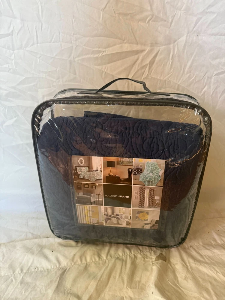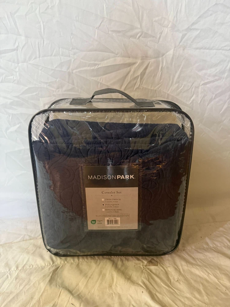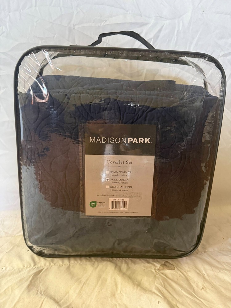 RETAIL PRICE $199.00 BEST PRICE GUARANTEED! Brand: Madison Park Size: Queen Color: Blue Material: Microfiber/ Cotton Condition: NEW WITH TAGS 100% Microfiber Face & Reverse, Filling: 90% Cotton, 10% Olefin Imported FEATURE Soft microfiber fabric in dusty navy, all over floral pattern quilting Set includes 1 coverlet, 2 shams Face fabric - 100% polyester, 90/10 cotton/other fiber filling for optimal comfort Measurement 90-by-90 inch coverlet, 20-by-26 inch standard sham Machine washable for easy care 100% Authentic Product
