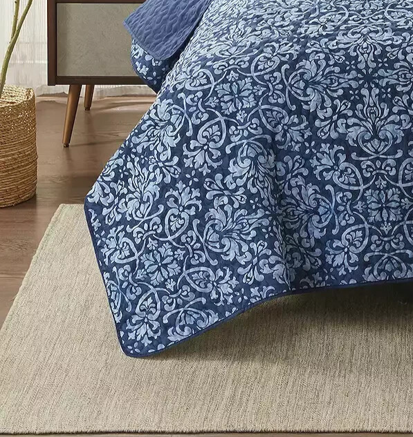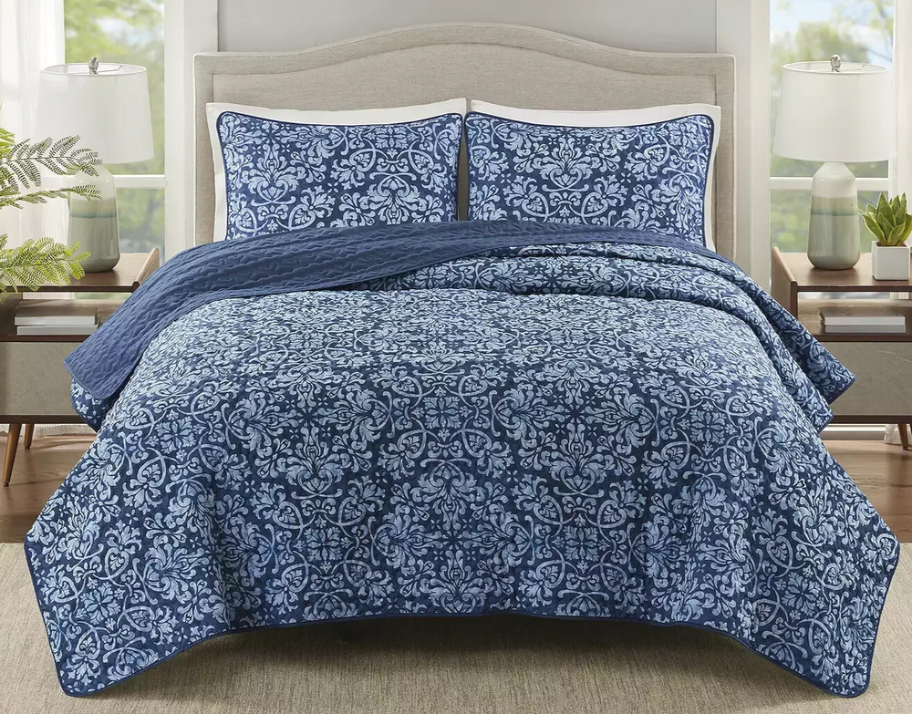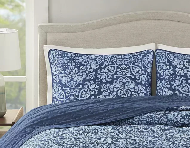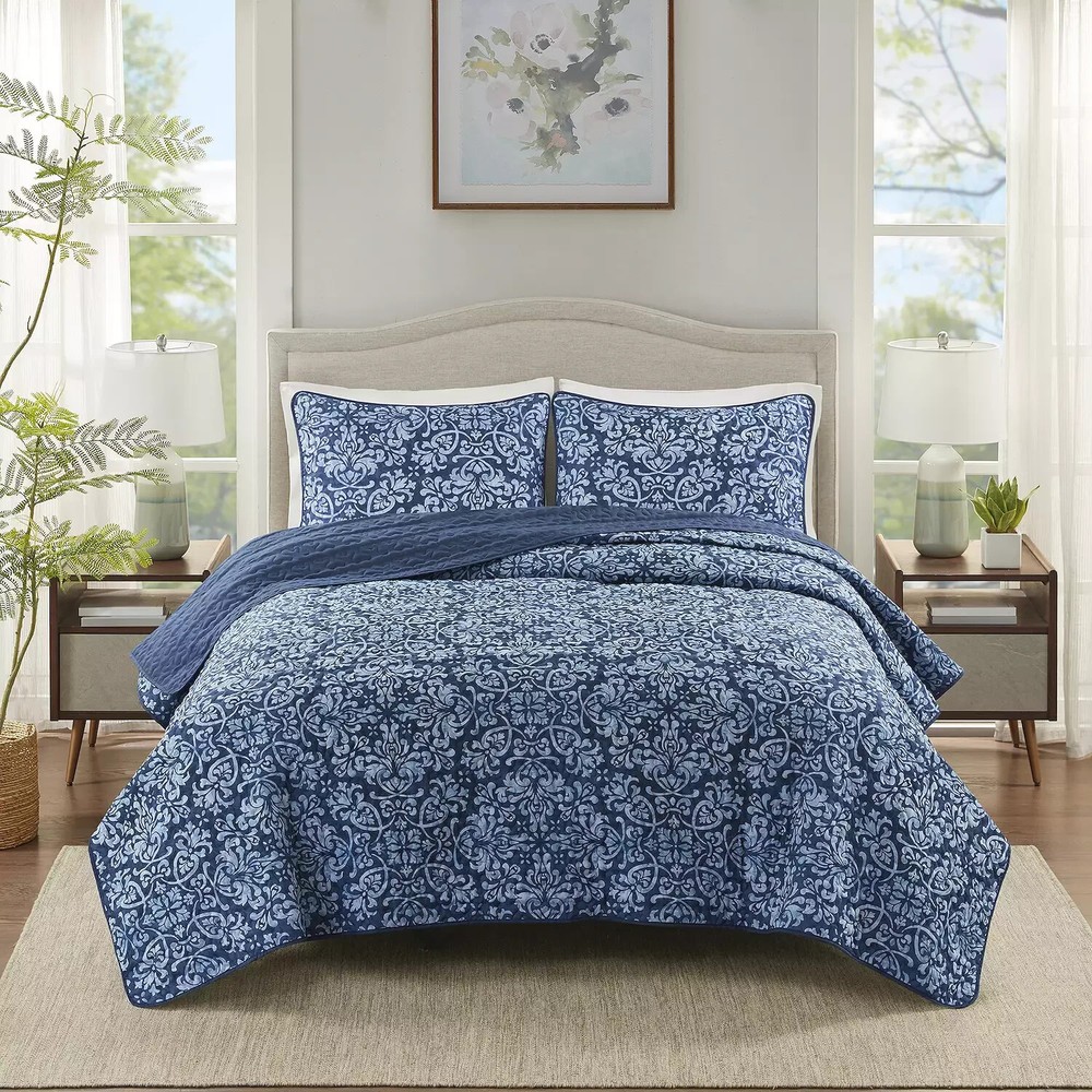 Madison Park Essentials Quilt Set in Navy Scroll Full/Queen quilt (90x95) and two standard size pillow shams (20x26) Printed pattern brings your bed to life and has a solid reverse Cozy soft microfiber. Certified non-toxic. Update your bedroom with the graceful style of the Madison Park Essentials quilt set