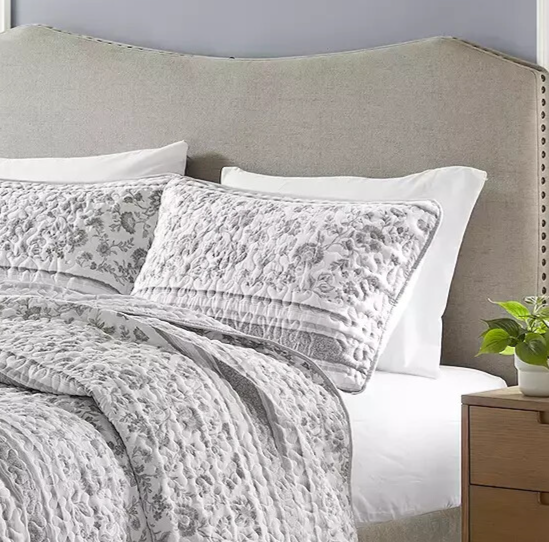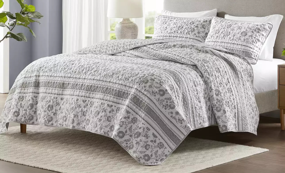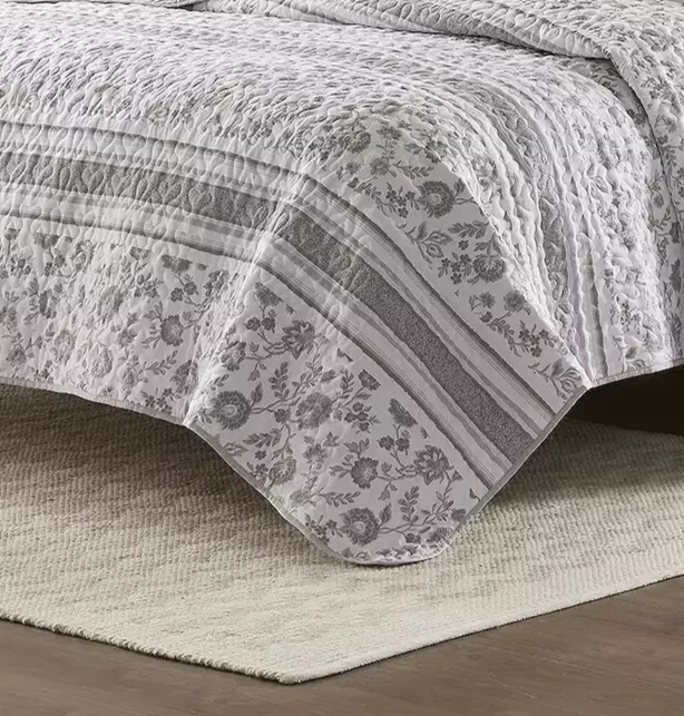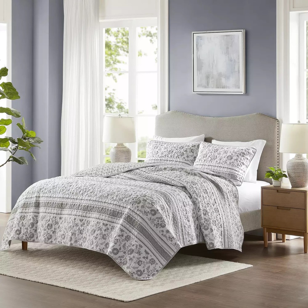 Madison Park Essentials Quilt Set in Gray Scrolling Vine Full/Queen quilt (90x95) and two standard size pillow shams (20x26) Printed pattern brings your bed to life and has a solid reverse Cozy soft microfiber. Certified non-toxic. Update your bedroom with the graceful style of the Madison Park Essentials quilt set