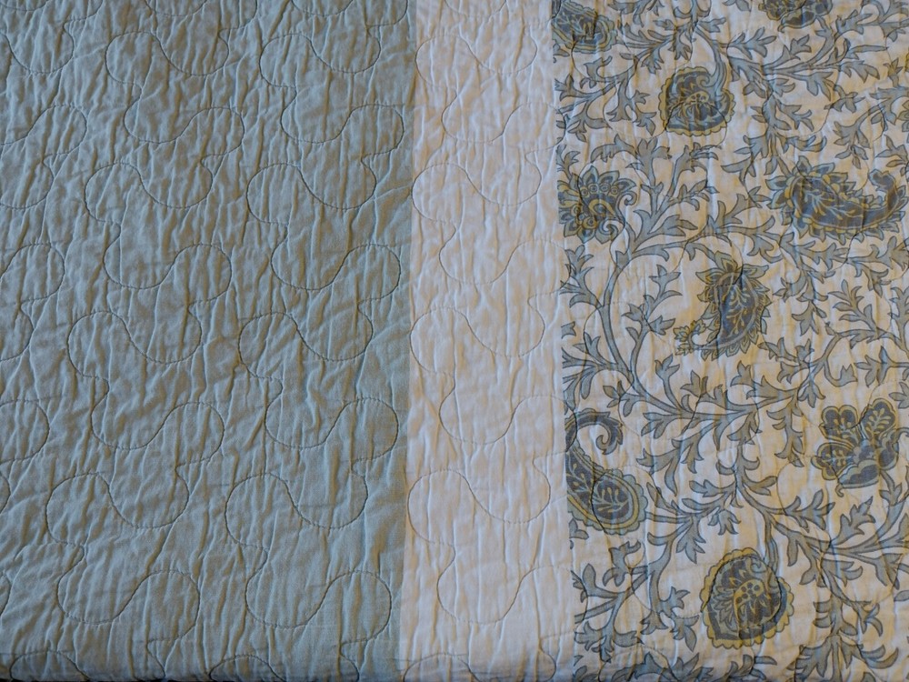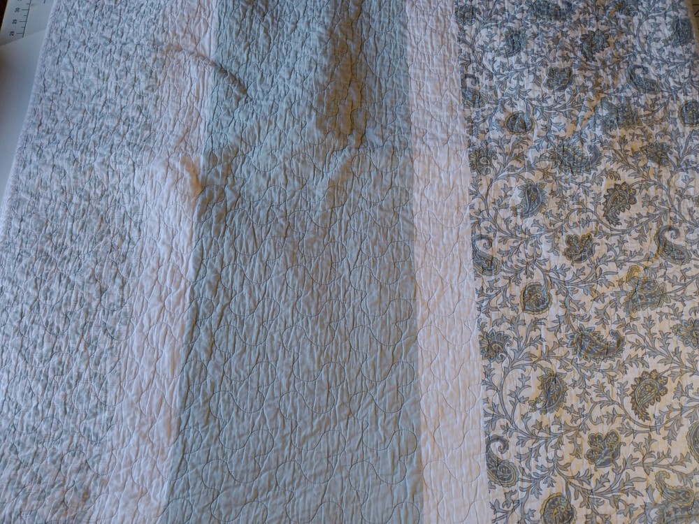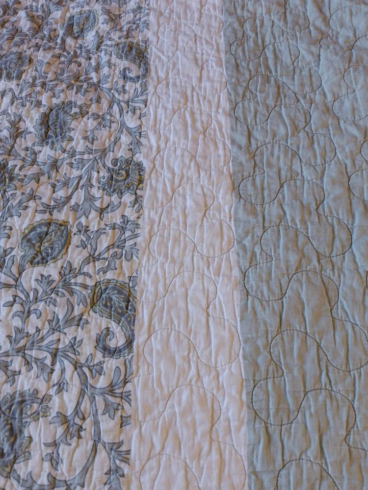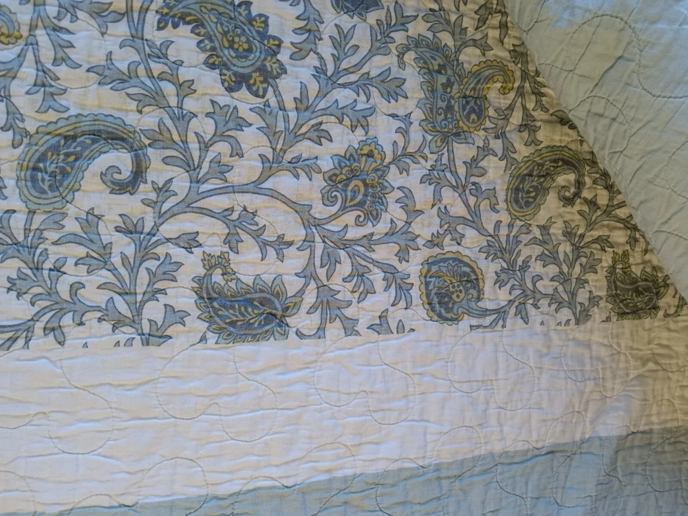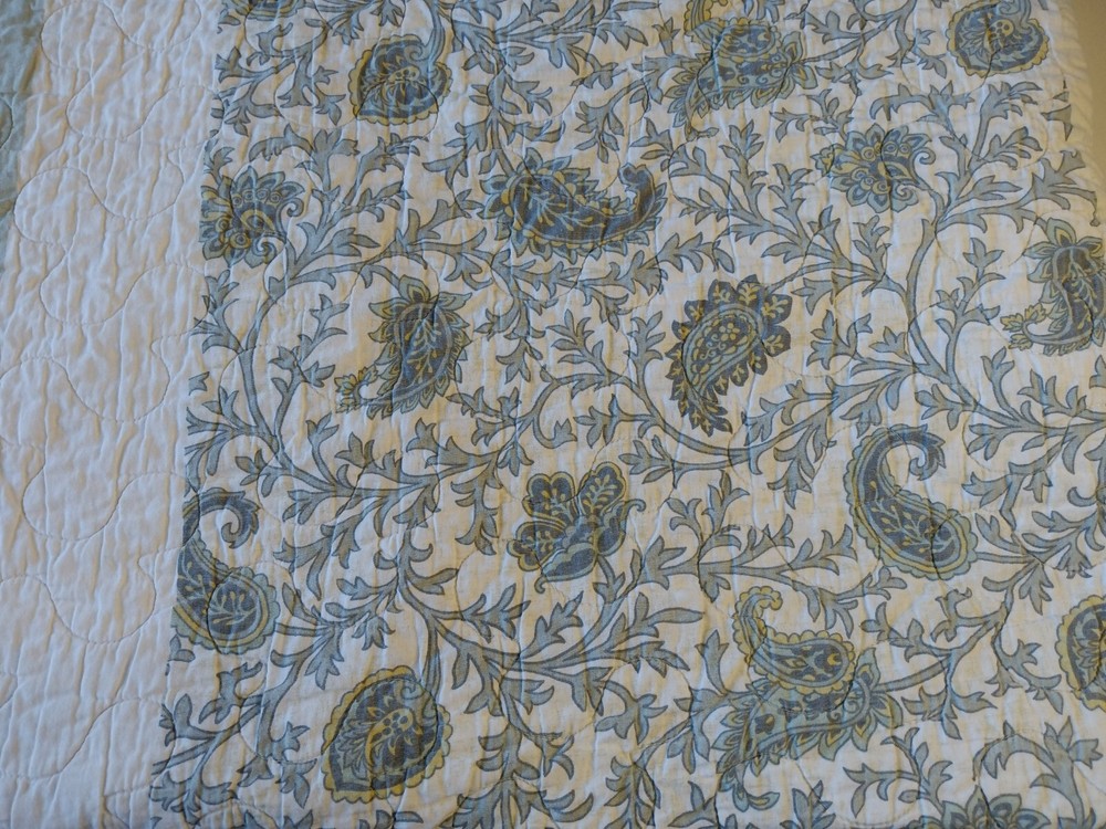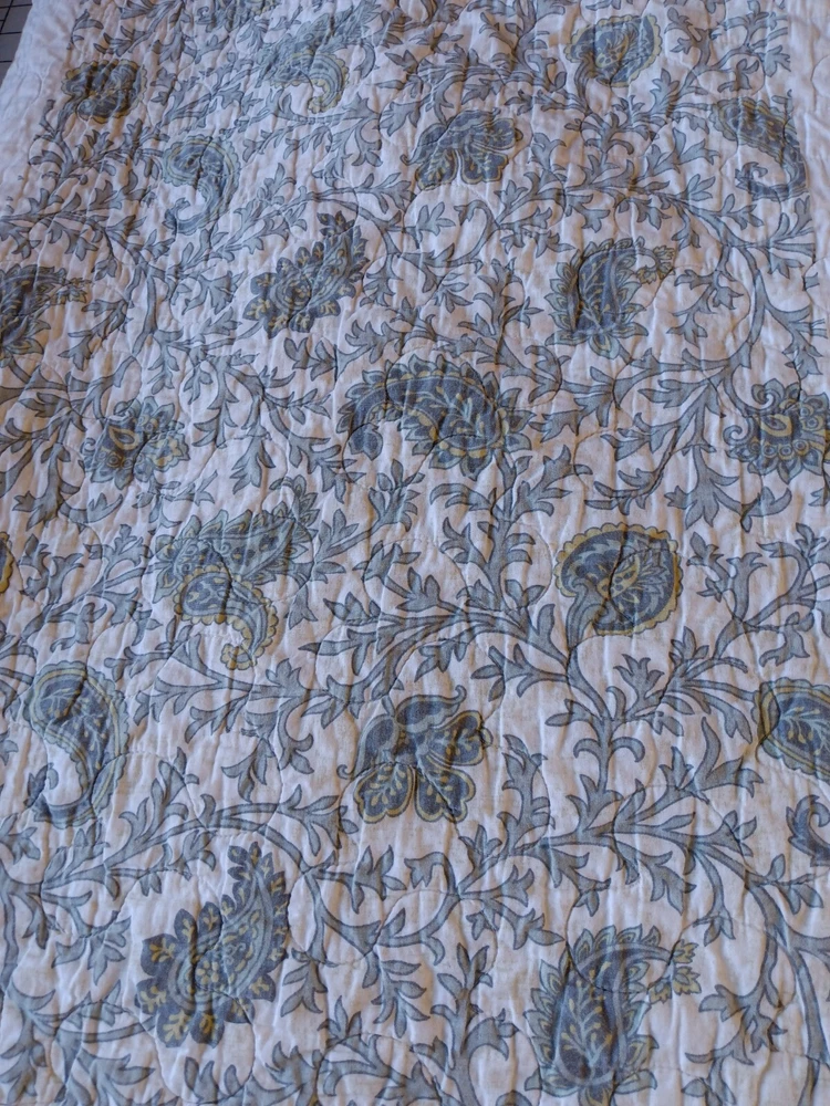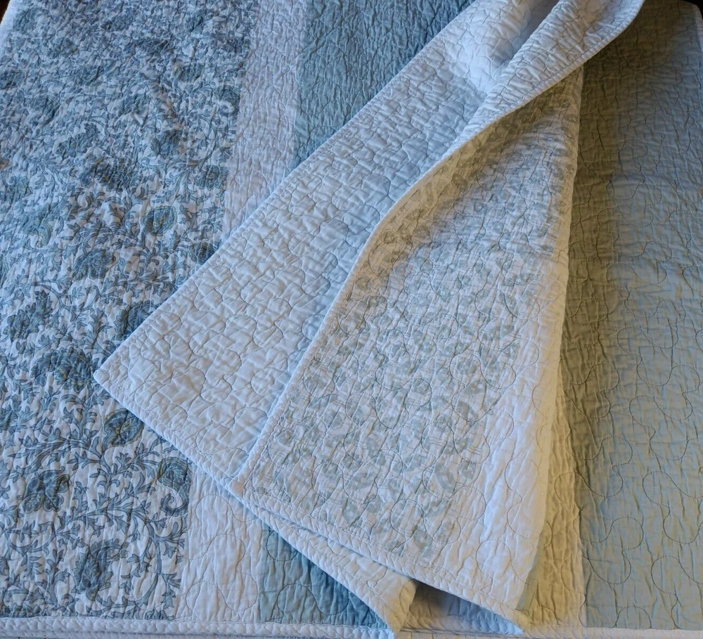 The Madison Park Quilted Blanket is a reversible cotton blanket featuring a country-inspired design in shades of blues, gray, and white. Measuring 88 x 86 inches, this rectangular blanket is suitable for adults and adds a touch of floral charm to any bedroom decor. With its all-season insulation, it is perfect for keeping you cozy and comfortable year-round. Easy to care for, this blanket can be machine washed to maintain its quality and style. Perfect for adding a cozy and stylish element to your bedding collection. In Good Condition. There is one small tear on this blanket. The tear has been repaired. Please see photos for more detail information. No Other Tears and No Stains found on this reversible blanket. The blanket is very nice quality and heavy. This blanket has been washed and ready for use.