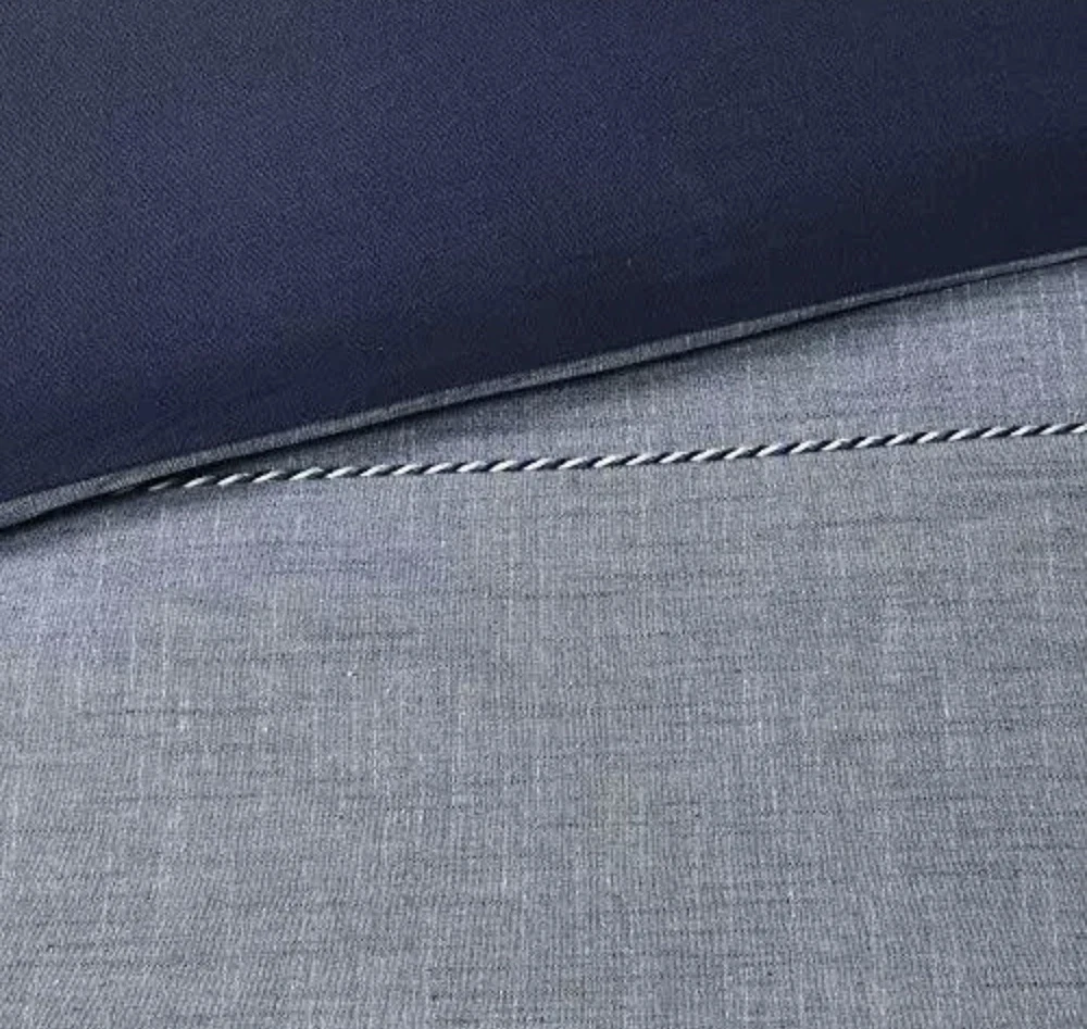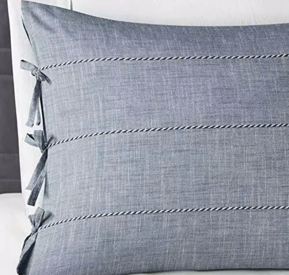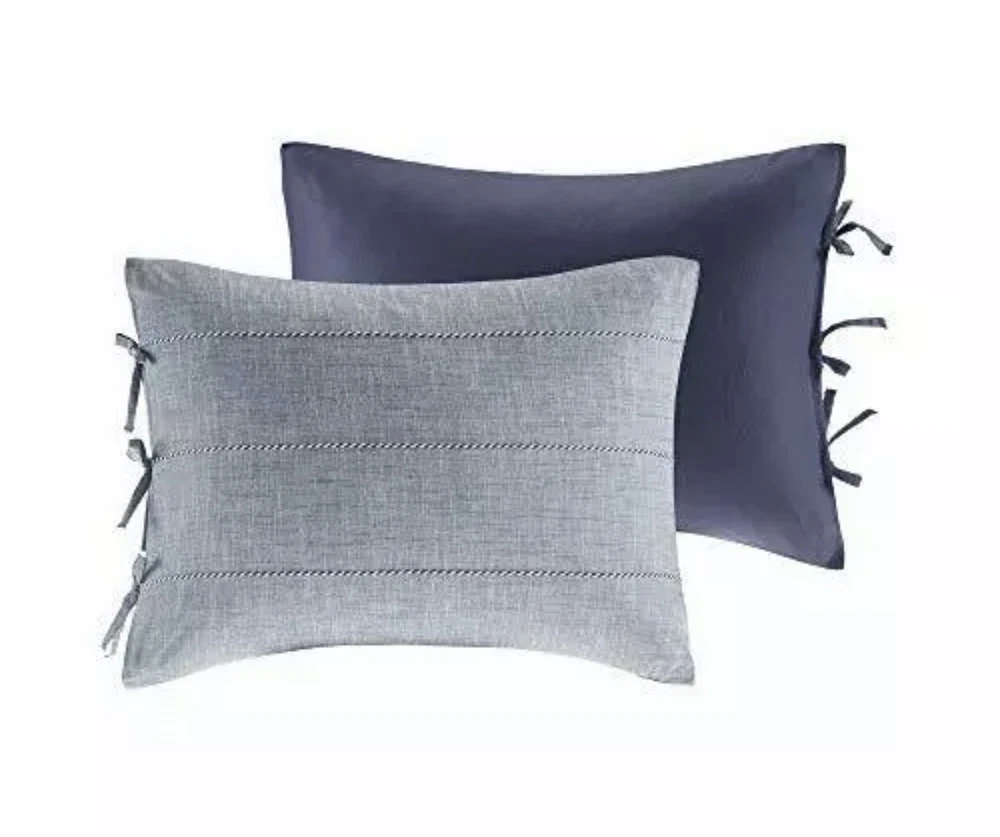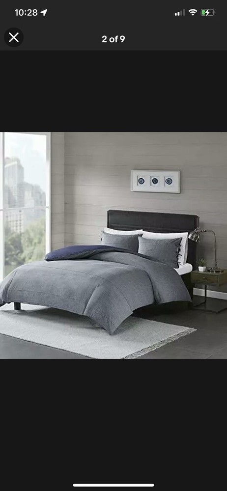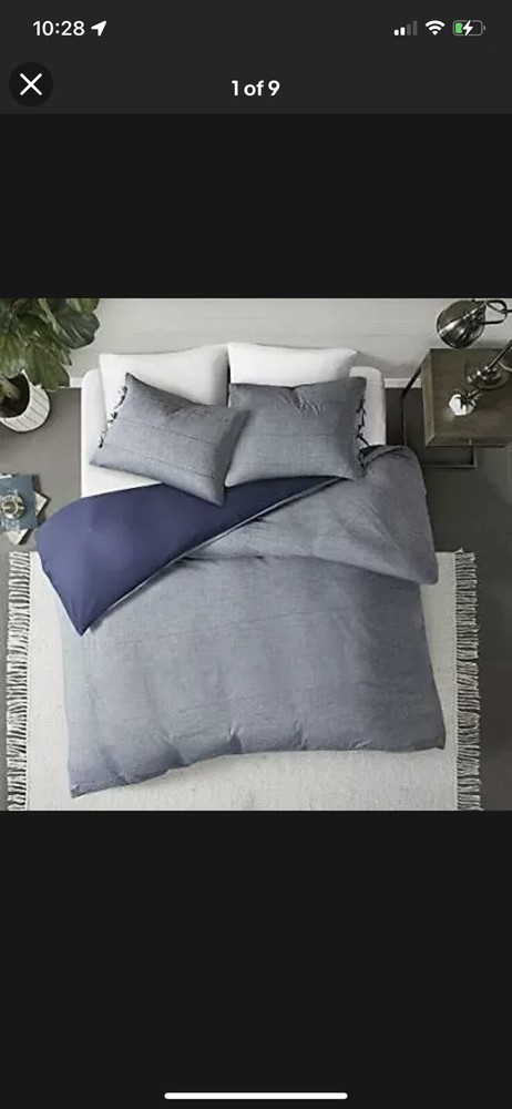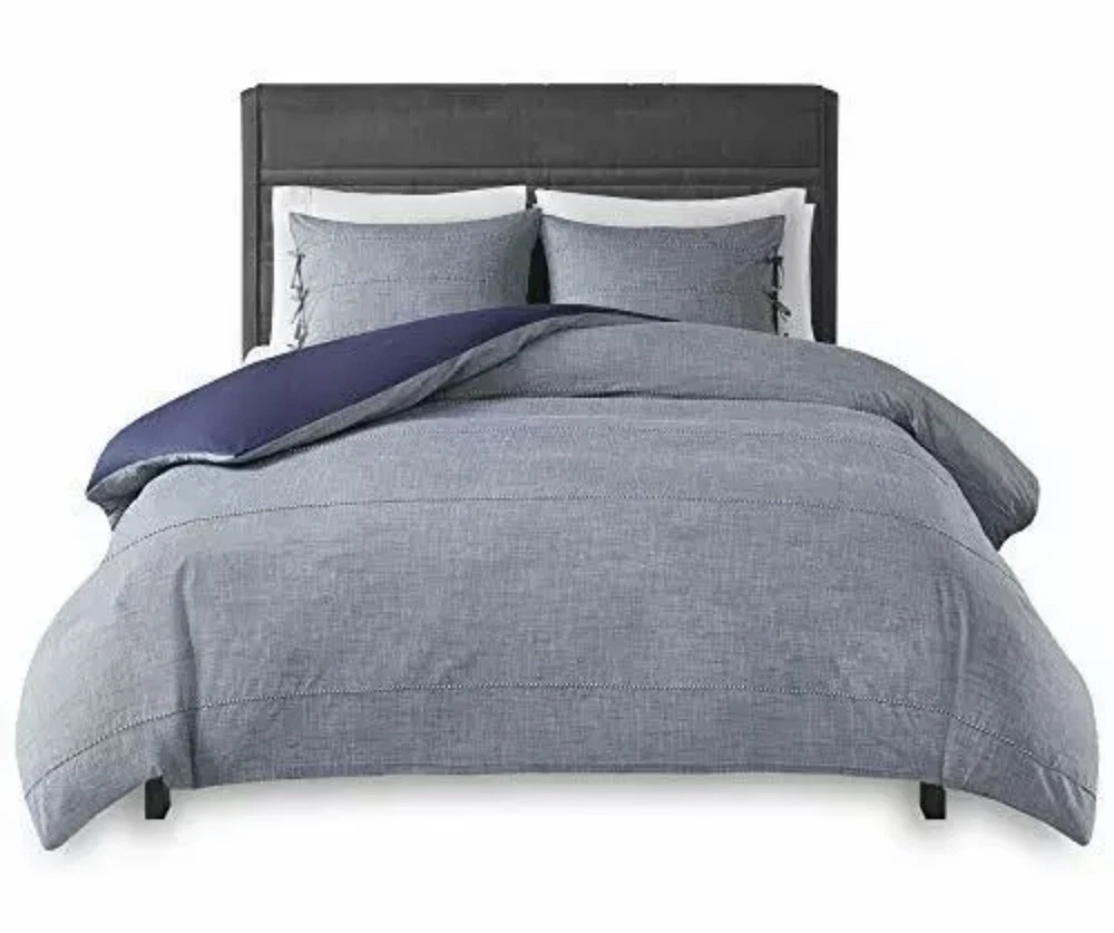 Madison Park Raven 3 Piece Cotton Yarn Dye Duvet Cover Bedding Set Full/Queen. Madison Park Raven 3 Piece Cotton Yarn Dye Duvet Cover Bedding Set, Full/Queen Size, Denim Blue The Madison Park Raven 3 Piece Cotton Yarn Dye Duvet Cover Set brings a casual look and feel to your bedroom. Made from 100% cotton yarn-dye fabric, the comforter and shams imitate a denim look accented by white cord detailing for a contemporary appeal. A solid blue reverse provides a rich touch of color, while the button closures allow you to place a comforter insert within the duvet cover and the internal corner ties prevent it from shifting. The two shams feature tie closures that add charm and functionality, completing the bedding set. Simple and clean-cut, this cotton duvet cover set offers a handsome update to your bedroom decor. FEATURES - The Yarn Dye Duvet Cover Set brings a casual look and feel to your bedroom. The comforter and shams imitate a denim look accented by cord detailing for a contemporary appeal. PACKAGE INCLUDES - 1 Duvet Cover, 2 Standard Shams MEASUREMENT - 1 Duvet Cover - 90(W) inches x 90(L) inches, 2 Standard Shams - 20(W) inches x 26(L) inches each MATERIAL DETAIL - Duvet/Sham: 100% cotton yarn dye face with cording, tie closure sham; cotton/polyester reverse EASY CARE - Machine wash cold on gentle cycle, tumble dry on low heat, do not bleach