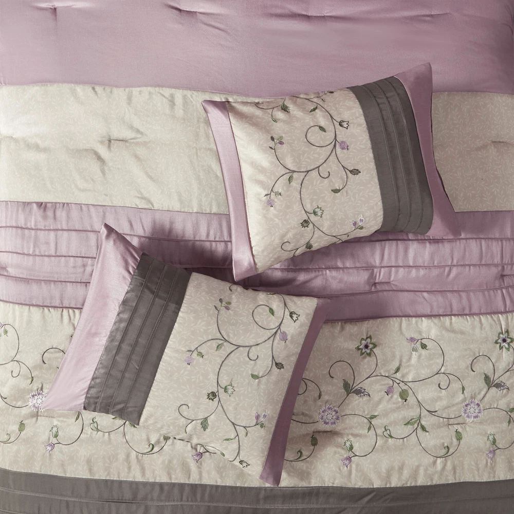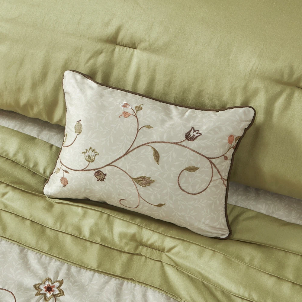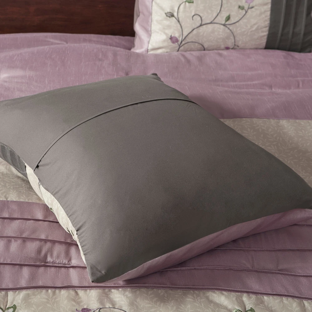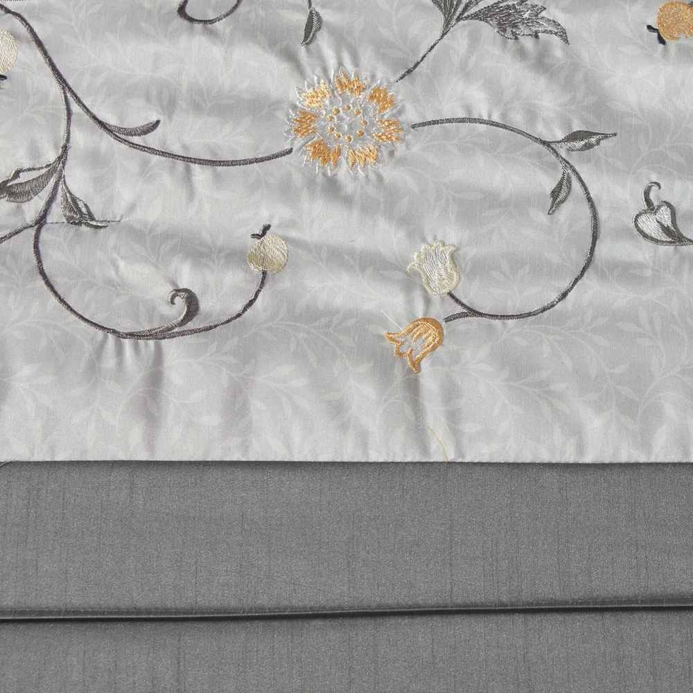 Store Categories Store Categories Bedding Comforters Decorative Pillows Duvet Covers Quilts & Coverlets Sheets Blankets & Throws Mattress Pads Pillows Home Decor Window Treatments Wall Art Home Accents Furniture Beds Dining Seating Ottomans & Benches Accent Chairs Accent Tables Dining Tables Sofas Bath Bath Robes Shower Curtains Towels Bath Rugs Bath Accessories Apparel Pajama Sets Nightgowns Rugs Rugs & Carpets Lighting Lamp Pendant Other Product Overview Details DESCRIPTION Elegantly update your bedroom with the Madison Park Serene 7 Piece Comforter Set. A beautifully embroidered floral pattern is showcased on the faux silk comforter. The pieced design, in yellow and grey hues, adds a lovely contrast and texture to the ensemble. The solid dark grey reverse complements the enticing design seen on the top of the comforter and continues gracefully down to the bed skirt. Matching shams bring the unique style of the comforter to the head of the bed, giving it a truly luxurious look. Three decorative pillows with intricate embroidery, pleating, and piecing, complete this exquisite comforter set. Items in the set may come in a rolled or compressed packaging, which will need to be fluffed up or steam ironed before use to remove wrinkles. FEATURES • Elegant transitional style 7 piece comforter set • Piecing and embroidery details on top of comforter • Made from 100% polyester polyoni, the fabric produce a shine • Set includes 1 comforter, 2 matching shams, 3 decorative pillows and 1 bed skirt • Hypoallergenic polyester filling in the comforter and decorative pillows • Machine washable and steam iron for wrinkle removal • Items in this set may come in rolled or compressed packaging and will need to be fluffed up MATERIAL Polyester faux silk, embroidered, pieced, 8oz/sq yard polyester filling, faux silk bedskirt and pillows; Available Sizes: Queen Comforter Set includes: 1 Comforter: 90"W x 90"L 2 Standard Shams: 20"W x 26"L 1 Bedskirt: 60"W x 80"L + 15"D 1 Decorative Pillow: 18"W x 18"L 1 Decorative Pillow: 12"W x 18"L 1 Decorative Pillow: 12"W x 16"L King Comforter Set includes: 1 Comforter: 104"W x 92"L 2 King Shams: 20"W x 36"L 1 Bedskirt: 78"W x 80"L + 15"D 1 Decorative Pillow: 12"W x 16"L 1 Decorative Pillow: 12"W x 18"L 1 Decorative Pillow: 18"W x 18"L California King Comforter Set includes: 1 Comforter: 104"W x 92"L 2 King Shams: 20"W x 36"L 1 Bedskirt: 72"W x 84"L + 15"D 1 Decorative Pillow: 12"W x 16"L 1 Decorative Pillow: 12"W x 18"L 1 Decorative Pillow: 18"W x 18"L Bedding Comforters Decorative Pillows Duvet Covers Quilts & Coverlets Sheets Blankets & Throws Mattress Pads Pillows Home Decor Window Treatments Wall Art Home Accents Furniture Beds Dining Seating Ottomans & Benches Accent Chairs Accent Tables Dining Tables Sofas Bath Bath Robes Shower Curtains Towels Bath Rugs Bath Accessories Rugs Rugs & Carpets Lighting Lamp Pendant Product Overview Product Details DESCRIPTION Elegantly update your bedroom with the Madison Park Serene 7 Piece Comforter Set. A beautifully embroidered floral pattern is showcased on the faux silk comforter. The pieced design, in yellow and grey hues, adds a lovely contrast and texture to the ensemble. The solid dark grey reverse complements the enticing design seen on the top of the comforter and continues gracefully down to the bed skirt. Matching shams bring the unique style of the comforter to the head of the bed, giving it a truly luxurious look. Three decorative pillows with intricate embroidery, pleating, and piecing, complete this exquisite comforter set. Items in the set may come in a rolled or compressed packaging, which will need to be fluffed up or steam ironed before use to remove wrinkles. FEATURES • Elegant transitional style 7 piece comforter set • Piecing and embroidery details on top of comforter • Made from 100% polyester polyoni, the fabric produce a shine • Set includes 1 comforter, 2 matching shams, 3 decorative pillows and 1 bed skirt • Hypoallergenic polyester filling in the comforter and decorative pillows • Machine washable and steam iron for wrinkle removal • Items in this set may come in rolled or compressed packaging and will need to be fluffed up MATERIAL Polyester faux silk, embroidered, pieced, 8oz/sq yard polyester filling, faux silk bedskirt and pillows; Available Sizes: Queen Comforter Set includes: 1 Comforter: 90"W x 90"L 2 Standard Shams: 20"W x 26"L 1 Bedskirt: 60"W x 80"L + 15"D 1 Decorative Pillow: 18"W x 18"L 1 Decorative Pillow: 12"W x 18"L 1 Decorative Pillow: 12"W x 16"L King Comforter Set includes: 1 Comforter: 104"W x 92"L 2 King Shams: 20"W x 36"L 1 Bedskirt: 78"W x 80"L + 15"D 1 Decorative Pillow: 12"W x 16"L 1 Decorative Pillow: 12"W x 18"L 1 Decorative Pillow: 18"W x 18"L California King Comforter Set includes: 1 Comforter: 104"W x 92"L 2 King Shams: 20"W x 36"L 1 Bedskirt: 72"W x 84"L + 15"D 1 Decorative Pillow: 12"W x 16"L 1 Decorative Pillow: 12"W x 18"L 1 Decorative Pillow: 18"W x 18"L