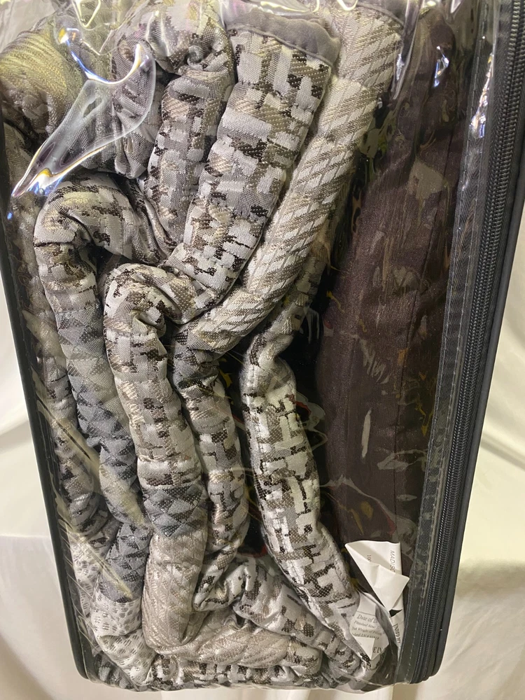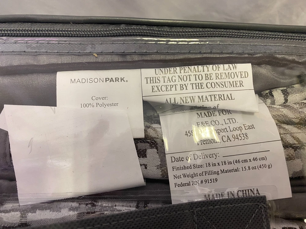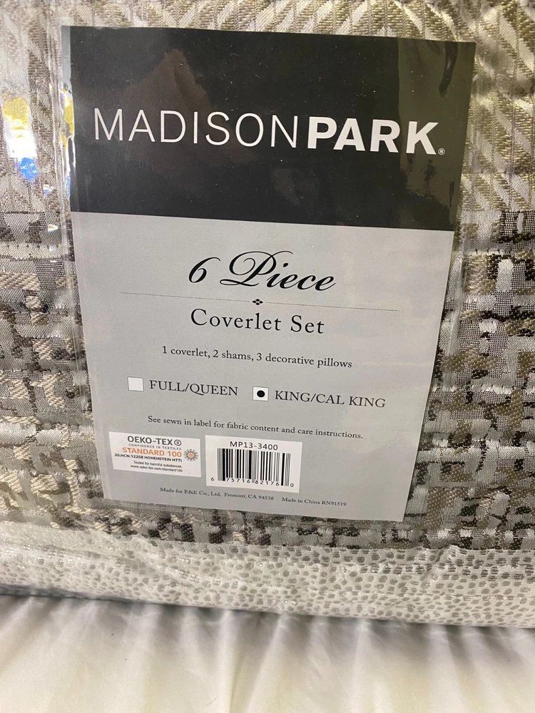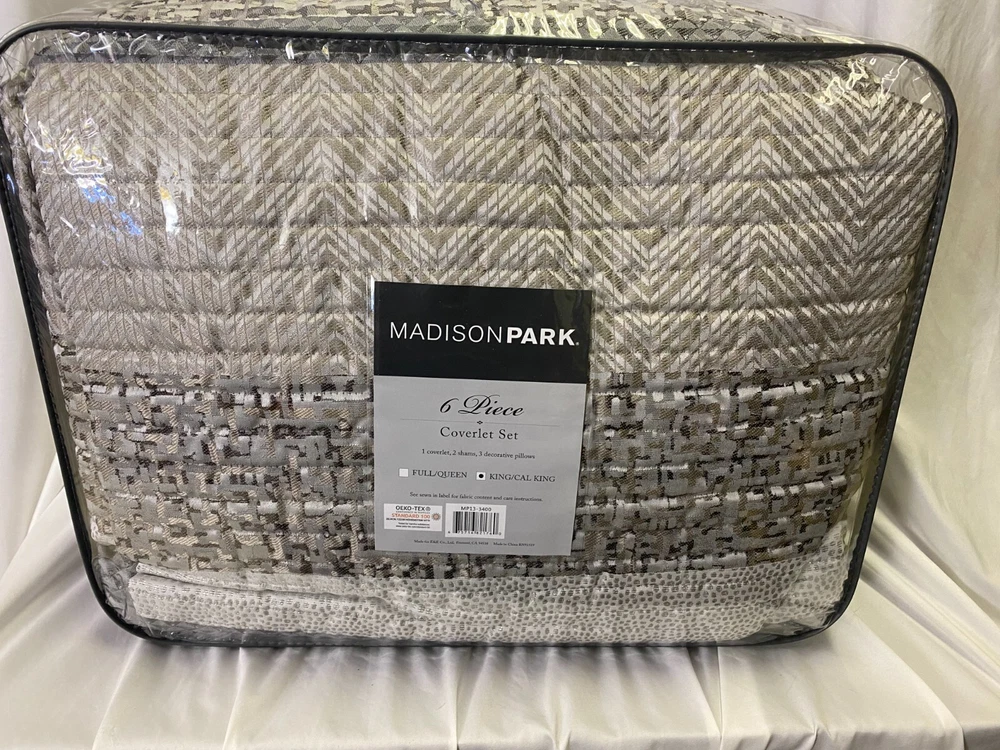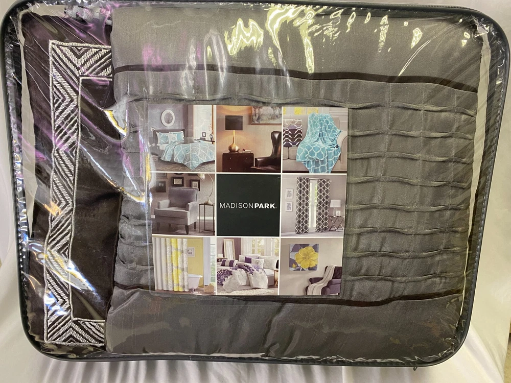 Give your bedroom a new luxurious look with the Madison Park Rhapsody 6 Piece Reversible Jacquard Quilt Set. This reversible quilt features a navy and grey stripe design of several different motifs on the face with a solid grey reverse, for a chic transitional look. The 2 matching shams complement the design of the quilt to complete this glam comforter set. Also included are 3 decorative pillows with embroidery and pleated details that provide the finishing touches. Machine washable for easy care, this jacquard quilt set brings a sophisticated update to your bedroom that’s perfect for summer use or as an extra layer of warmth in the winter. FEATURES • Luxurious and transitional style reversible jacquard 6 piece quilt set • Embroidery and pleated details on decorative pillows • Quilted with hypoallergenic polyester filling • Perfect for summer use or layer it on the bedding for extra warmth • Set includes quilt, 2 matching shams and 3 decorative pillows • Machine washable for easy care MATERIAL Quilt/Sham: 100% Polyester Jacquard face, brushed Polyester reverse; Filling: 90% cotton, 10% other fibers; Prewashed Pillows: 100% Polyester shell and filling Sellers Notes: Bed Bath & Beyond Store Closing Merchandise. COVID was hard on retailers. It is always sad to see great stores close their doors forever. We bought truckloads of store closing stock. This particular one comes from Indiana. Coverlet set is new, unopened, and unreturned store stock. A new Madison Park ® Coverlet Set for an amazing price - delivered to your door. Sleep well! (3a)