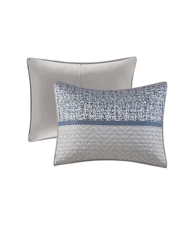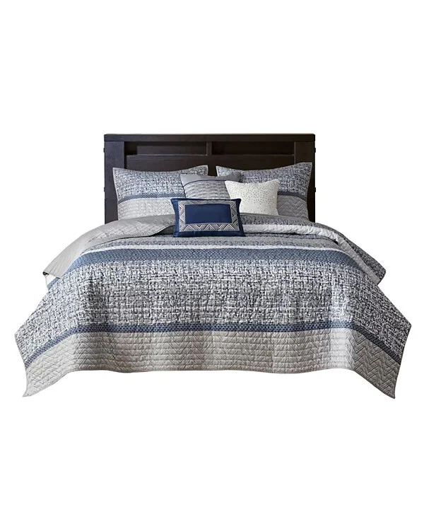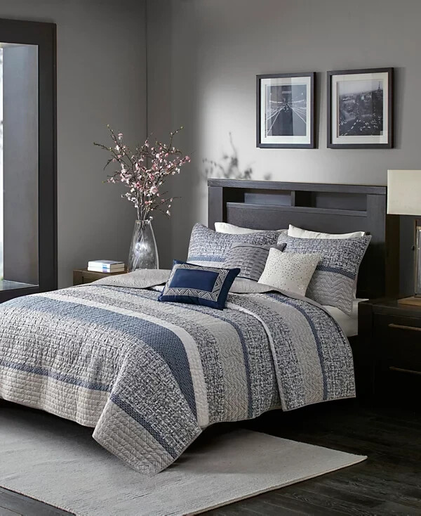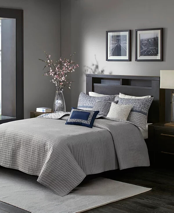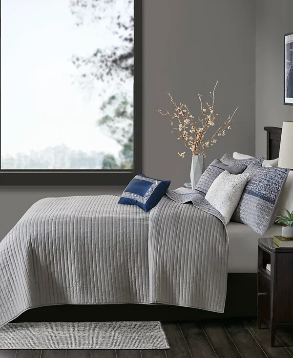 Add textured style to your room with the Rhapsody coverlet set from Madison Park, featuring jacquard stripes that reverse to brushed fabric on the coverlet and shams amidst varying tones of gray. Product Features: Set includes: coverlet (104" x 94"), two king shams (20" x 36") and three decorative pillows (18" x 18", 16" x 16", 12" x 18") Jacquard weave Colors: gray ground Coverlet/sham/pillow: polyester; coverlet fill: cotton/polyester/other 240 grams per square meter; pillow fill: polyester Machine washable. Spot clean pillows. Imported Please feel free to contact me with any que stions. I would rather provide you with more information now than have you be disappointed when your item arrives. (Smoke Free storage/environment.) Returns are only allowed on items that are not as described or damaged. This is how I am able to keep my prices low and offer free shipping. Please be sure that you genuinely want the item before purchasing.