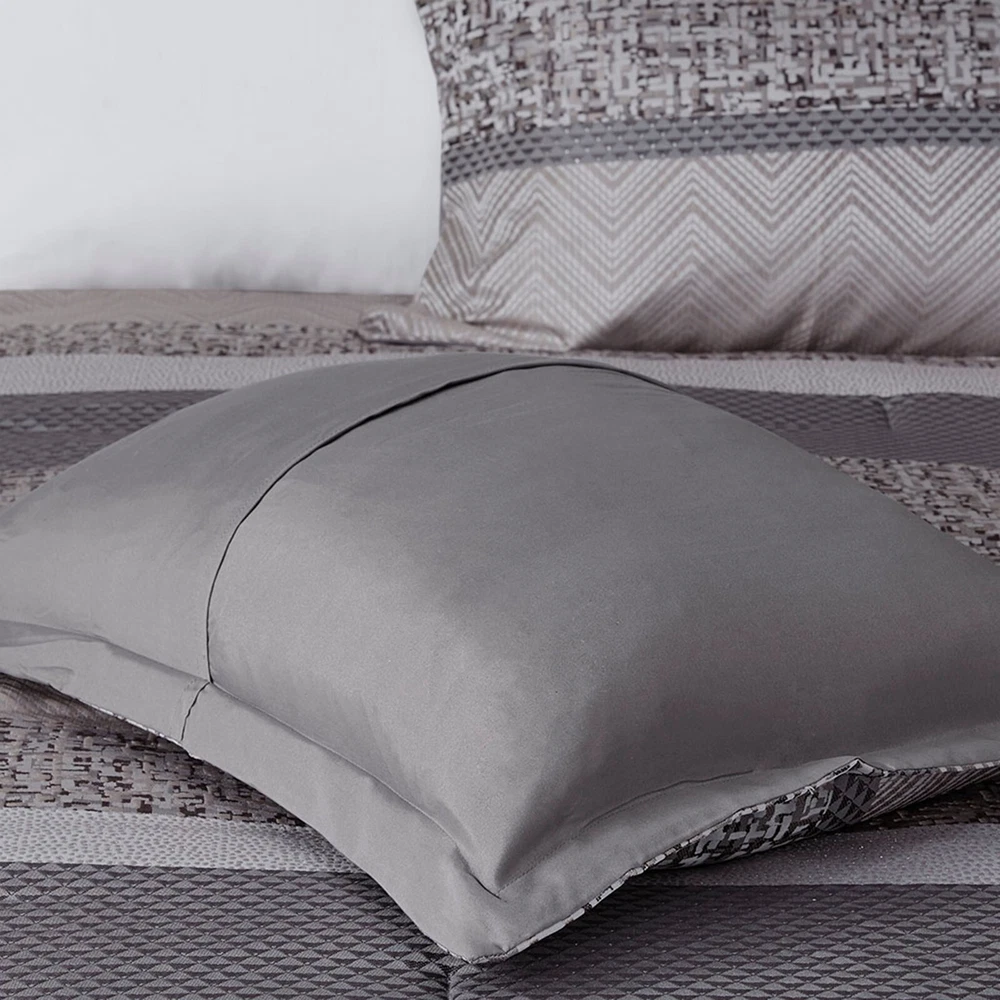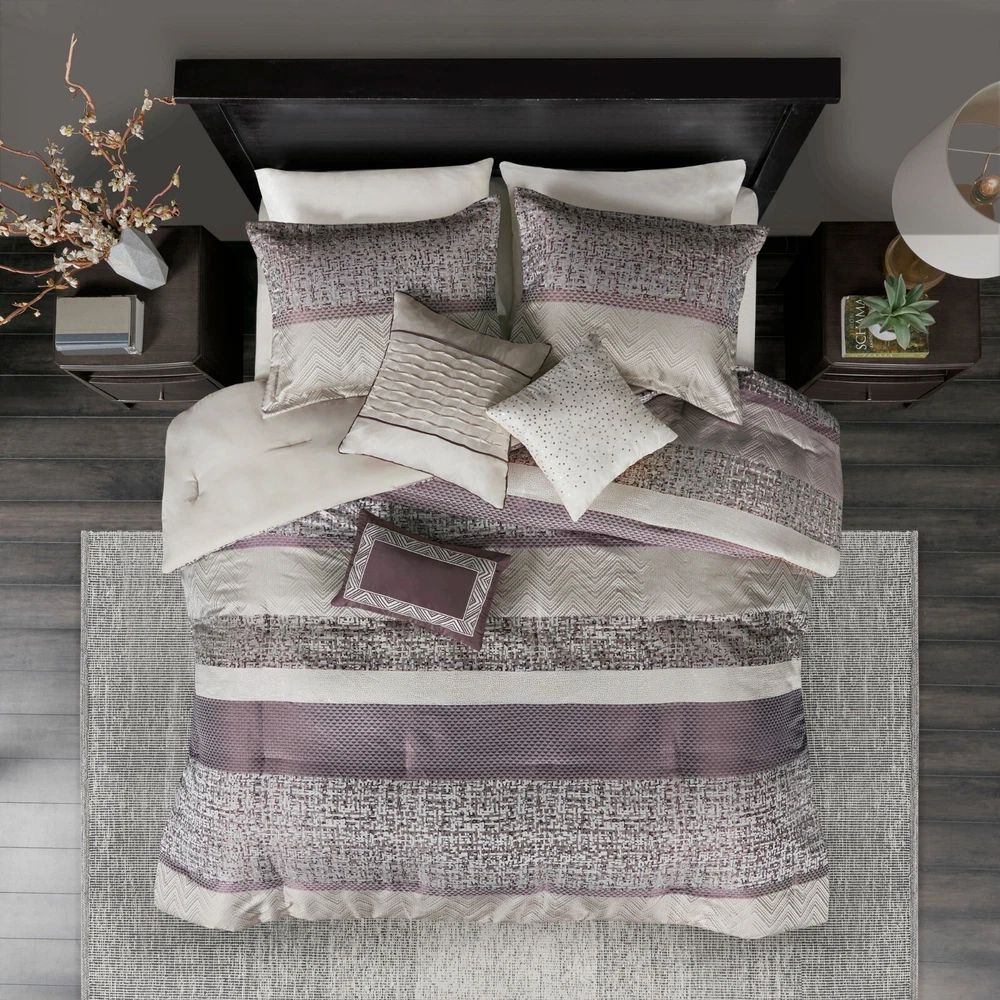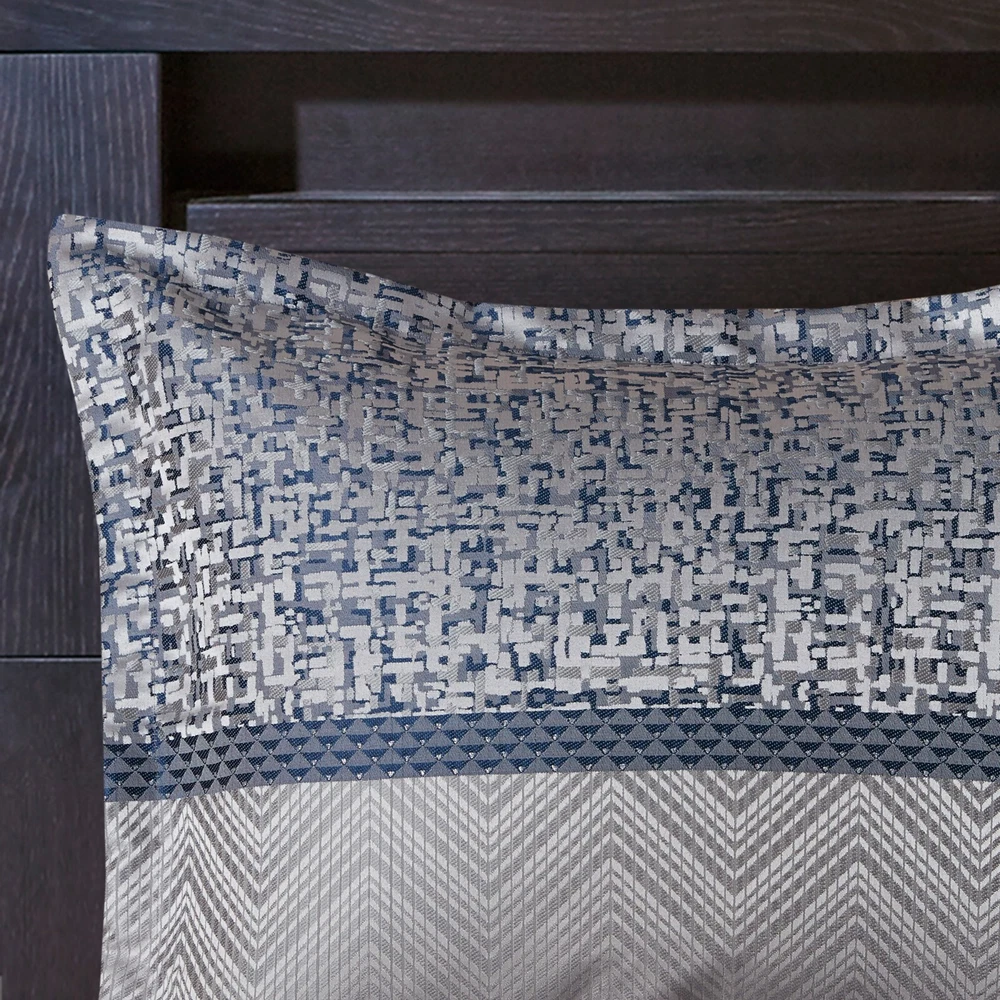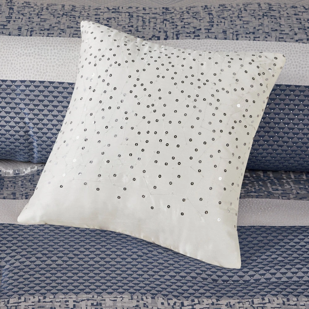 Store Categories Store Categories Bedding Comforters Decorative Pillows Duvet Covers Quilts & Coverlets Sheets Blankets & Throws Mattress Pads Pillows Home Decor Window Treatments Wall Art Home Accents Furniture Beds Dining Seating Ottomans & Benches Accent Chairs Accent Tables Dining Tables Sofas Bath Bath Robes Shower Curtains Towels Bath Rugs Bath Accessories Apparel Pajama Sets Nightgowns Rugs Rugs & Carpets Lighting Lamp Pendant Other Product Overview Details DESCRIPTION Give your bedroom a new luxurious look with the Madison Park Rhapsody 7 Piece Jacquard Comforter Set. This jacquard comforter features a navy and grey stripe design of several different motifs on the face with a solid grey reverse, for a chic transitional look. The 2 matching shams complement the design of the comforter to complete this glam comforter set. Also included is a solid navy bed skirt and 3 decorative pillows with embroidery and pleated details provide the finishing touches. Machine washable for easy care, this jacquard comforter set brings a sophisticated update to your bedroom decor. Items in the set may come in a rolled or compressed packaging, which will need to be fluffed up or steam ironed before use to remove wrinkles. FEATURES • Luxurious and transitional style jacquard 7 piece comforter set • Polyester jacquard and stripe design on top of comforter • Embroidery and pleated details on decorative pillows • Set includes comforter, 2 matching shams, 3 decorative pillows and 1 bed skirt • Machine washable and steam iron for wrinkle removal • Items in this set may come in rolled or compressed packaging and will need to be fluffed up MATERIAL Poly jacqaurd, soft microfiber solid reverse comforter and shams, 8oz/sq yard polyester filling, polyester bedskirt and pillows Available Sizes: Queen Comforter Set includes: 1 Comforter: 90"W x 90"L 2 Standard Shams: 20"W x 26"L + 1.5"D 1 Bed Skirt: 60"W x 80"L + 15"D 1 Decorative Pillow: 16"W x 16"L 1 Decorative Pillow: 12"W x 18"L 1 Decorative Pillow: 18"W x 18"L King Comforter Set includes: 1 Comforter: 104"W x 92"L 2 King Shams: 20"W x 36"L + 1.5"D 1 Bed Skirt: 78"W x 80"L + 15"D 1 Decorative Pillow: 16"W x 16"L 1 Decorative Pillow: 12"W x 18"L 1 Decorative Pillow: 18"W x 18"L California King Comforter Set includes: 1 Comforter: 104"W x 92"L 2 King Shams: 20"W x 36"L + 1.5"D 1 Bed Skirt: 72"W x 84"L + 15"D 1 Decorative Pillow: 16"W x 16"L 1 Decorative Pillow: 12"W x 18"L 1 Decorative Pillow: 18"W x 18"L Bedding Comforters Decorative Pillows Duvet Covers Quilts & Coverlets Sheets Blankets & Throws Mattress Pads Pillows Home Decor Window Treatments Wall Art Home Accents Furniture Beds Dining Seating Ottomans & Benches Accent Chairs Accent Tables Dining Tables Sofas Bath Bath Robes Shower Curtains Towels Bath Rugs Bath Accessories Rugs Rugs & Carpets Lighting Lamp Pendant Product Overview Product Details DESCRIPTION Give your bedroom a new luxurious look with the Madison Park Rhapsody 7 Piece Jacquard Comforter Set. This jacquard comforter features a navy and grey stripe design of several different motifs on the face with a solid grey reverse, for a chic transitional look. The 2 matching shams complement the design of the comforter to complete this glam comforter set. Also included is a solid navy bed skirt and 3 decorative pillows with embroidery and pleated details provide the finishing touches. Machine washable for easy care, this jacquard comforter set brings a sophisticated update to your bedroom decor. Items in the set may come in a rolled or compressed packaging, which will need to be fluffed up or steam ironed before use to remove wrinkles. FEATURES • Luxurious and transitional style jacquard 7 piece comforter set • Polyester jacquard and stripe design on top of comforter • Embroidery and pleated details on decorative pillows • Set includes comforter, 2 matching shams, 3 decorative pillows and 1 bed skirt • Machine washable and steam iron for wrinkle removal • Items in this set may come in rolled or compressed packaging and will need to be fluffed up MATERIAL Poly jacqaurd, soft microfiber solid reverse comforter and shams, 8oz/sq yard polyester filling, polyester bedskirt and pillows Available Sizes: Queen Comforter Set includes: 1 Comforter: 90"W x 90"L 2 Standard Shams: 20"W x 26"L + 1.5"D 1 Bed Skirt: 60"W x 80"L + 15"D 1 Decorative Pillow: 16"W x 16"L 1 Decorative Pillow: 12"W x 18"L 1 Decorative Pillow: 18"W x 18"L King Comforter Set includes: 1 Comforter: 104"W x 92"L 2 King Shams: 20"W x 36"L + 1.5"D 1 Bed Skirt: 78"W x 80"L + 15"D 1 Decorative Pillow: 16"W x 16"L 1 Decorative Pillow: 12"W x 18"L 1 Decorative Pillow: 18"W x 18"L California King Comforter Set includes: 1 Comforter: 104"W x 92"L 2 King Shams: 20"W x 36"L + 1.5"D 1 Bed Skirt: 72"W x 84"L + 15"D 1 Decorative Pillow: 16"W x 16"L 1 Decorative Pillow: 12"W x 18"L 1 Decorative Pillow: 18"W x 18"L