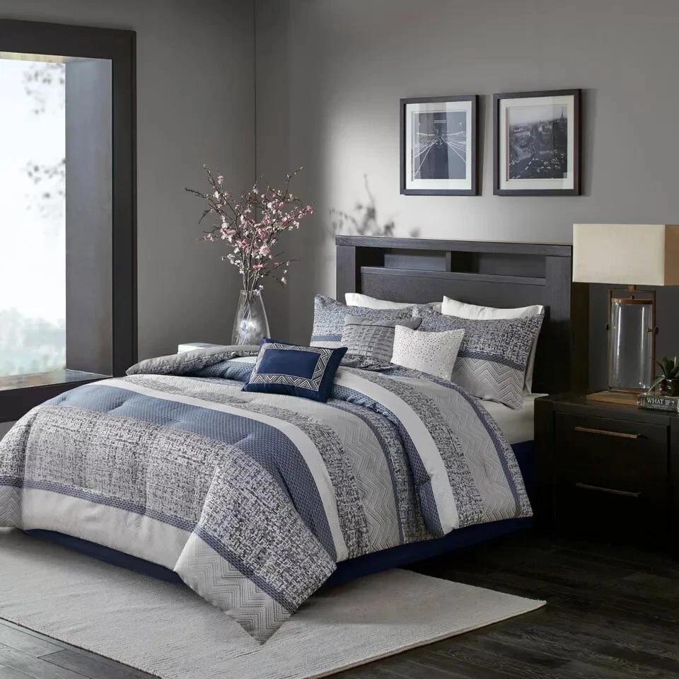 Elevate the style of your bedroom with this luxurious and transitional style jacquard 7 piece comforter set from Madison Park. The set includes a decorative pillow, pillow sham, comforter, and bed skirt, all made of polyester and microfiber material, ensuring comfort and durability. The stripe design on top of the comforter and embroidery and pleated details on the decorative pillows add an elegant touch to the set. The set is suitable for all seasons and is hypoallergenic and breathable, making it perfect for family use. It is machine washable and steam iron for wrinkle removal, making maintenance a breeze. The set is available in king size and varies in item length and width. STANDARD 100 by OEKO-TEX certified, this comforter set is a must-have for teens and adults looking for a stylish and comfortable bedding option. Queen size.
