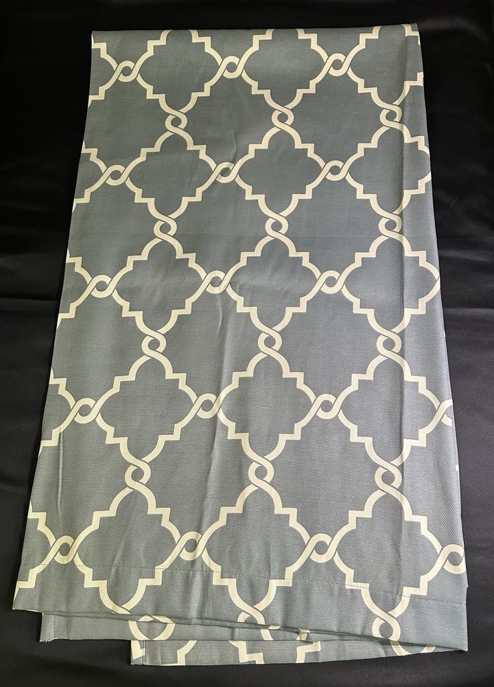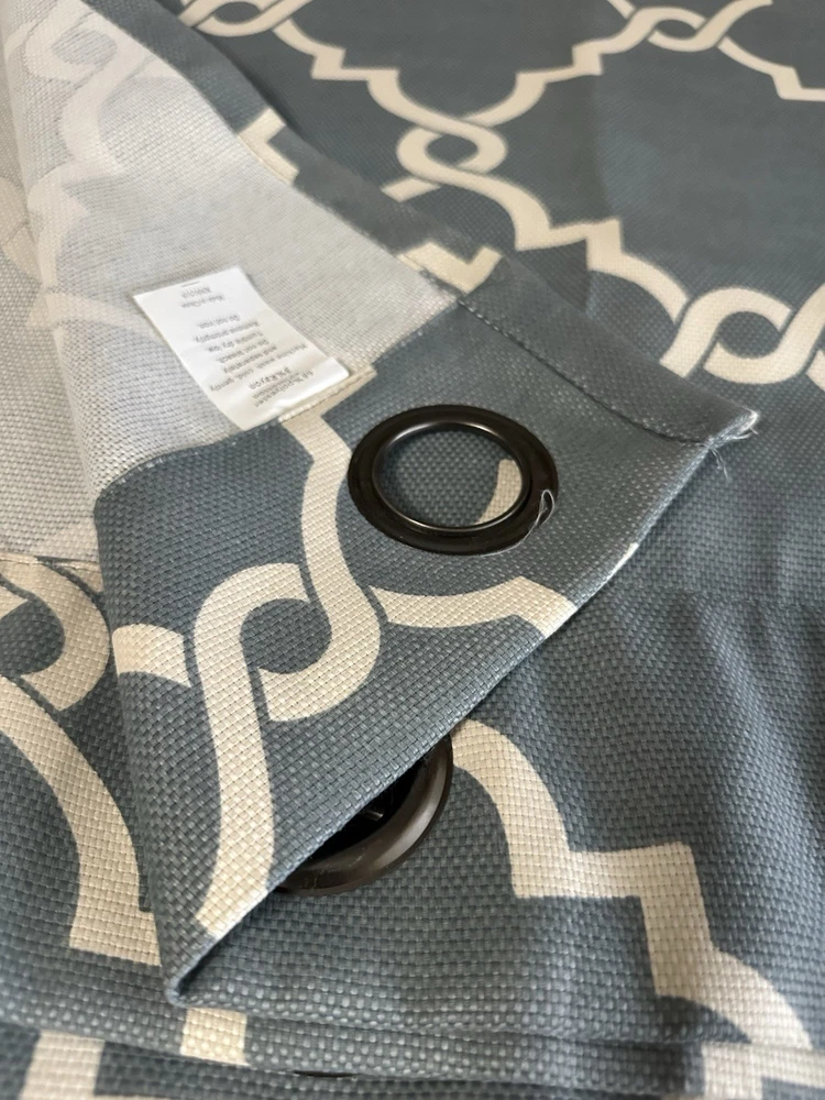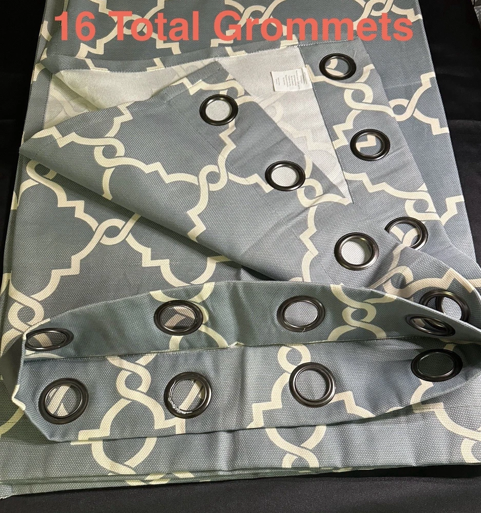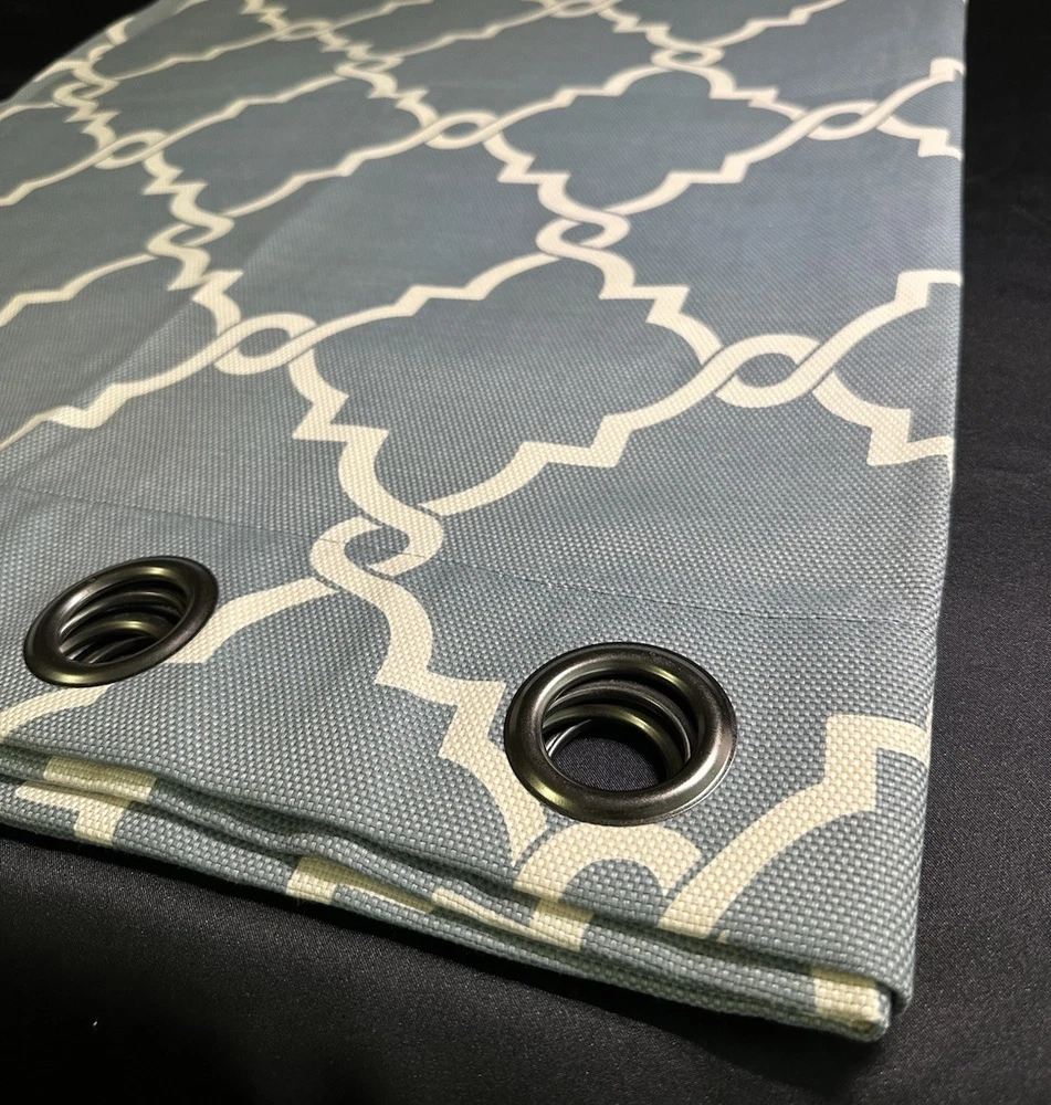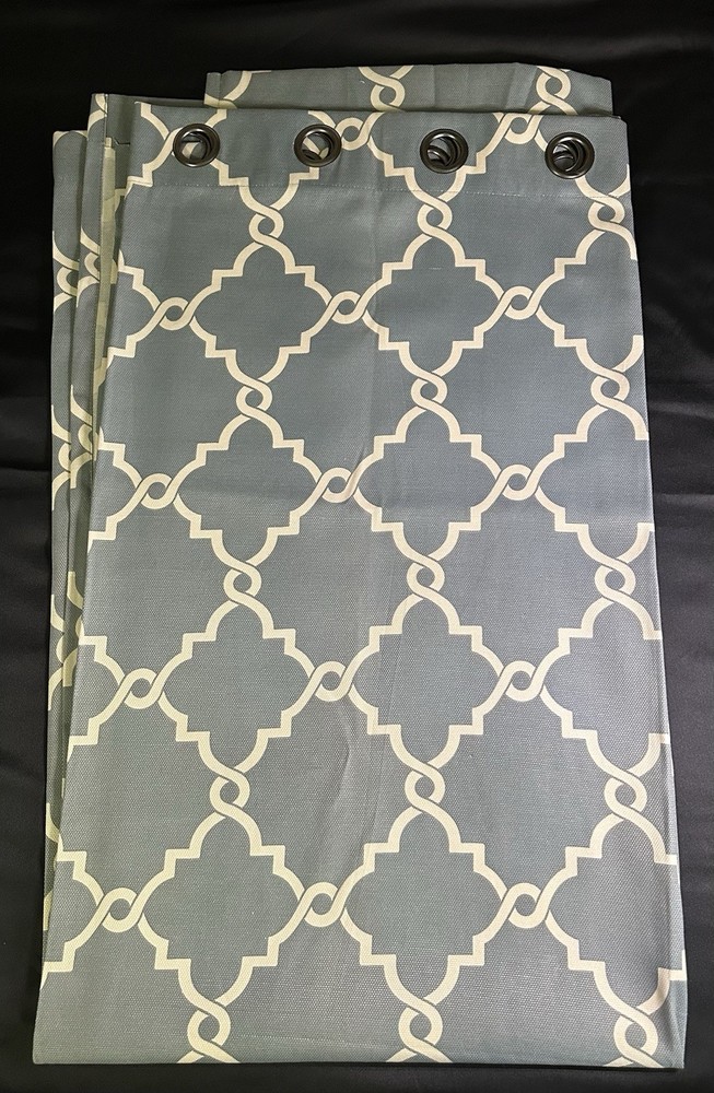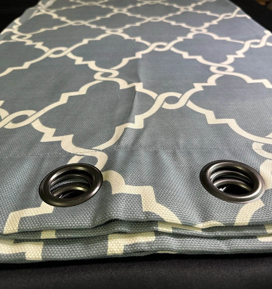 Madison Park Room Darkening Window Curtain Panel in Light Blue Gray, with the Saratoga Fretwork Pattern in a Cream Color. Patio size Panel Large panel measures 100 inches wide by 84 inch length This curtain provides privacy and reduces outside noise with the heavy style fabric and room darkening feature. Made of durable polyester and cotton material with 16 total 1.5 inch grommets in rubbed bronze. Machine washable, easy to care for, and suitable for any room in your home. The item was pre loved, used only inside, and comes without stains or tears. It does have some lighter spots on the blue weave, but that was how it came out of the package, and is not noticeable once hung.