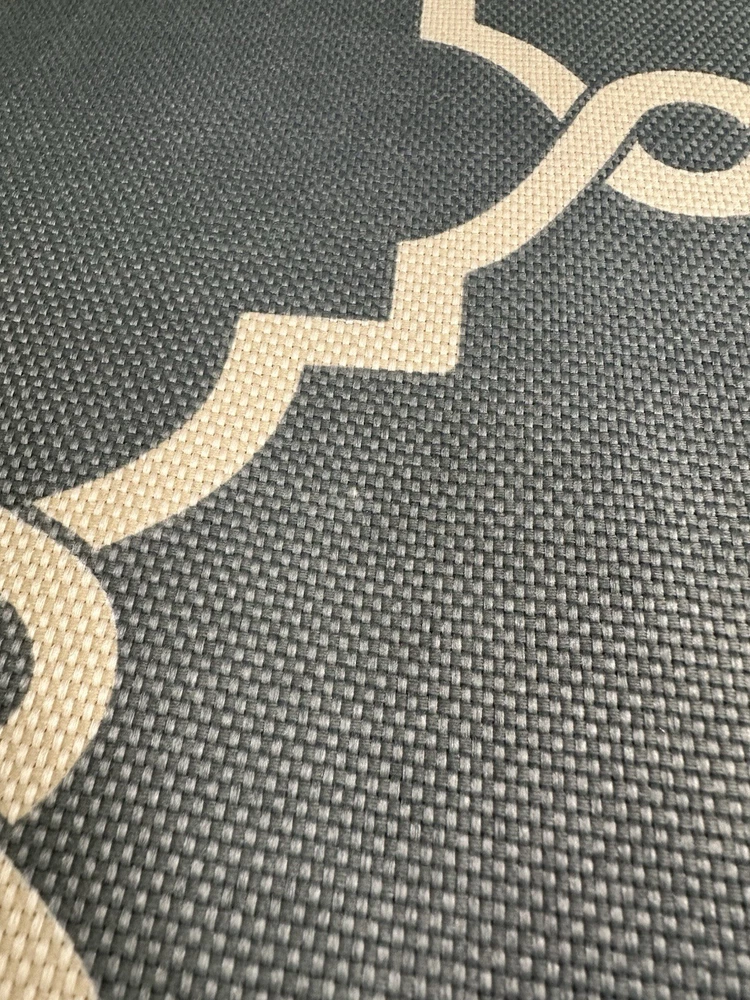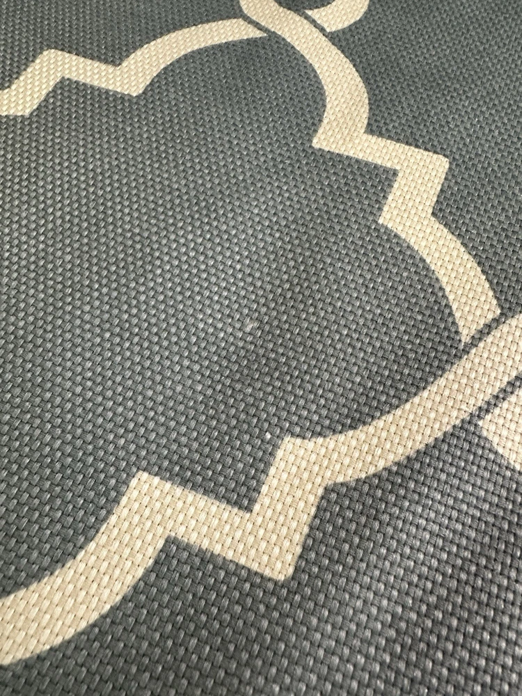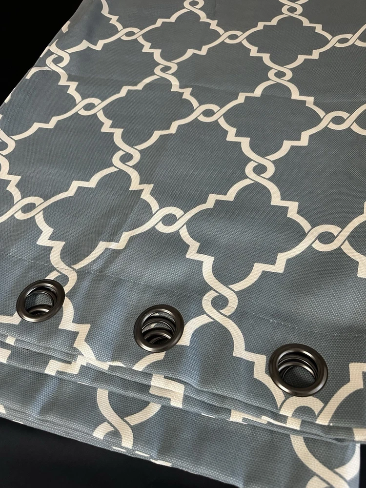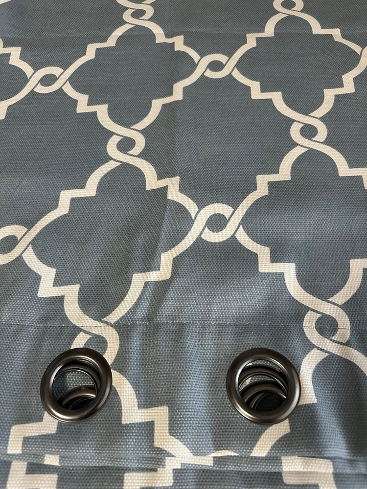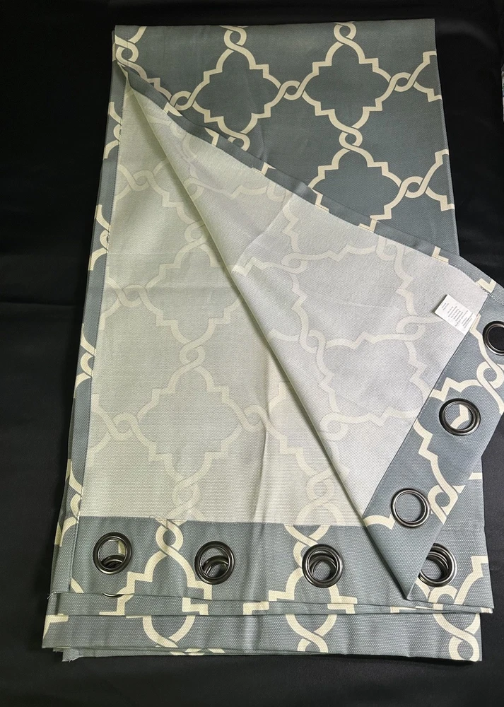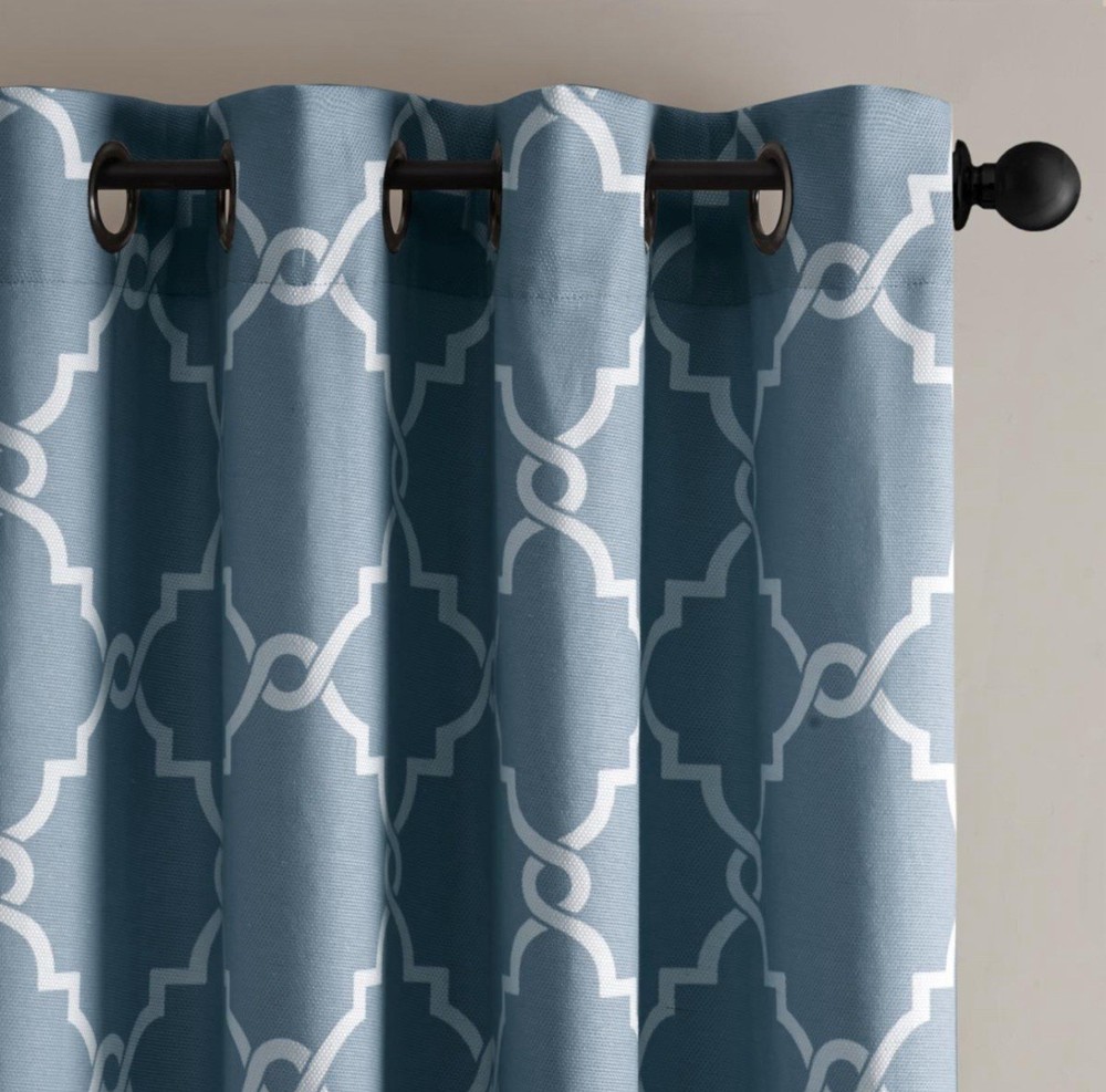 Madison Park Room Darkening Window Curtain Panel in Light Blue Gray, with the Saratoga Fretwork Pattern in a Cream Color. Patio size Panel Large panel measures 100 inches wide by 84 inch length This curtain provides privacy and reduces outside noise with the heavy style fabric and room darkening feature. Made of durable polyester and cotton material with 16 total 1.5 inch grommets in rubbed bronze. Machine washable, easy to care for, and suitable for any room in your home. The item was pre loved, used only inside, and comes without stains or tears. It does have some lighter spots on the blue weave, but that was how it came out of the package, and is not noticeable once hung.