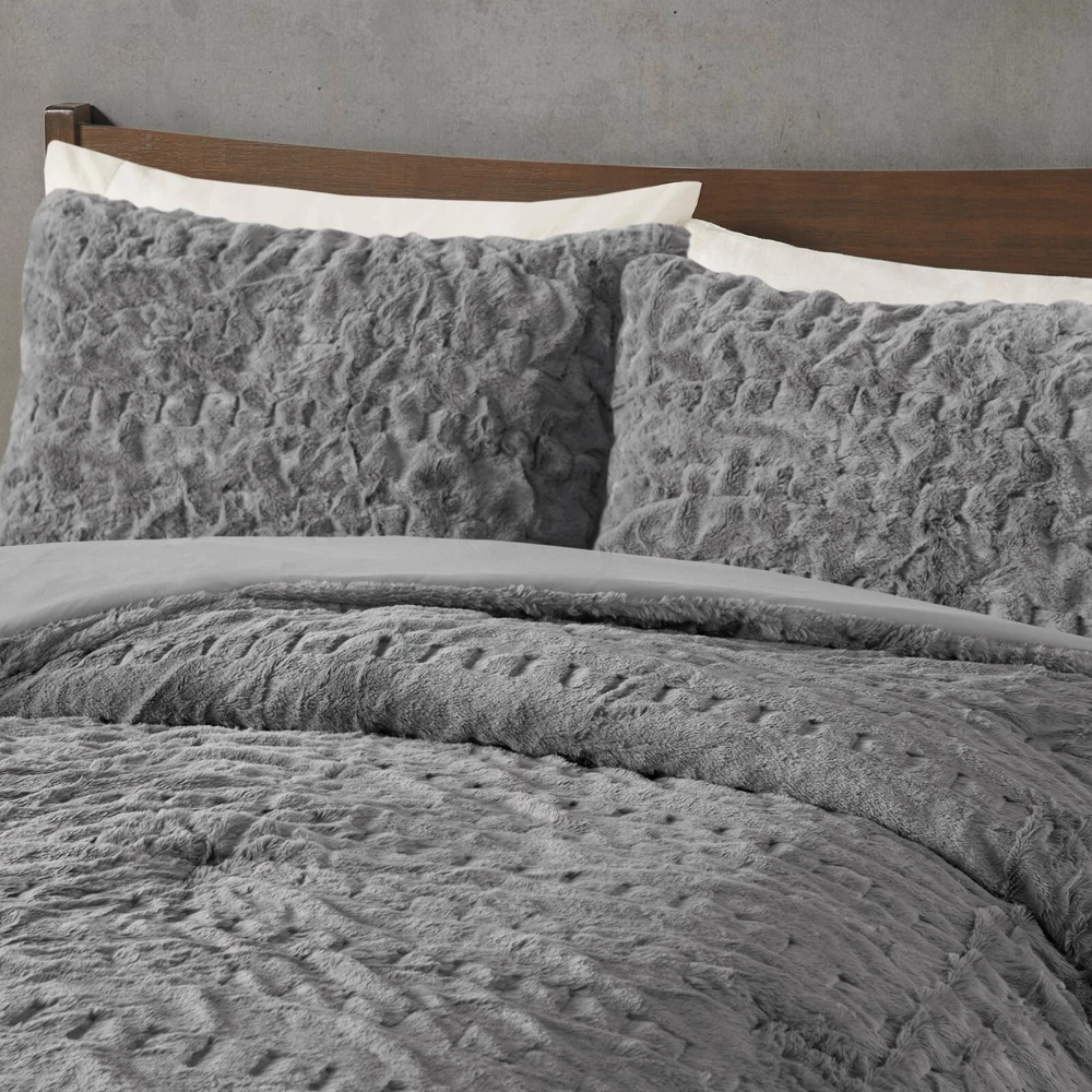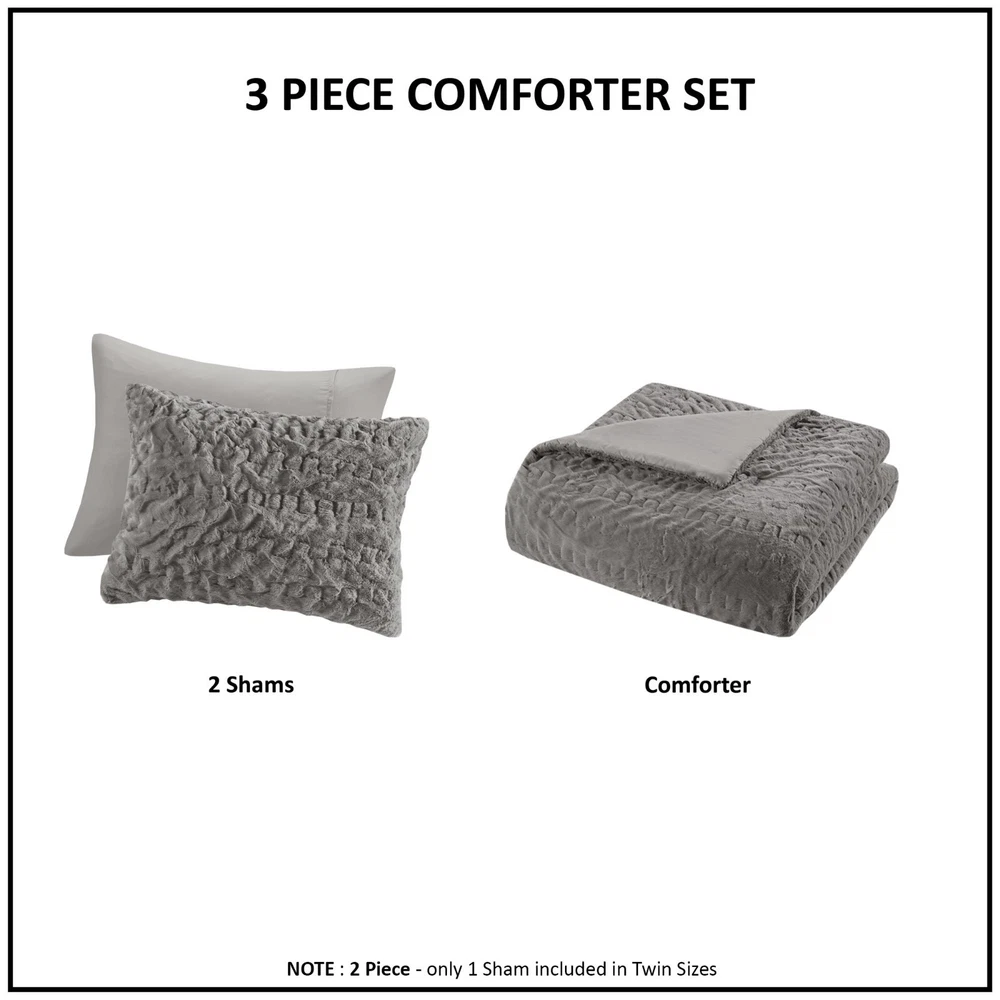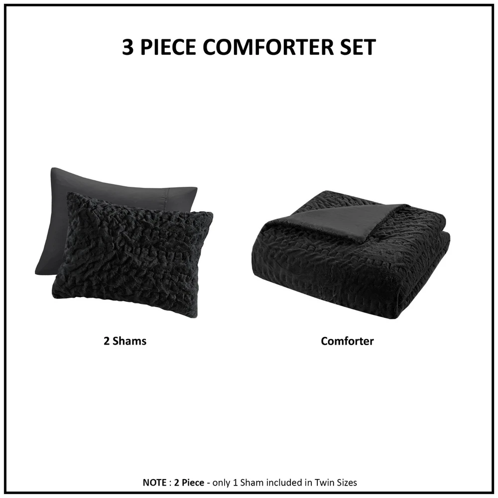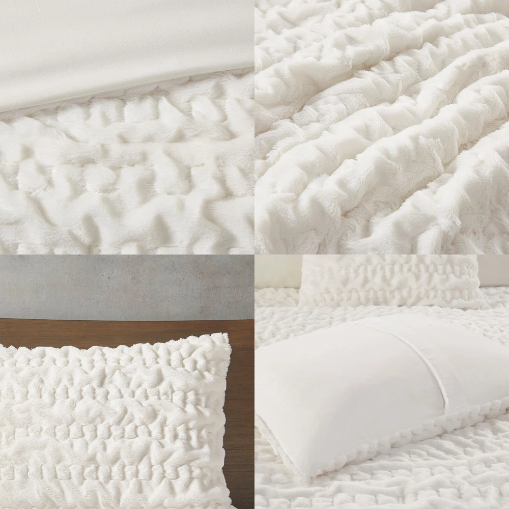 Madison Park Ruched Fur Down Alternative Comforter Set Full Queen King Size DESCRIPTION Add glamorous style and comfort to your bedroom with the Madison Park Blair Down Alt Ruched Faux Fur Comforter Set. This stylish comforter will liven up your bedroom with its unique texture and beauty. The face features a luxuriously soft faux fur with a stunning ruched design and a solid microfiber reverse. This bedding set includes 1 hypoallergenic polyester filled comforter and 2 shams to complete the look. This comforter set is also OEKO-TEX certified, meaning it does not contain any harmful substances or chemicals to ensure quality comfort and wellness. All pieces are machine washable for easy care. Items in the set may come in a rolled or compressed packaging, which will need to be fluffed up or steam ironed before use to remove wrinkles. FEATURES • Luxurious and cozy faux fur face with a microfiber reverse • Hypoallergenic down alternative filling for optimized comforter • Medium weight for all seasons • Three piece mini set includes a comforter and 2 shams • Oeko-Tex Certified, includes no harmful substances or chemicals • Machine washable. Minor shedding is expected with faux fur material and should subside after 3-4 washes • Items come in rolled packaging and will need to be fluffed upon opening MATERIAL Comforter: face: 100% Polyester ruched fur; reverse: 100% polyester microfiber; filling: 100% polyester fiber fill; Jump tack stitched, knife edge Sham: face: 100% Polyester ruched fur; reverse: 100% polyester microfiber; knife edge, overlap open on back Available Sizes: Full/Queen Comforter Set includes: 1 Comforter: 90"W x 90"L 2 Standard Shams: 20"W x 26"L King/California King Comforter Set includes: 1 Comforter: 104"W x 90"L 2 King Shams: 20"W x 36"L