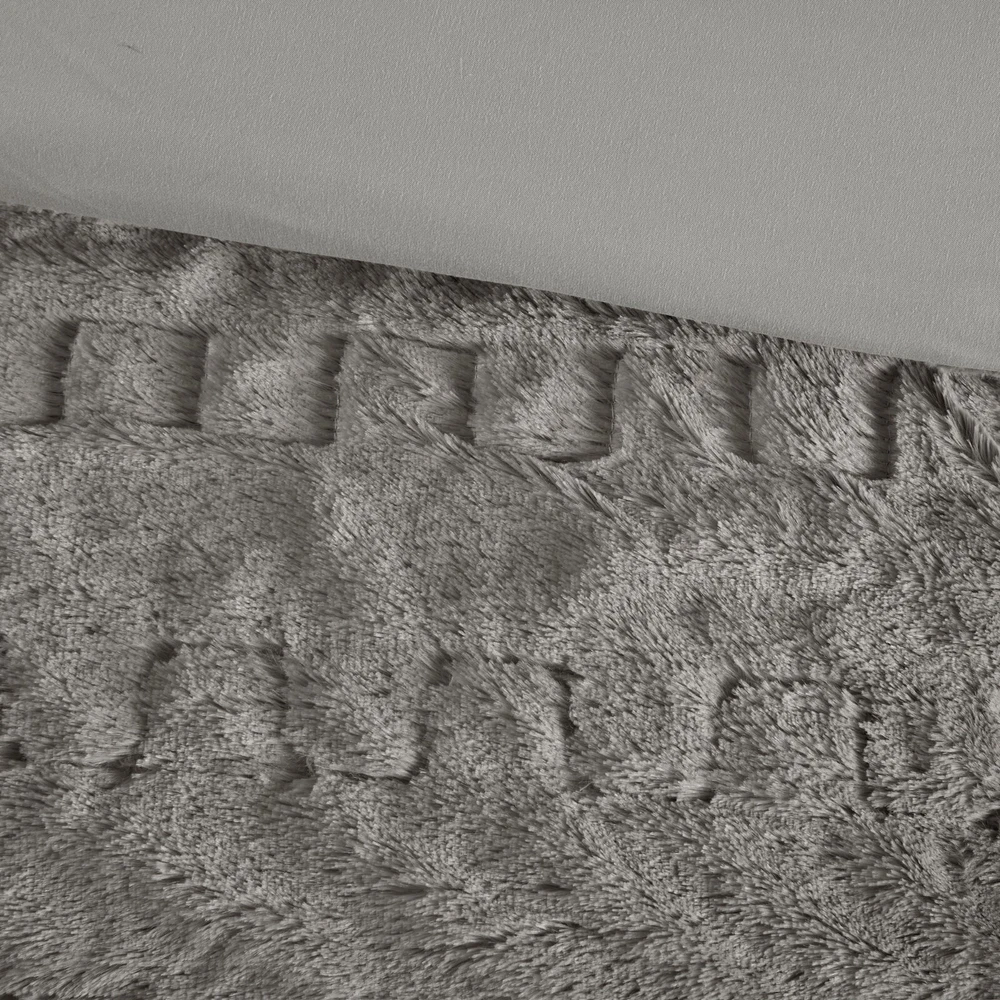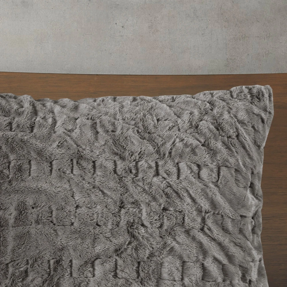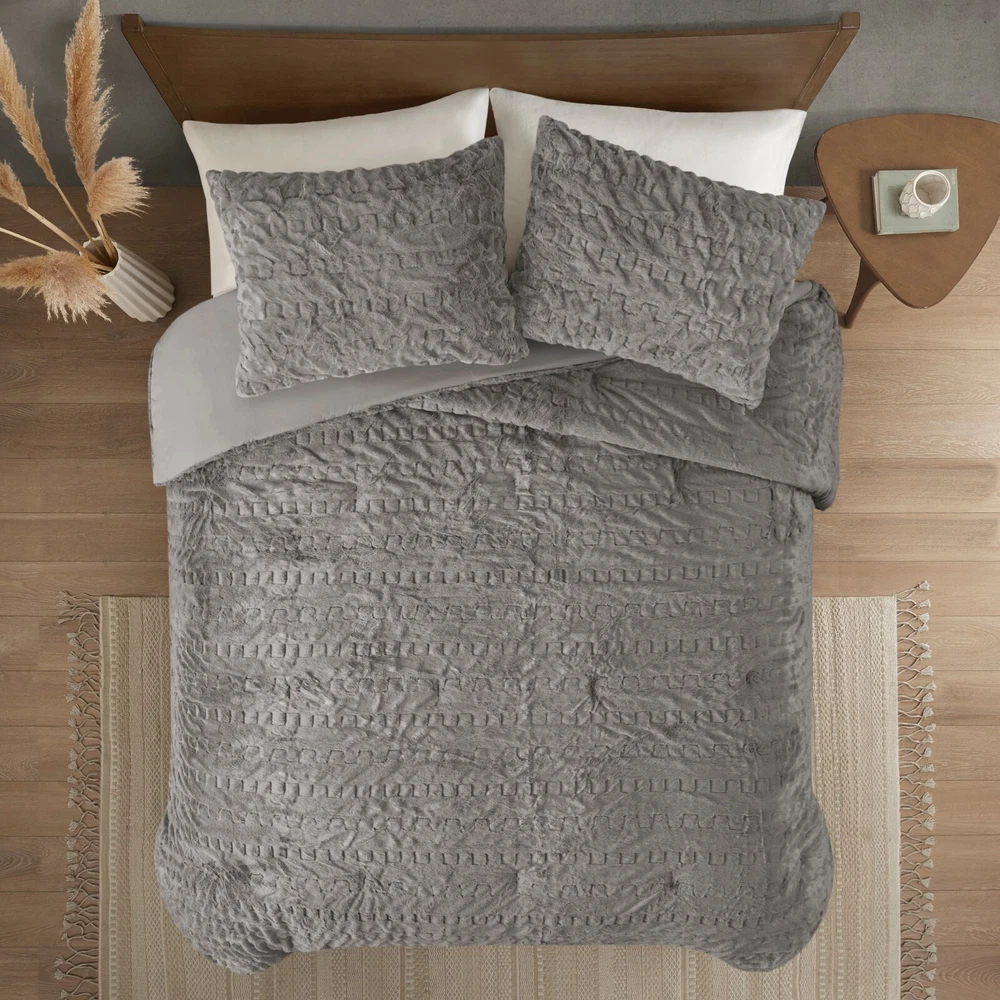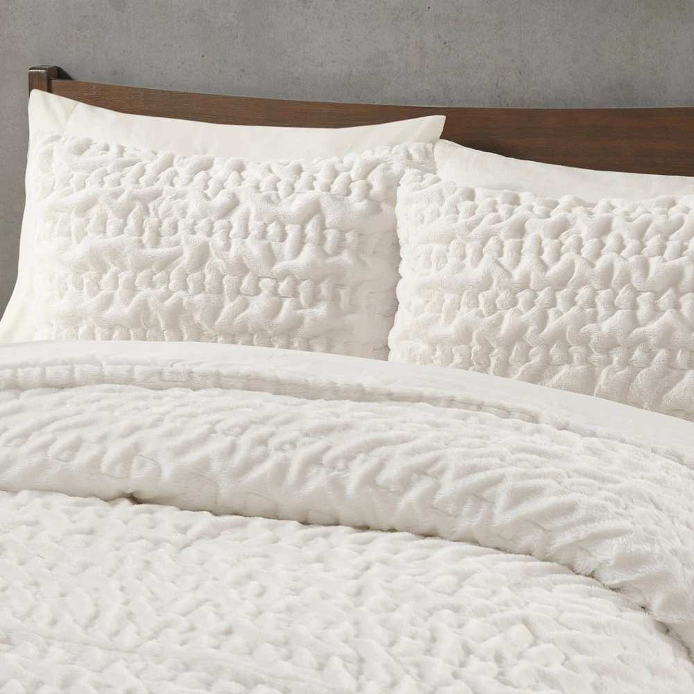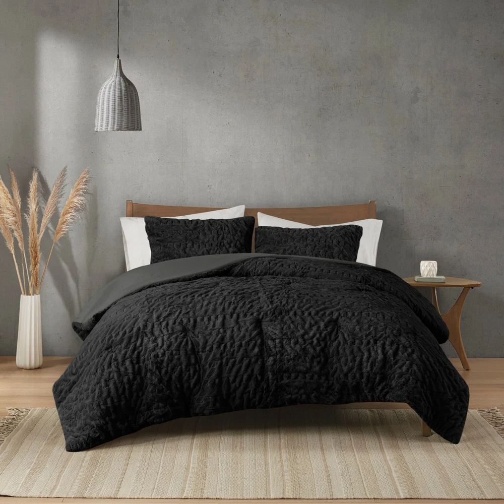 Madison Park Ruched Fur Down Alternative Comforter Set Full Queen King Size DESCRIPTION Add glamorous style and comfort to your bedroom with the Madison Park Blair Down Alt Ruched Faux Fur Comforter Set. This stylish comforter will liven up your bedroom with its unique texture and beauty. The face features a luxuriously soft faux fur with a stunning ruched design and a solid microfiber reverse. This bedding set includes 1 hypoallergenic polyester filled comforter and 2 shams to complete the look. This comforter set is also OEKO-TEX certified, meaning it does not contain any harmful substances or chemicals to ensure quality comfort and wellness. All pieces are machine washable for easy care. Items in the set may come in a rolled or compressed packaging, which will need to be fluffed up or steam ironed before use to remove wrinkles. FEATURES • Luxurious and cozy faux fur face with a microfiber reverse • Hypoallergenic down alternative filling for optimized comforter • Medium weight for all seasons • Three piece mini set includes a comforter and 2 shams • Oeko-Tex Certified, includes no harmful substances or chemicals • Machine washable. Minor shedding is expected with faux fur material and should subside after 3-4 washes • Items come in rolled packaging and will need to be fluffed upon opening MATERIAL Comforter: face: 100% Polyester ruched fur; reverse: 100% polyester microfiber; filling: 100% polyester fiber fill; Jump tack stitched, knife edge Sham: face: 100% Polyester ruched fur; reverse: 100% polyester microfiber; knife edge, overlap open on back Available Sizes: Full/Queen Comforter Set includes: 1 Comforter: 90"W x 90"L 2 Standard Shams: 20"W x 26"L King/California King Comforter Set includes: 1 Comforter: 104"W x 90"L 2 King Shams: 20"W x 36"L