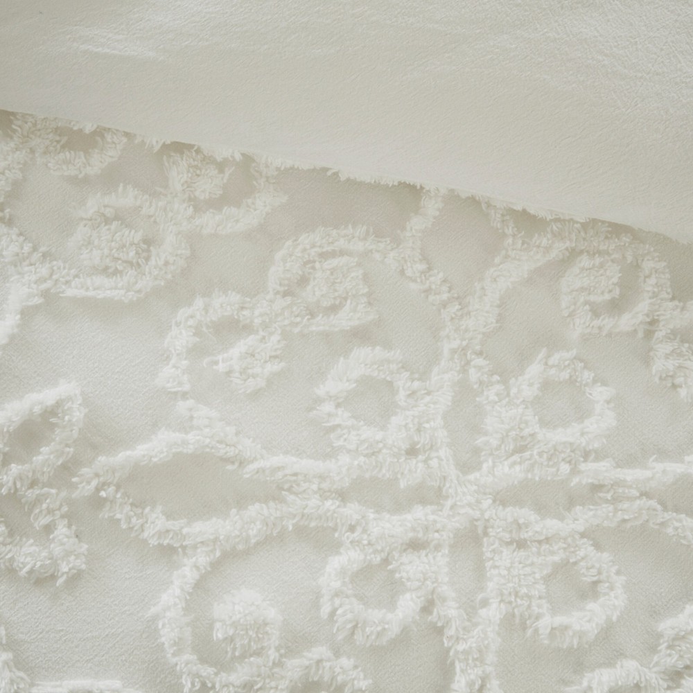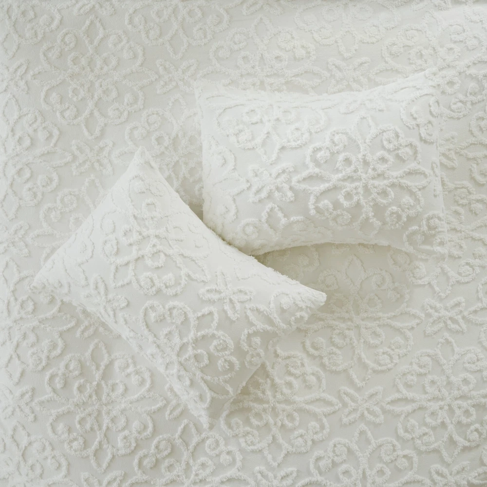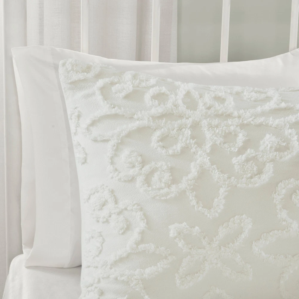 Store Categories Store Categories Bedding Comforters Decorative Pillows Duvet Covers Quilts & Coverlets Sheets Blankets & Throws Mattress Pads Pillows Home Decor Window Treatments Wall Art Home Accents Furniture Beds Dining Seating Ottomans & Benches Accent Chairs Accent Tables Dining Tables Sofas Bath Bath Robes Shower Curtains Towels Bath Rugs Bath Accessories Apparel Pajama Sets Nightgowns Rugs Rugs & Carpets Lighting Lamp Pendant Other Product Overview Details DESCRIPTION Give your bedroom a cozy shabby chic look with the Madison Park Sabrina 3 Piece Tufted Cotton Chenille Duvet Cover Set. The cotton chenille duvet cover and 2 shams flaunt a tufted floral medallion motif, creating a charming farmhouse look. Made with a 100% cotton face and reverse, this tufted cotton duvet cover set offers a shabby chic update for your bedroom. This bedding set is also OEKO-TEX certified, meaning it does not contain any harmful substances or chemicals to ensure quality comfort and wellness. A button closure helps secure a comforter insert within the duvet cover and inside ties in the corners help prevent it from shifting (insert is NOT included). Due to the nature of the chenille fabric, some shedding will occur naturally in the first 3-4 washes. FEATURES • Shabby chic cotton chenille duvet cover set in floral medallion • Set includes duvet cover and 2 matching shams • Duvet cover has button closure and 4 inside ties to secure the insert (insert not included) • Oeko-Tex Certified, includes no harmful substances or chemicals (# 19.HIN.73178) • Machine washable • Due to the nature of the chenille fabric, some shedding will occur naturally in the first 3-4 washes MATERIAL Duvet/Sham: 100% Tufted Cotton chenille face and cotton reverse; Button closure Available Sizes: Full/Queen Duvet Cover Set includes: 1 Duvet Cover: 90"W x 90"L 2 Standard Shams: 20"W x 26"L King/California King Duvet Cover Set includes: 1 Duvet Cover: 104"W x 92"L 2 King Shams: 20"W x 36"L Bedding Comforters Decorative Pillows Duvet Covers Quilts & Coverlets Sheets Blankets & Throws Mattress Pads Pillows Home Decor Window Treatments Wall Art Home Accents Furniture Beds Dining Seating Ottomans & Benches Accent Chairs Accent Tables Dining Tables Sofas Bath Bath Robes Shower Curtains Towels Bath Rugs Bath Accessories Rugs Rugs & Carpets Lighting Lamp Pendant Product Overview Product Details DESCRIPTION Give your bedroom a cozy shabby chic look with the Madison Park Sabrina 3 Piece Tufted Cotton Chenille Duvet Cover Set. The cotton chenille duvet cover and 2 shams flaunt a tufted floral medallion motif, creating a charming farmhouse look. Made with a 100% cotton face and reverse, this tufted cotton duvet cover set offers a shabby chic update for your bedroom. This bedding set is also OEKO-TEX certified, meaning it does not contain any harmful substances or chemicals to ensure quality comfort and wellness. A button closure helps secure a comforter insert within the duvet cover and inside ties in the corners help prevent it from shifting (insert is NOT included). Due to the nature of the chenille fabric, some shedding will occur naturally in the first 3-4 washes. FEATURES • Shabby chic cotton chenille duvet cover set in floral medallion • Set includes duvet cover and 2 matching shams • Duvet cover has button closure and 4 inside ties to secure the insert (insert not included) • Oeko-Tex Certified, includes no harmful substances or chemicals (# 19.HIN.73178) • Machine washable • Due to the nature of the chenille fabric, some shedding will occur naturally in the first 3-4 washes MATERIAL Duvet/Sham: 100% Tufted Cotton chenille face and cotton reverse; Button closure Available Sizes: Full/Queen Duvet Cover Set includes: 1 Duvet Cover: 90"W x 90"L 2 Standard Shams: 20"W x 26"L King/California King Duvet Cover Set includes: 1 Duvet Cover: 104"W x 92"L 2 King Shams: 20"W x 36"L