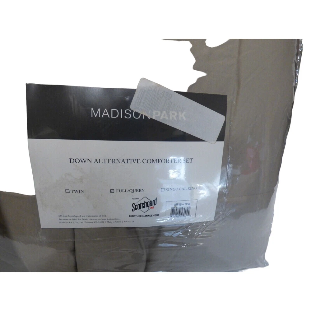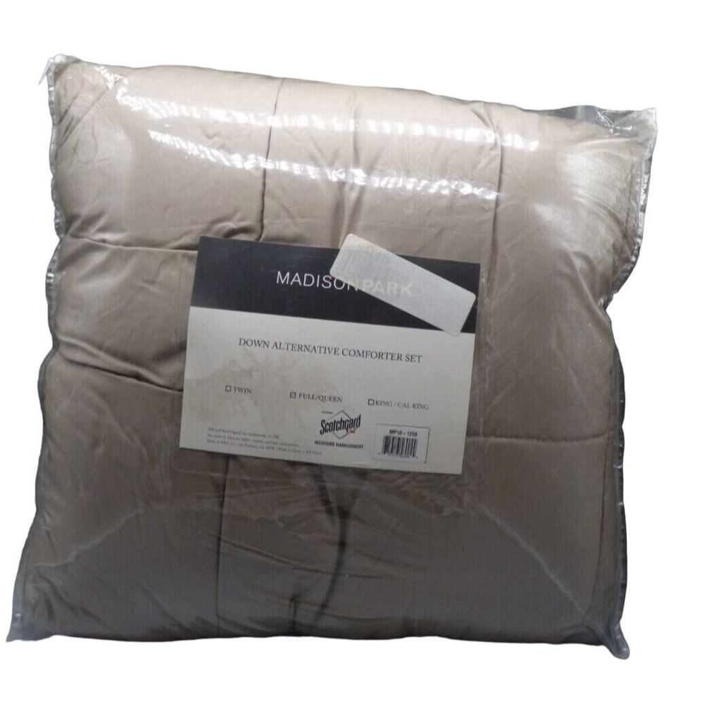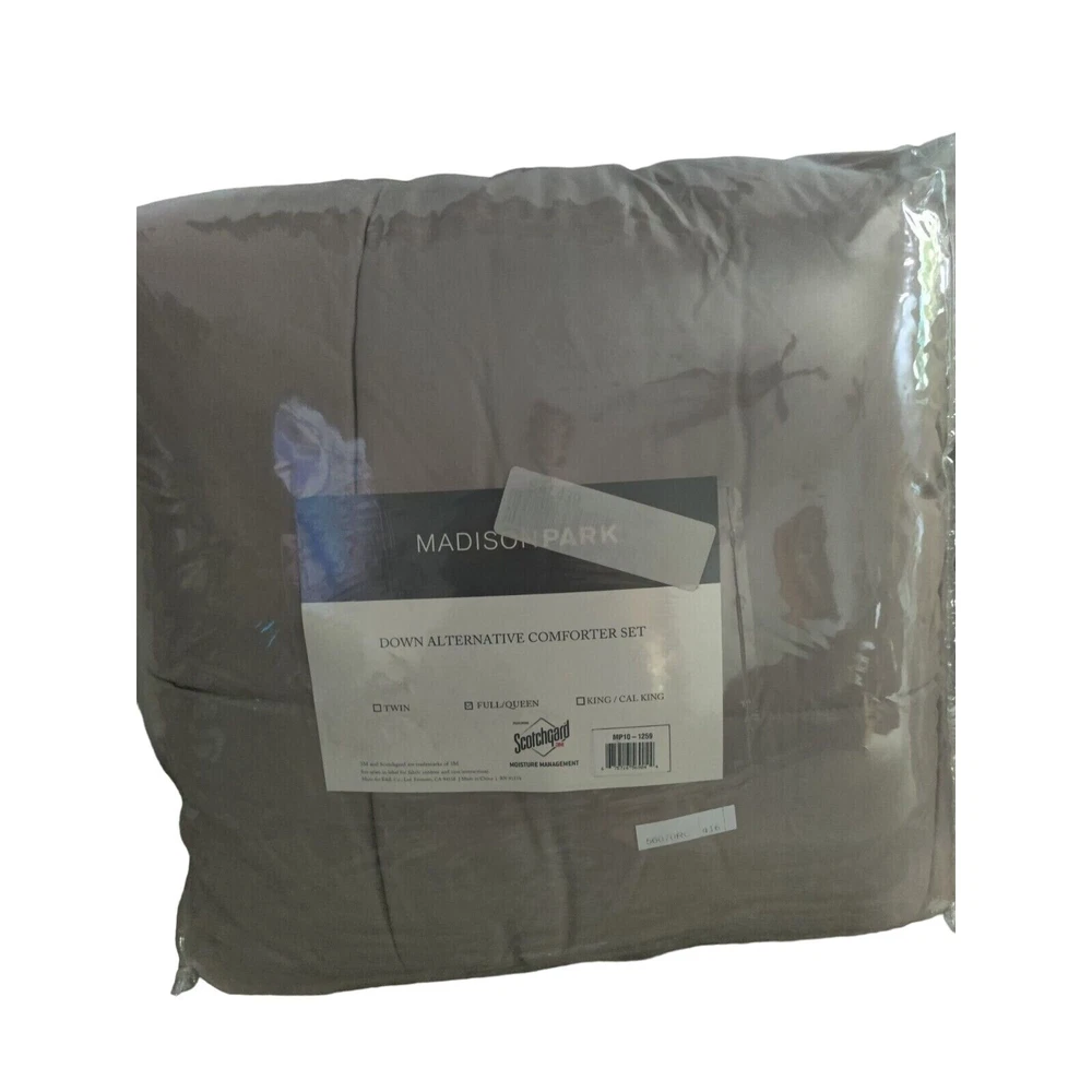 Seller's Note: These items are shelf puled and/or returned items from a major department store. They might have been tried on by multiple people. In case of returned items, they may have been worn. Please read the Condition Note below for a detailed explanation of the item?s condition. Madison Park Down Alternative Comforter Set, Full/ Queen, Taupe (light brown) Scotchgard Moisture management 100% Polyester The set includes: 1 Full/ Queen comforter 88” x 86” 2 standard size pillow shams. 20” x 26” ***the color is richer taupe than the photos may lead you to believe...a bit more tan, a bit less gray***8 Condition Note: Department store shelf pulled/ returned item, in the original retail packaging and possibly in gently used condition (though it does not really look used). International Buyers! Please Note: Import duties, taxes, and charges are not included in the item price or shipping cost. These charges are the buyer's responsibility. Please check with your country's customs office to determine what these additional costs will be prior to bidding or buying. Payment eBay accepted payment methods Shipping All items will ship within one business day, after the payment clears. We do not ship on the weekends. Most items purchased by noon Arizona time will ship the same day. Items purchased on Friday after noon will ship the following Monday. Terms of Sale To our domestic customers, we do offer free returns and charge no restocking fee. The originally paid shipping cost is non-returnable, however, except when mandated by eBay's policy. We offer 30 day returns to our international customers as well, however the shipping cost is borne by the buyer. Please take a moment to read our highlighted Item's Condition Note (included with every listing) and ask as many questions as you need, prior to making your purchase. Should you purchase an item in error, please let us know immediately and we will gladly cancel your order. Please pay for all purchased items within 6 days of purchase. Non-payment claim will auto-file on day 7 for all purchased items that remain unpaid. About Us We are a small, family operated business that specializes in High End Department store liquidations. We offer department store shelf pulled, returned, and overstock items, at a fraction of the retail cost. Each item is carefully inspected and its condition truthfully described in picture and words.