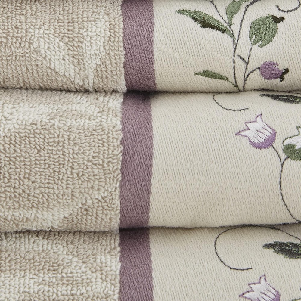 Madison Park Serene 100% Cotton Bath Towel Set Luxurious Multi-Sizes, Purple Product Details Color: Purple Brand: Madison Park Towel form type: Bath Towel Age Range (Description): Adult Material: Cotton Product Dimensions: 52"L x 27"W Number of Items: 1 Style: Traditional Pattern: Floral Special Feature: Embroidered Theme: Floral Product Care Instructions: Machine Washable Shape: Rectangular Specification Met: OEKO-TEX Size: Multi-Sizes Unit Count: 6.0 Count Fabric Type: 100% Cotton Customer Package Type: Standard Packaging Item Weight: 3.3 Pounds Model Name: Serene 100% Cotton Bath Towel Set Manufacturer: E&E Co. Ltd DBA JLA Home Item Weight: 3.3 pounds Item model number: MP73-7906 Volume: 1 Milliliters Assembly required: No Number of pieces: 6 Batteries required: No Included Components: 2 Bath Towels, 2 Hand Towels, 2 Fingertip Towels 100% Cotton Add a touch of elegance to your bathroom decor with our Madison Park Serene Embroidered Cotton Jacquard 6 Piece Towel Set These cotton towels feature a jacquard leaf pattern with a floral embroidered hem, and color contrast piping details to create a beautiful and sophisticated look This cotton towel set is also OEKO-TEX certified, meaning it does not contain any harmful substances or chemicals, ensuring quality comfort and wellness Set includes: 2 Bath Towels: 27"W x 52"L, 2 Hand Towels: 16"W x 28"L, 2 Fingertip Towels: 12"W x 18"L Care Instructions: Machine Washable. New towels tend to lint at first but after several washes, lint will diminish. Towels should be washed separately to minimize lint Add a touch of elegance to your bathroom decor with our Madison Park Serene Embroidered Cotton Jacquard 6 Piece Towel Set. These cotton towels feature a jacquard leaf pattern with a floral embroidered hem, and purple contrast piping details to create a beautiful and sophisticated look. This cotton towel set is also OEKO-TEX certified(Made in Green), meaning it does not contain any harmful substances or chemicals, ensuring quality comfort and wellness. Highly absorbent and incredibly soft from its medium weight terry loop construction, this towel set is also machine washable for easy care for the perfect addition to any bathroom. Set includes: 2 standard 27x52" bath towels, 2 standard 16x28" hand towels, and 2 standard 12x18" fingertip towels.