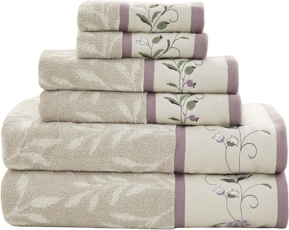 Madison Park Serene 100% Cotton Bath Towel Set Luxurious Multi-Sizes, Purple Product Details Color: Purple Brand: Madison Park Towel form type: Bath Towel Age Range (Description): Adult Material: Cotton Product Dimensions: 52"L x 27"W Number of Items: 1 Style: Traditional Pattern: Floral Special Feature: Embroidered Theme: Floral Product Care Instructions: Machine Washable Shape: Rectangular Specification Met: OEKO-TEX Size: Multi-Sizes Unit Count: 6.0 Count Fabric Type: 100% Cotton Customer Package Type: Standard Packaging Item Weight: 3.3 Pounds Model Name: Serene 100% Cotton Bath Towel Set Manufacturer: E&E Co. Ltd DBA JLA Home Item Weight: 3.3 pounds Item model number: MP73-7906 Volume: 1 Milliliters Assembly required: No Number of pieces: 6 Batteries required: No Included Components: 2 Bath Towels, 2 Hand Towels, 2 Fingertip Towels 100% Cotton Add a touch of elegance to your bathroom decor with our Madison Park Serene Embroidered Cotton Jacquard 6 Piece Towel Set These cotton towels feature a jacquard leaf pattern with a floral embroidered hem, and color contrast piping details to create a beautiful and sophisticated look This cotton towel set is also OEKO-TEX certified, meaning it does not contain any harmful substances or chemicals, ensuring quality comfort and wellness Set includes: 2 Bath Towels: 27"W x 52"L, 2 Hand Towels: 16"W x 28"L, 2 Fingertip Towels: 12"W x 18"L Care Instructions: Machine Washable. New towels tend to lint at first but after several washes, lint will diminish. Towels should be washed separately to minimize lint Add a touch of elegance to your bathroom decor with our Madison Park Serene Embroidered Cotton Jacquard 6 Piece Towel Set. These cotton towels feature a jacquard leaf pattern with a floral embroidered hem, and purple contrast piping details to create a beautiful and sophisticated look. This cotton towel set is also OEKO-TEX certified(Made in Green), meaning it does not contain any harmful substances or chemicals, ensuring quality comfort and wellness. Highly absorbent and incredibly soft from its medium weight terry loop construction, this towel set is also machine washable for easy care for the perfect addition to any bathroom. Set includes: 2 standard 27x52" bath towels, 2 standard 16x28" hand towels, and 2 standard 12x18" fingertip towels.