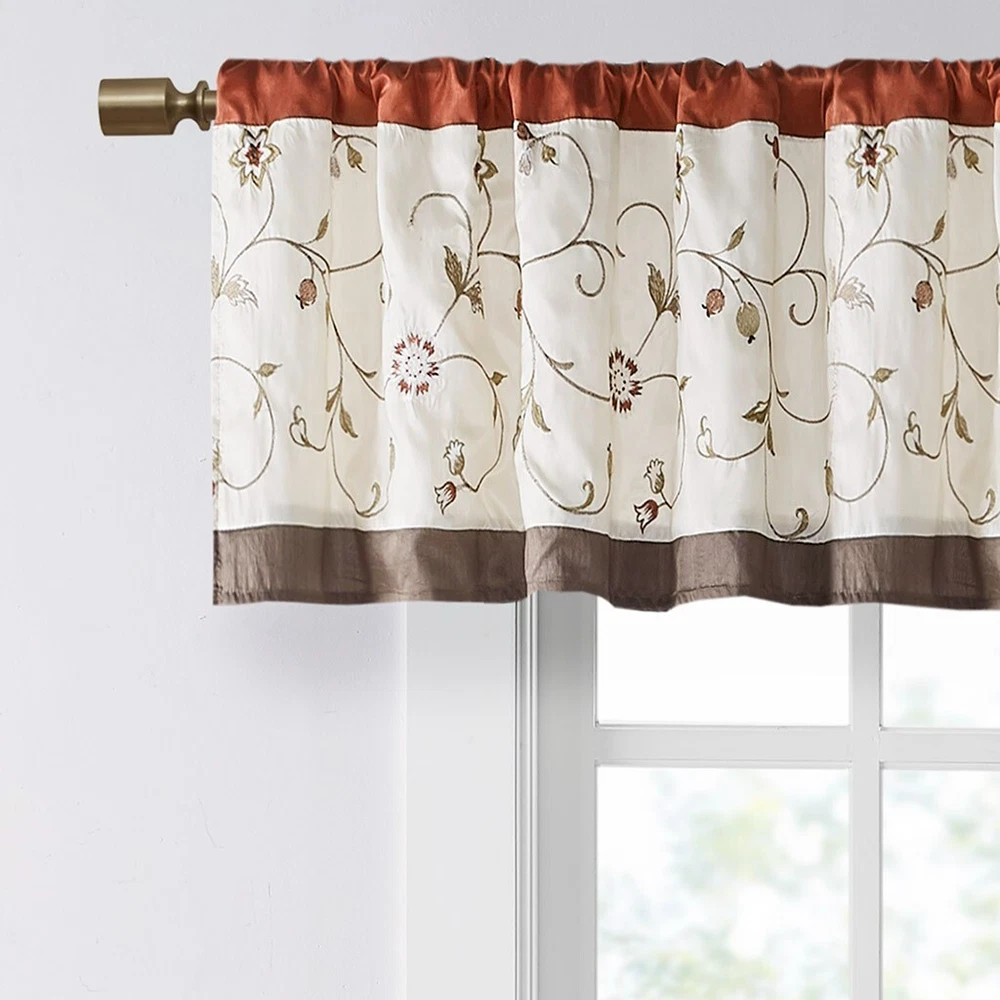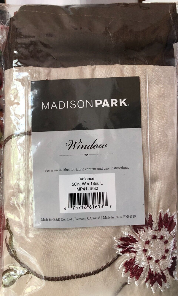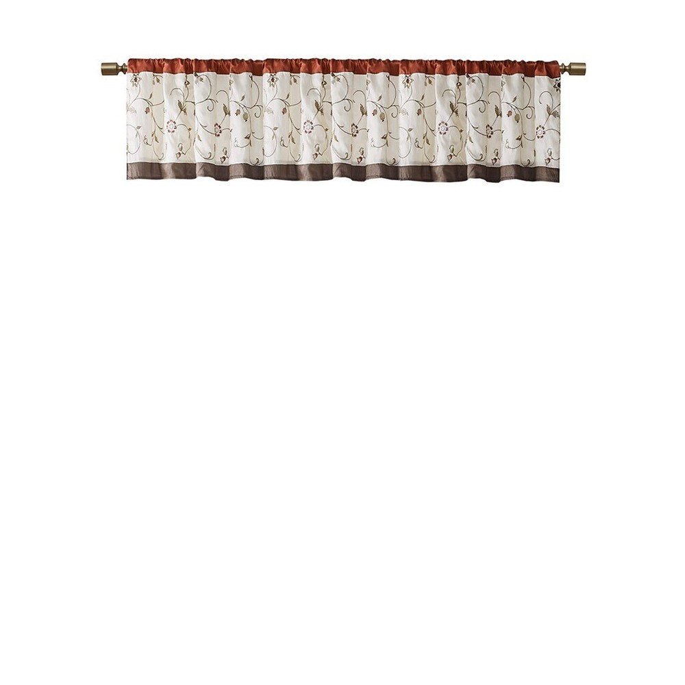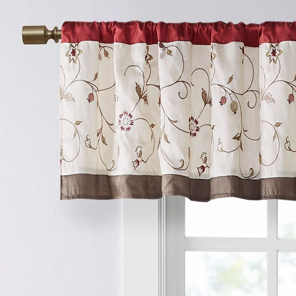 Madison Park Serene Embroidered Window Valance 50" W X 18" L Description: Add simple elegance to any room with the Madison Park Serene Embroidered Valance. This valance features delicate floral embroidery in rich red and natural hues, offering beautiful contrast for a sophisticated look. The pieced and pleated details provide extra dimension and charm to your home décor, while added lining helps filter the perfect amount of sunlight into your home. Simply hang on 3" rod pocket, fits up to a 1.25" diameter rod. 50x18" Size include: 1 Window Valance:50x18"