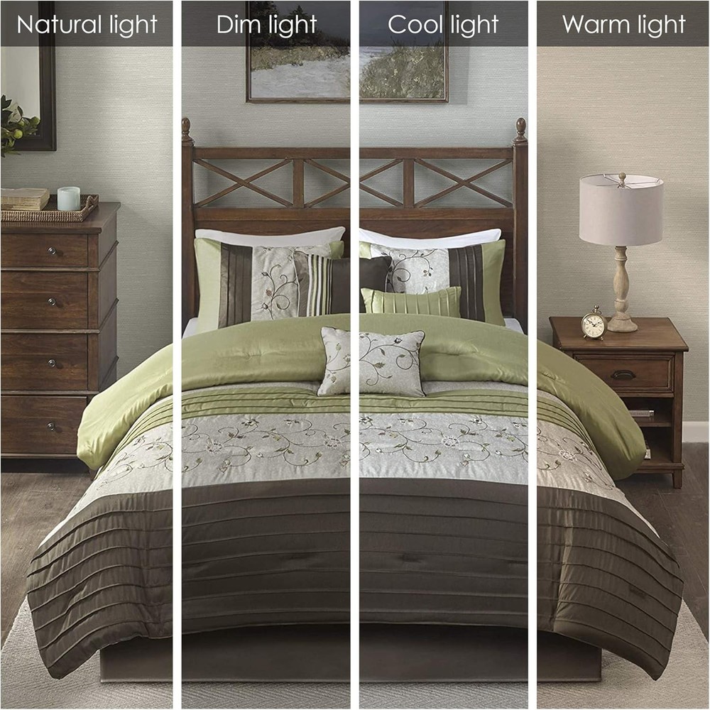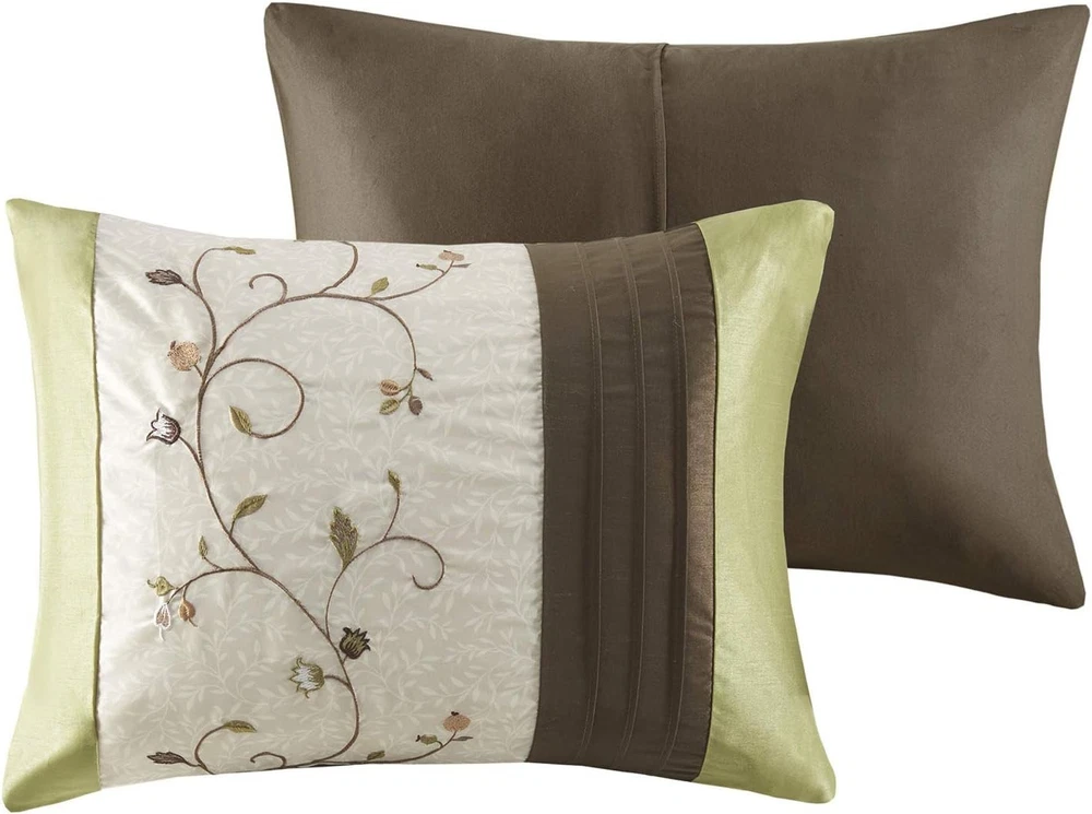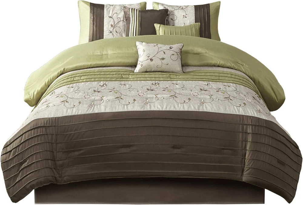 Madison Park Serene Faux Silk California King (104 in x 92 in), Green Product Details Size: California King (104 in x 92 in) Included Components: Comforter, Bed Skirt, Pillow Color: Green Style: Transitional Brand: Madison Park Theme: Floral Pattern: Floral Material: Polyester Fabric Type: 100% Polyester Number of Pieces: 7 Seasons: All Product Care Instructions: Machine Wash Manufacturer: Madison Park Item dimensions L x W x H: 92 x 104 x 1.5 inches Product Dimensions: 92 x 104 x 1.5 inches Item Weight: 13.77 pounds Country of Origin: China Item model number: MP10-638 Is Discontinued By Manufacturer: No Refill: fiber, synthetic Assembly required: No Batteries required: No Import: Imported 100% Polyester Imported The Serene Bedding Collection provides an ELEGANT LOOK to your home. Such cozy comforter also features gorgeous EMBROIDERY FLORAL DESIGN complemented with pleated stripes accent. Faux silk fabric comes with NATURAL SHEEN; it is a really SOFT fabric that is WRINKLE AND SHRINKAGE RESISTANT. Set includes: 1 Comforter:104x92", 2 King Shams:20x36", 1 Bedskirt:72x84+15", 3 Decorative Pillows:18x18"/12x18"/12x16" Care instructions: Machine wash cold, gentle cycle, and separately. Do not bleach. Tumble dry low, remove promptly. Do not iron. If there is no free movement in the washer or dryer, use large capacity commercial washer/dryer. The Serene Bedding Collection provides an elegant look to your home. The top of the comforter is a mix of green, chocolate brown, and taupe with piecing details while the taupe section has an embroidered floral pattern for a soft divide from these bold colors. Made from polyester dupioni, this fabric will produce a shine and pick up the light on both the comforter and shams. The decorative pillows come in a combination of solids, stripes, and embroidery to pull this whole set together.