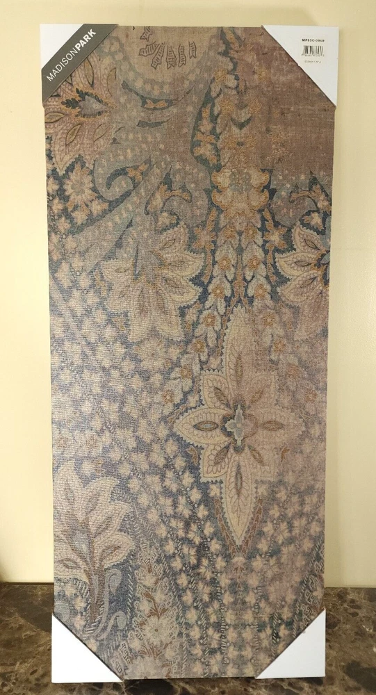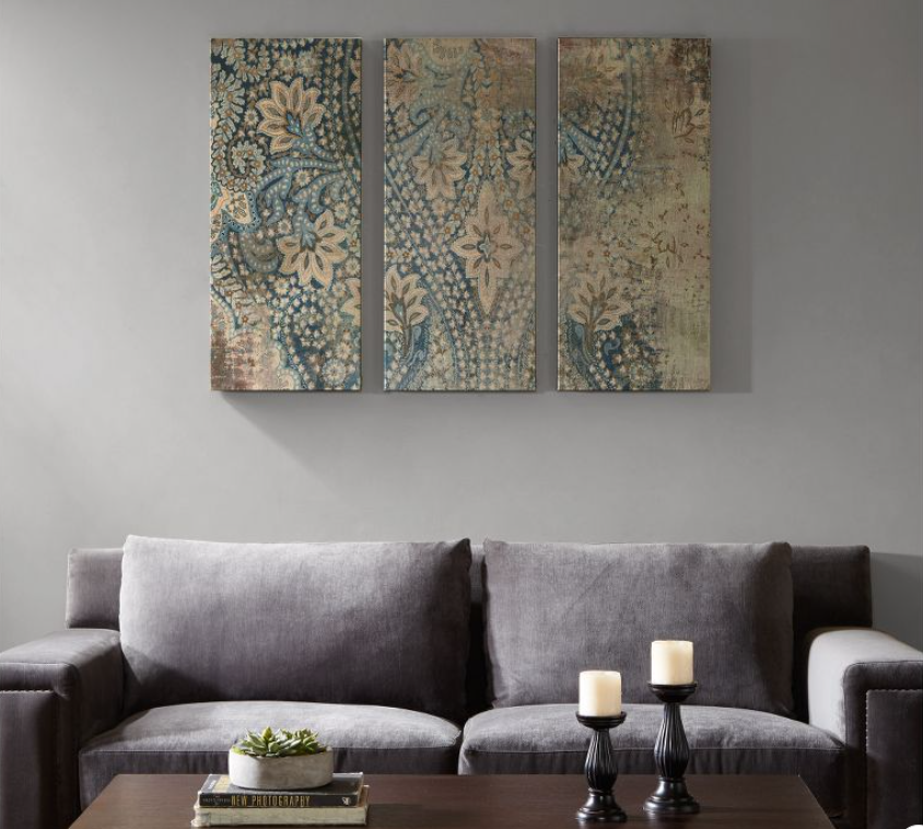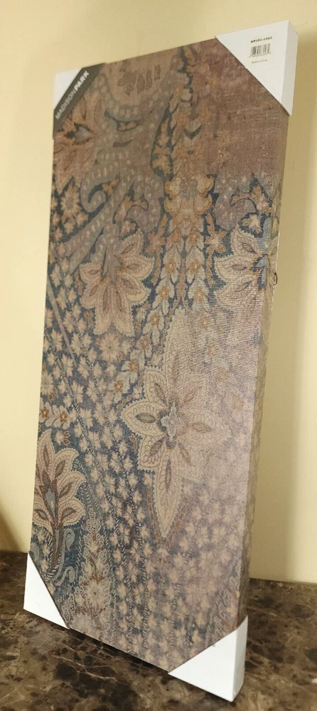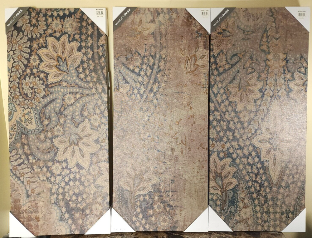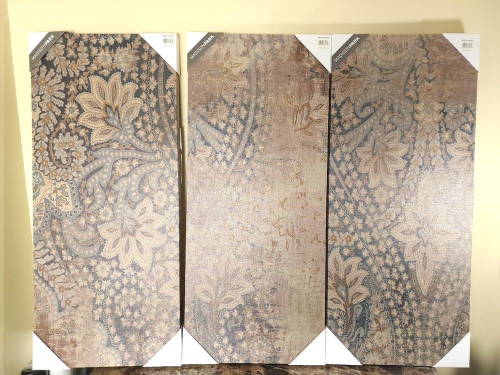 Madison Park Set of 3 Weathered Damask Walls Printed Linen Blue, Wall Decoration Display item. See pictures. PRODUCT DESCRIPTION: The Weathered Damask Walls Printed Linen 3 Piece Set offers an elegant update to your living room. This three piece wall art set features a beautiful damask design printed across the linen canvases, creating a rich gobally inspired look. Two D-rings on the back of each canvas make them easy to hang and arrange on any wall in your home. Dimensions (Overall): 35 Inches (H) x 15 Inches (W) x 1.5 Inches (D)