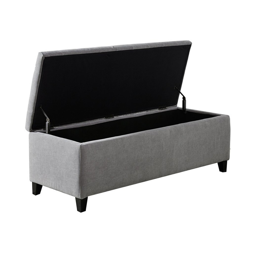 Madison Park Shandra Storage Ottoman - Solid Wood, Polyester Fabric Toy Chest Modern Style Lift-Top Accent Bench for Bedroom Furniture, Medium, Grey This modern storage ottoman accentuated with button tufting provides ample storage and features an elegant Grey Soft fabric with rich black legs. No assembly required Features Lifestyle - contemporary style storage ottoman Bench features tufted design and solid fabric cover complemented by a subtle contrast of the solid wood legs. The neutral solid color can easily match your existing room dcor FUNCTIONALITY - storage ottoman is a great addition to your existing dcor. It comes with a storage capability to store some of your belongings and organize your clutters. It can also be used as an extra seating when you need it. It has an ample storage as a toy box, shoe storage, or to store your blanket as well Crafted from premium materials, our storage bench features a solid wood and plywood frame for quality, while the padded top is upholstered in high-quality, soft-touch fabric for comfort. Its sturdy structure can support up to 400 lbs Accent Bench Dimensions: Bench 49"W x 19.25"D x 18.5"H Interior storage dimension 45"W x 15.75"D x 11"H Seat Cushion Thickness 3" Clearance under Bench 3" Maximum Weight Capacity 400 lbs Leg assembly required Assembly Required? - Yes, just put the 4 legs on, maximum weight 400 lbs. The product is neatly packaged & shipped in a single box for your convenience Details Fast and Free Shipping You're already purchasing the item. Why pay additional for shipping, especially slow shipping? We get your order shipped out within 1-business day and delivered to your doorstep as quickly as possible. Competitive Pricing With our dynamic pricing model, our prices are always competitive. Our prices are some of the lowest that you will find on the internet. Rest assured that you're getting a good deal when purchasing with us. 30-day Money Back Guaranty We are committed to making sure that you leave this transaction satisfied. If you're unhappy with the product for any reason, you may return it back for your money-back or a replacement within 30 days. No questions asked!