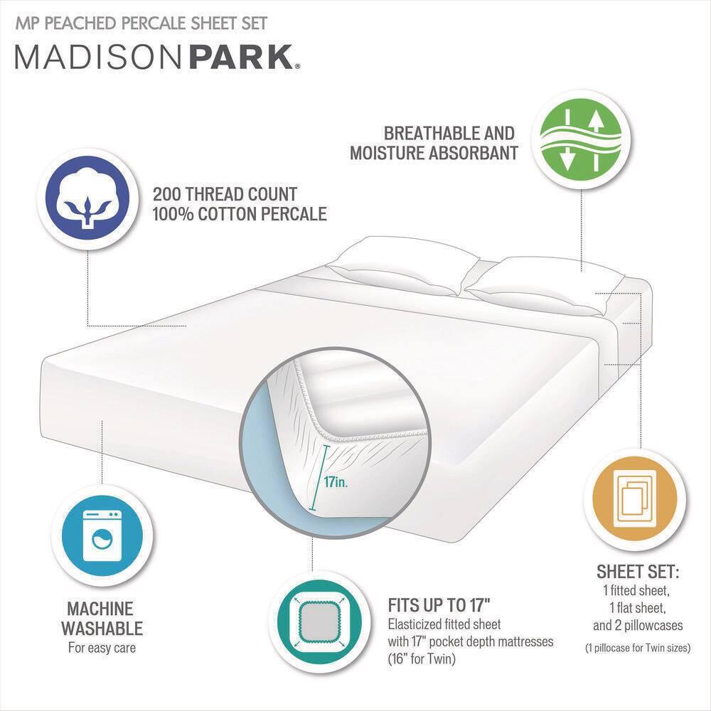 Features Bedding Material: Cotton Care Instructions: Machine Wash Color: Ivory Color Family: White Decor Type: Bedroom Linen Features: Hypoallergenic,Machine Washable Lifestage: Ad ul t Linen Type: Sheet Set Number of Pieces: 4 Occasion: Year Round Pattern Type: Solid Color Pattern/theme: Solid Pocket Depth (in.): 17 in. Returnable : 30-Day Set : Fitted Sheet,Flat Sheet,Pillow cases Size: Queen Thread Count: 200 Item Description Sleep in year-round breathable comfort with these relaxed cotton sheet sets. These sheets have been lightly brushed for an ul tra-soft feel. The percale weave combined with the cotton makes this the perfect sheet if you're looking for a cooler and airy good night's sleep. These sheets are also hypoallergenic and machine washable for easy care.