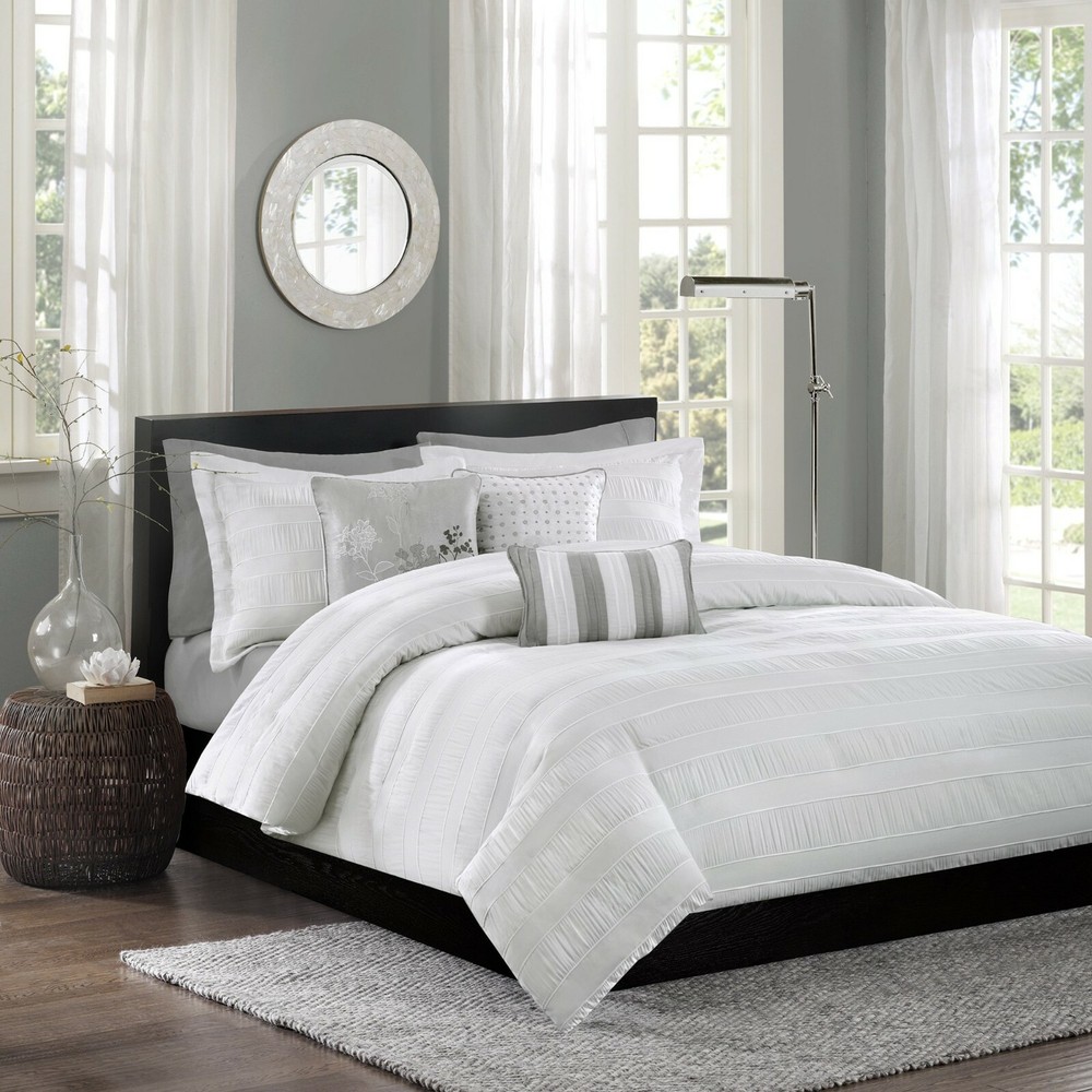 The Madison Park Sheridan Collection adds dimension with the use of fabric manipulation. This unique polyester jacquard fabric has a wrinkle feature that is used in a striped fashion horizontally across the comforter and shams. The bright white used in this set gives a modern feel that be easily be added into your current decor. Three decorative pillows use the top of bed color along with a heather grey for a chic finish. Features: Duvet Cover has internal corner ties to prevent shifting Face material: 100-percent polyester Full/ Queen Dimensions: Duvet Cover: 90 inches wide x 90 inches long Standard Shams: 20 inches wide x 26 inches long Decorative Pillow: 18 inches wide x 18 inches long, 16 inches wide x 16 inches long, 12 inches wide x 18 inches long