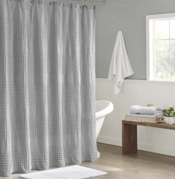 Elevate your bathroom decor with the Madison Park Shower Curtain, a perfect blend of functionality and style. Crafted from 100% cotton, this curtain features a luxurious waffle textured fabric that not only adds a touch of elegance but also provides a safe and gentle touch to your shower experience. The neutral grey color ensures it complements any bathroom color scheme, making it a versatile addition to your space. The curtain's dimensions are a generous 72x72 inches, fitting most standard showers and bathtubs. Designed for convenience, it is machine washable, ensuring easy maintenance. The solid pattern and rectangular shape align with a bohemian style, bringing a modern yet timeless look to your bathroom. Made with care in Pakistan by E & E co., this single-piece fabric curtain promises durability and quality.