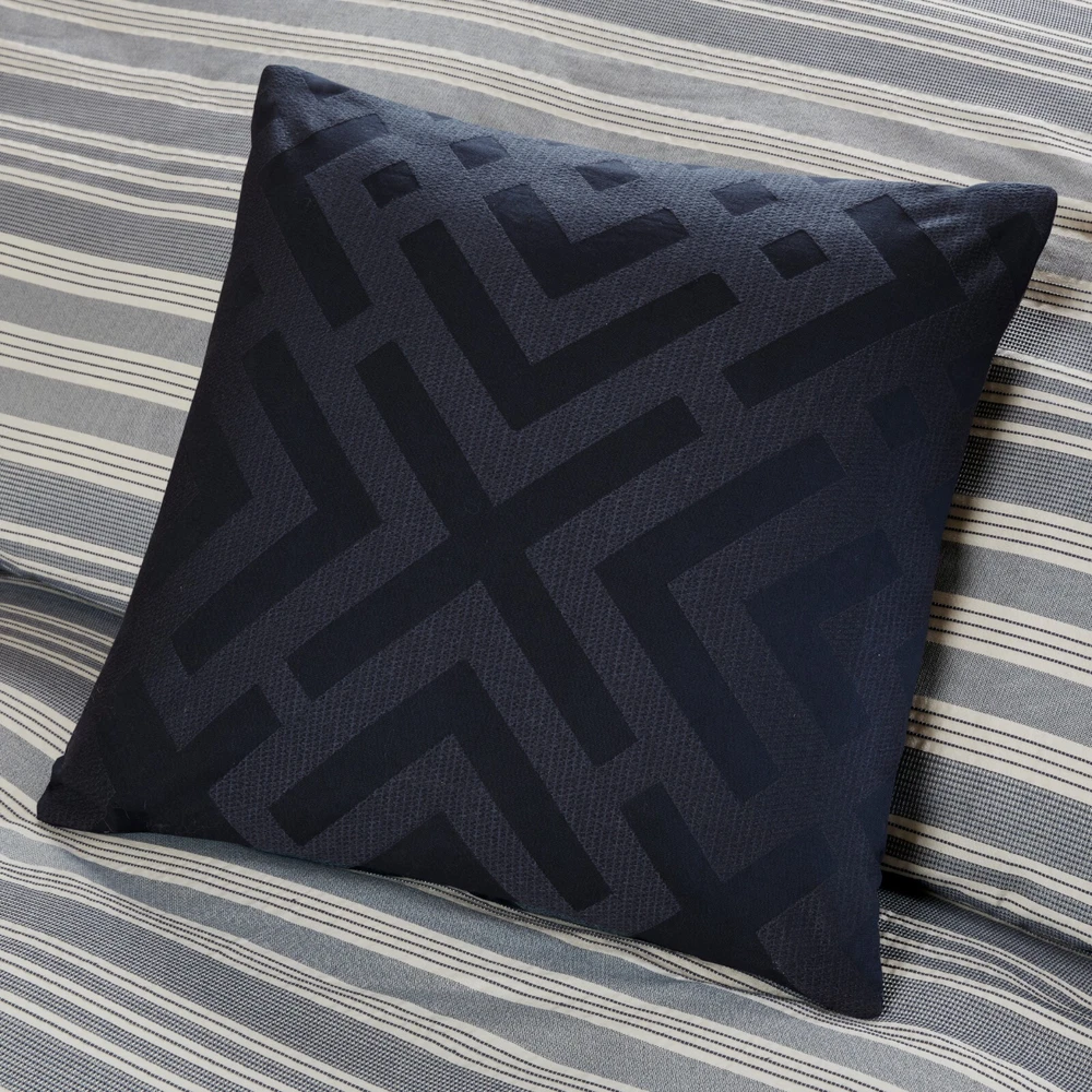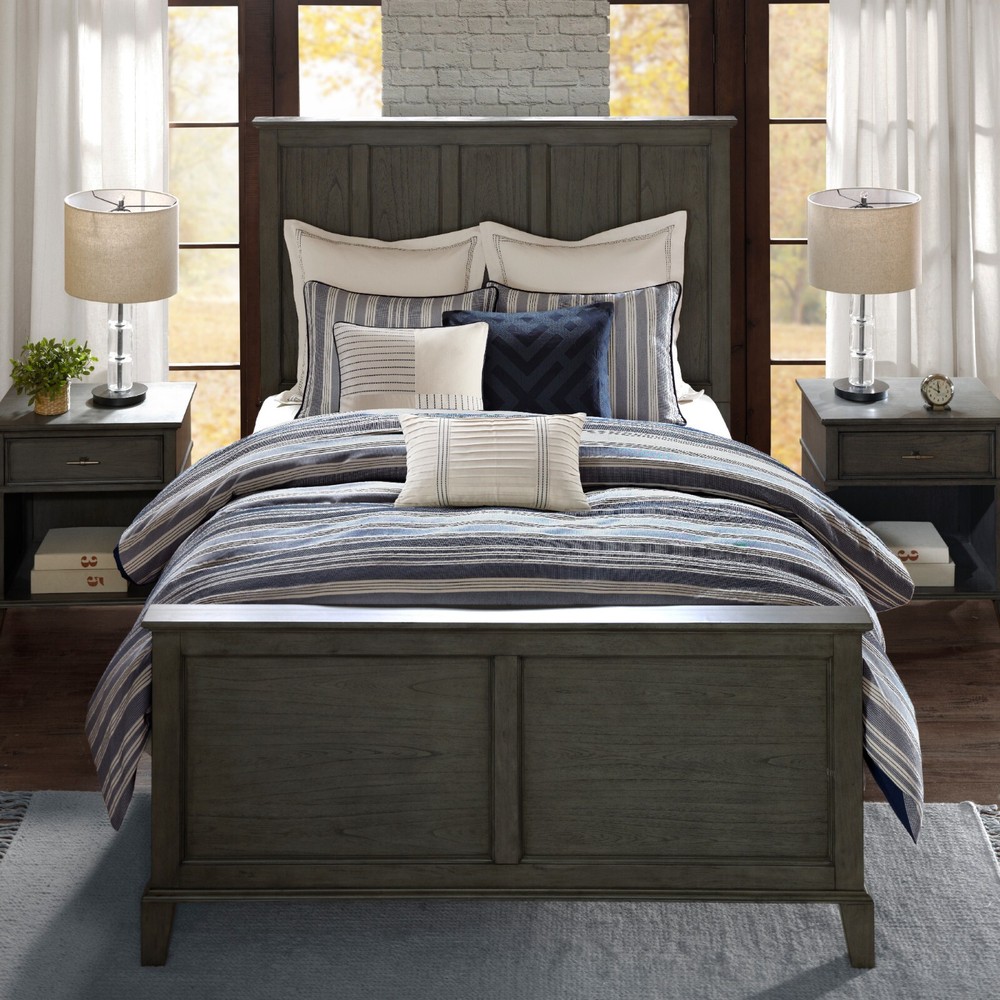 Store Categories Store Categories Bedding Comforters Decorative Pillows Duvet Covers Quilts & Coverlets Sheets Blankets & Throws Mattress Pads Pillows Home Decor Window Treatments Wall Art Home Accents Furniture Beds Dining Seating Ottomans & Benches Accent Chairs Accent Tables Dining Tables Sofas Bath Bath Robes Shower Curtains Towels Bath Rugs Bath Accessories Apparel Pajama Sets Nightgowns Rugs Rugs & Carpets Lighting Lamp Pendant Other Product Overview Details DESCRIPTION The Madison Park Signature Farmhouse Comforter Set sports a navy and ivory woven jacquard stripe pattern for a fresh update to your space. The versatile color palette works well in any style bedroom. The cotton blend comforter is oversized and overfilled to provide exceptional warmth and comfort with a removable cover that makes it easy to clean. Coordinating shams highlight the mixed weaves design on the top of bed, while Euro shams with embroidered details add a natural touch to the on-trend look. Three decorative pillows with varying linear patterns and distinct stitching details complement the easy look and feel of this jacquard comforter set. This set comes with a removable duvet-style insert that is secured by inner ties and a hidden button closure. This provides no visible bartacking lines on top of the bed to create a smooth, clean face. Dry clean comforter cover only and machine wash comforter filler. FEATURES • Casual farmhouse style cotton jacquard blend comforter set • Features a navy and ivory woven jacquard stripe pattern • Oversized and overfilled comforter with removable insert (included), inner ties, and hidden button closure • Duvet style comforter insert, so no visible bartacking lines seen on top of the bed • Set includes comforter, 2 shams, 2 euro shams (3 in King size), 2 square and 1 oblong decorative pillows • Knit and embroidered decorative pillows have removable cover with hidden zipper • Hypoallergenic polyester filling in the comforter and pillow (filling contains no allergens and is treated to be dustproof) • Dry clean comforter cover and machine washable comforter filler MATERIAL Comforter/Sham face: 65% Cotton 35% polyester jacquard Comforter Back: 100% Polyester micro fiber Standard sham back: 65% Cotton 35% polyester solid jacquard, removable seperate polyester filler inserts ( 300g/sqm ) Euro sham: 65% Cotton 35% polyester solid jacquard with embroidery on face 22x22"pillow cover: 100% Cotton faux linen with embroidery on face 20x20" pillow cover: 65% Cotton 35% polyester solid jacquard with embroidery on face 14x20" pillow cover: 65% Cotton 35% polyester pleated with ribbon embroidery on face Pillow: hidden zipper with polyester filler Available Sizes: Queen Comforter Set includes: 1 Comforter: 92"W x 96"L 2 Standard Shams: 20"W x 26"L 2 Euro Shams: 26"W x 26"L + 2"D 1 Decorative Pillow: 22"W x 22"L 1 Decorative Pillow: 20"W x 20"L 1 Decorative Pillow: 14"W x 20"L King Comforter Set includes: 1 Comforter: 110"W x 96"L 2 King Shams: 20"W x 36"L 3 Euro Shams: 26"W x 26"L 1 Decorative Pillow: 22"W x 22"L 1 Decorative Pillow: 20"W x 20"L 1 Decorative Pillow: 14"W x 20"L Bedding Comforters Decorative Pillows Duvet Covers Quilts & Coverlets Sheets Blankets & Throws Mattress Pads Pillows Home Decor Window Treatments Wall Art Home Accents Furniture Beds Dining Seating Ottomans & Benches Accent Chairs Accent Tables Dining Tables Sofas Bath Bath Robes Shower Curtains Towels Bath Rugs Bath Accessories Rugs Rugs & Carpets Lighting Lamp Pendant Product Overview Product Details DESCRIPTION The Madison Park Signature Farmhouse Comforter Set sports a navy and ivory woven jacquard stripe pattern for a fresh update to your space. The versatile color palette works well in any style bedroom. The cotton blend comforter is oversized and overfilled to provide exceptional warmth and comfort with a removable cover that makes it easy to clean. Coordinating shams highlight the mixed weaves design on the top of bed, while Euro shams with embroidered details add a natural touch to the on-trend look. Three decorative pillows with varying linear patterns and distinct stitching details complement the easy look and feel of this jacquard comforter set. This set comes with a removable duvet-style insert that is secured by inner ties and a hidden button closure. This provides no visible bartacking lines on top of the bed to create a smooth, clean face. Dry clean comforter cover only and machine wash comforter filler. FEATURES • Casual farmhouse style cotton jacquard blend comforter set • Features a navy and ivory woven jacquard stripe pattern • Oversized and overfilled comforter with removable insert (included), inner ties, and hidden button closure • Duvet style comforter insert, so no visible bartacking lines seen on top of the bed • Set includes comforter, 2 shams, 2 euro shams (3 in King size), 2 square and 1 oblong decorative pillows • Knit and embroidered decorative pillows have removable cover with hidden zipper • Hypoallergenic polyester filling in the comforter and pillow (filling contains no allergens and is treated to be dustproof) • Dry clean comforter cover and machine washable comforter filler MATERIAL Comforter/Sham face: 65% Cotton 35% polyester jacquard Comforter Back: 100% Polyester micro fiber Standard sham back: 65% Cotton 35% polyester solid jacquard, removable seperate polyester filler inserts ( 300g/sqm ) Euro sham: 65% Cotton 35% polyester solid jacquard with embroidery on face 22x22"pillow cover: 100% Cotton faux linen with embroidery on face 20x20" pillow cover: 65% Cotton 35% polyester solid jacquard with embroidery on face 14x20" pillow cover: 65% Cotton 35% polyester pleated with ribbon embroidery on face Pillow: hidden zipper with polyester filler Available Sizes: Queen Comforter Set includes: 1 Comforter: 92"W x 96"L 2 Standard Shams: 20"W x 26"L 2 Euro Shams: 26"W x 26"L + 2"D 1 Decorative Pillow: 22"W x 22"L 1 Decorative Pillow: 20"W x 20"L 1 Decorative
