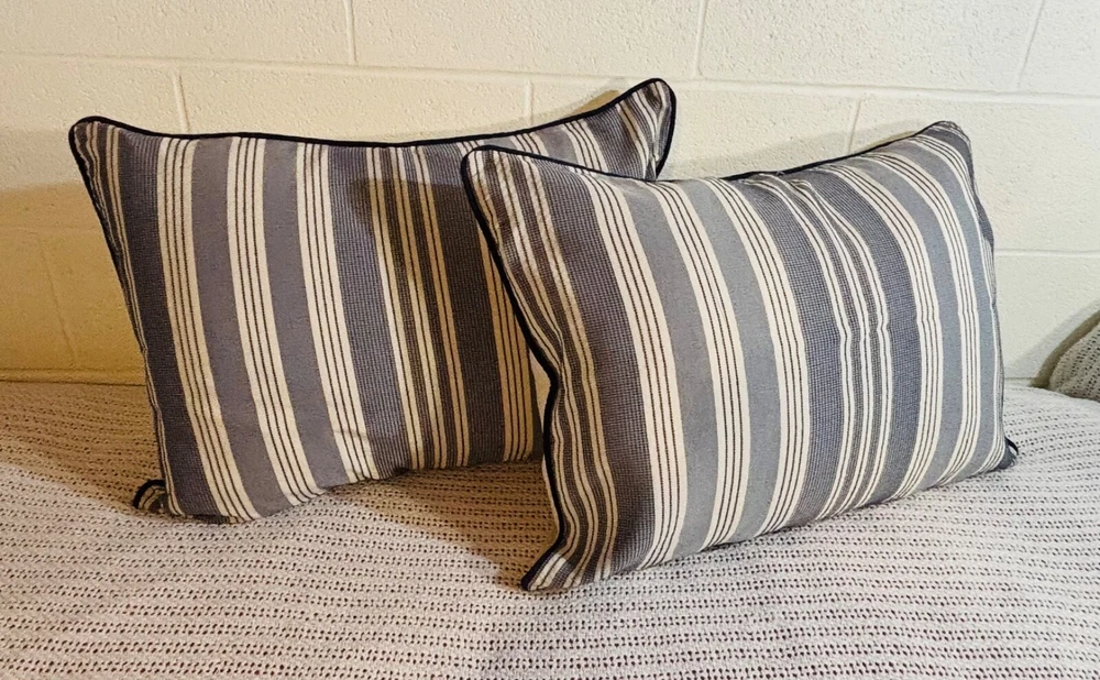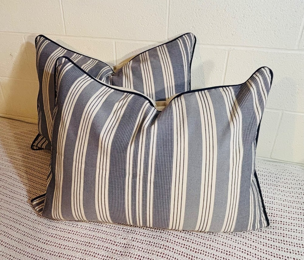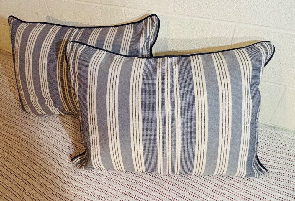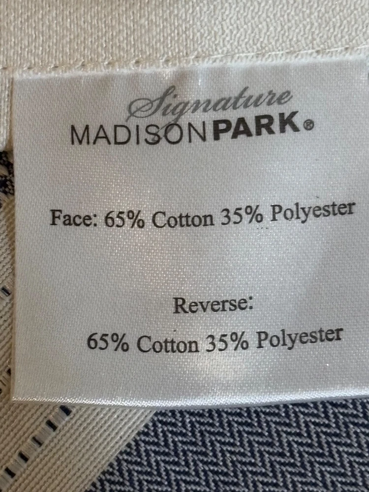 Madison Park Signature Farmhouse Throw Pillows are a set of 2 standard-sized pillows featuring a woven jacquard striped pattern in navy blue and ivory. The pillows are lightweight and made of polyester with a cotton blend (65% cotton and 35% polyester). They are designed for adults and are suitable for all seasons. The pillows are 26 inches in length and 20 inches in width, with a button closure. Dry clean care instructions are recommended for this farmhouse-style addition to any bedroom.
