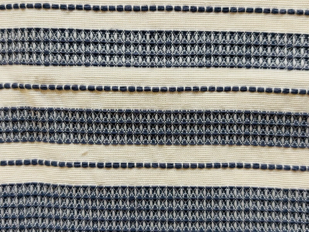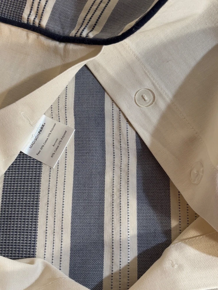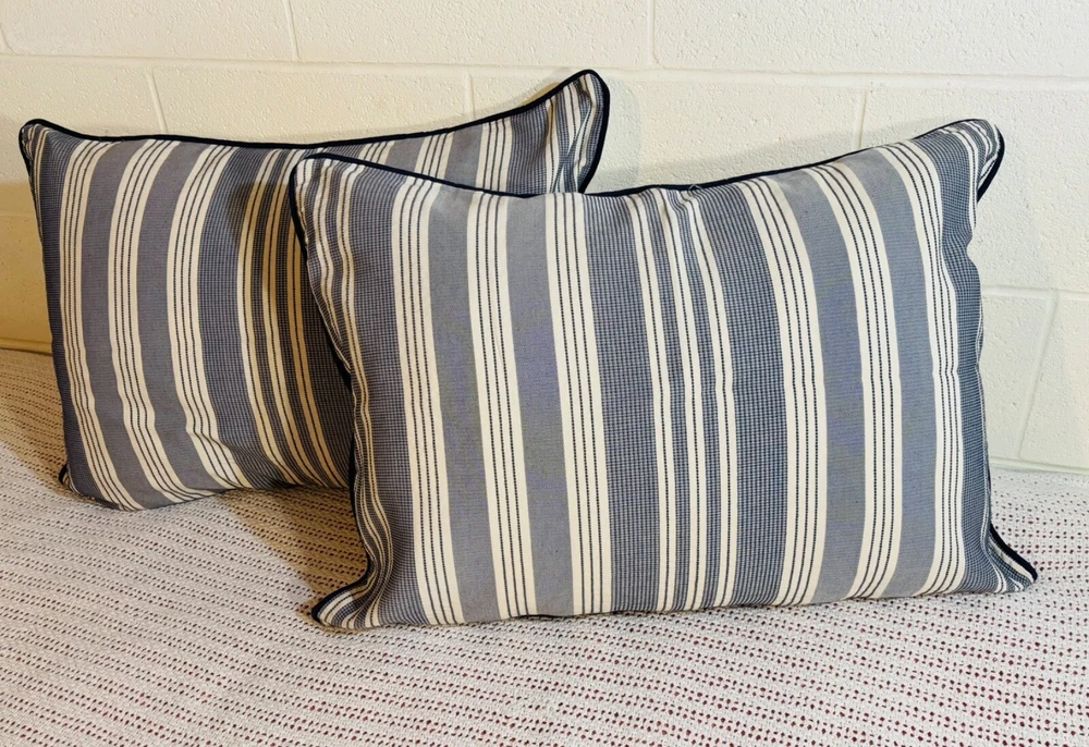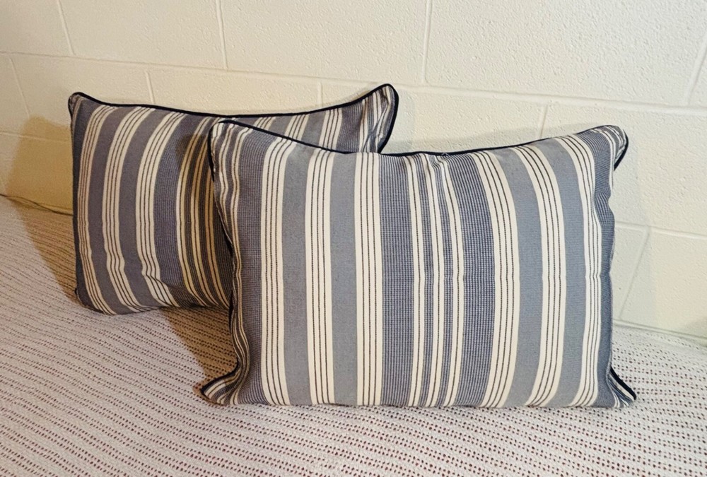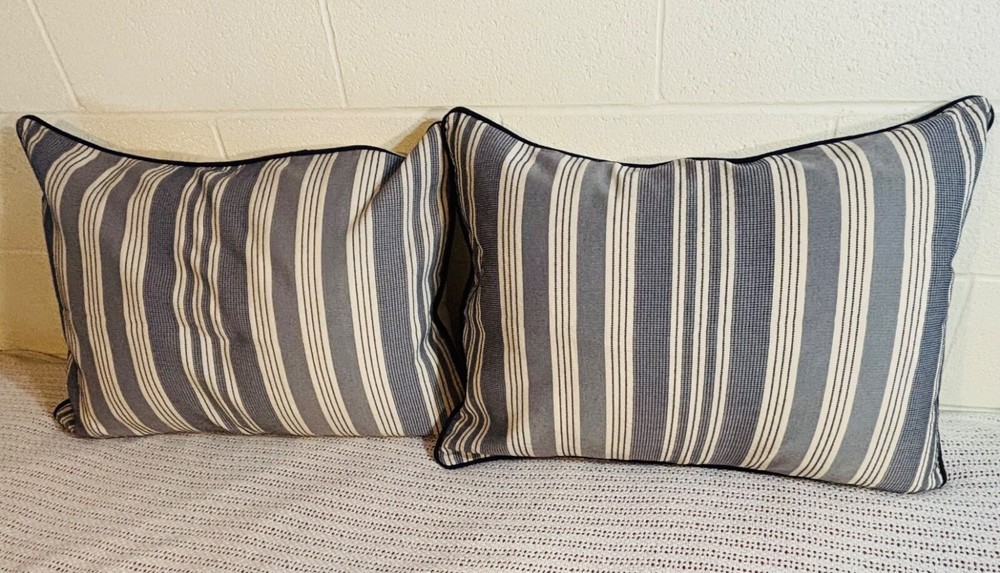 Madison Park Signature Farmhouse Throw Pillows are a set of 2 standard-sized pillows featuring a woven jacquard striped pattern in navy blue and ivory. The pillows are lightweight and made of polyester with a cotton blend (65% cotton and 35% polyester). They are designed for adults and are suitable for all seasons. The pillows are 26 inches in length and 20 inches in width, with a button closure. Dry clean care instructions are recommended for this farmhouse-style addition to any bedroom.