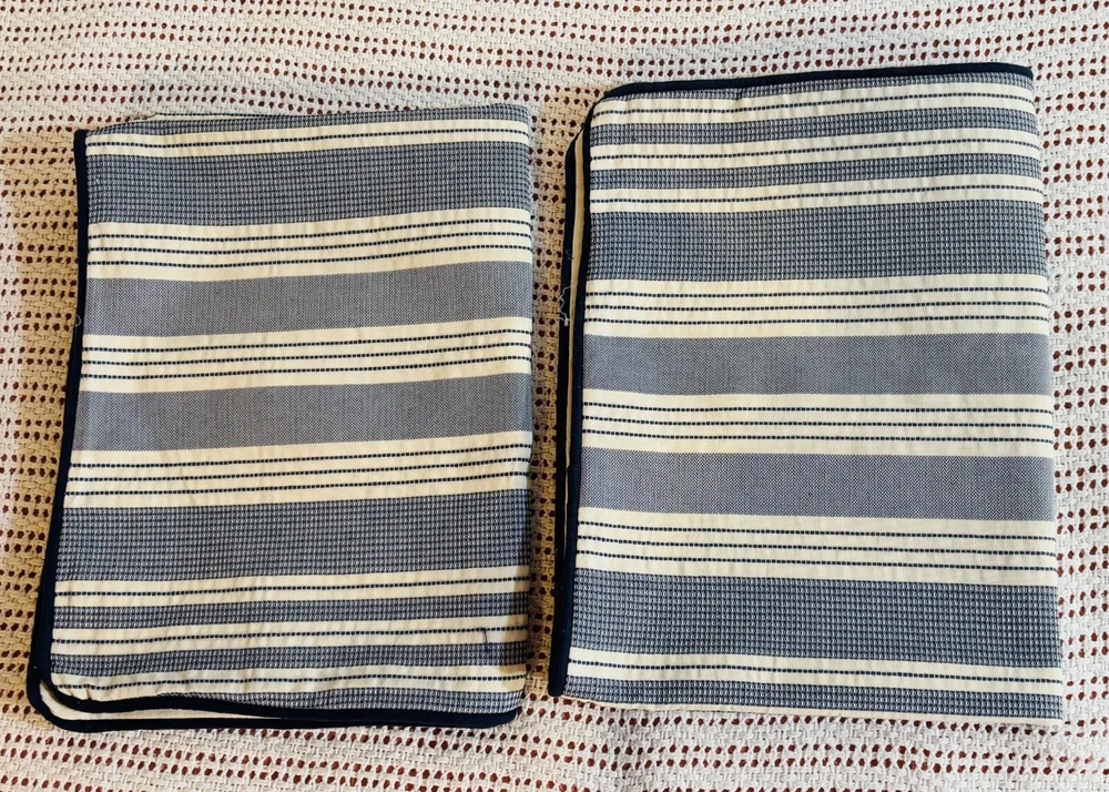 Beautiful Pillow covers. One tiny tiny spot almost not noticeable as part of the pattern but they came in Excellent Condition. Item as described and pictured. Clean and folded nicely. Very Pretty. Quickly Shipped. Packaged appropriately. Fair pricing lowered priced offered. Nice Seller!