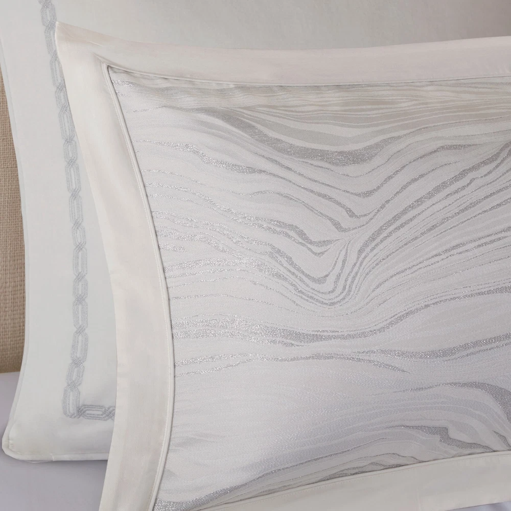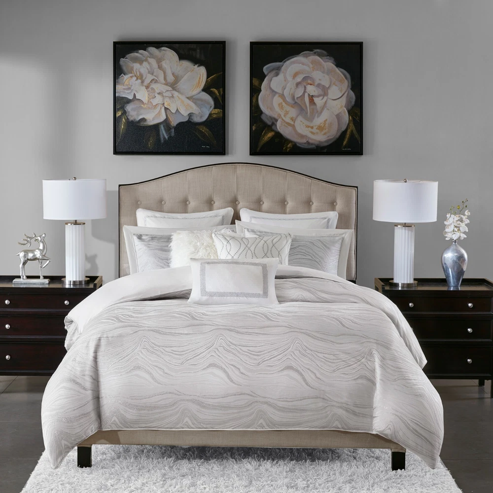 Store Categories Store Categories Bedding Comforters Decorative Pillows Duvet Covers Quilts & Coverlets Sheets Blankets & Throws Mattress Pads Pillows Home Decor Window Treatments Wall Art Home Accents Furniture Beds Dining Seating Ottomans & Benches Accent Chairs Accent Tables Dining Tables Sofas Bath Bath Robes Shower Curtains Towels Bath Rugs Bath Accessories Apparel Pajama Sets Nightgowns Rugs Rugs & Carpets Lighting Lamp Pendant Other Product Overview Details DESCRIPTION The Madison Park Signature Hollywood Glam Comforter Set offers a modern and elegant update to the bedroom. This jacquard comforter flaunts an all-over metallic detailing on the luxurious white base, for glamorous allure. Coordinating shams mirror the motif of the comforter and the Euro shams feature a rich cotton velvet face with embroidered details. Three decorative pillows are embellished with unique embroidery and texture, adding dimension and glam to this lavish comforter set. The oversized and overfilled comforter uses and includes a removable duvet-style insert that is secured by inner ties and a hidden button closure. This provides no visible bartacking lines on top of the bed to create a smooth, clean face. Dry clean comforter cover only and machine wash comforter filler. This bedding set is OEKO-TEX certified, meaning it does not contain any harmful substances or chemicals, ensuring quality comfort and wellness. FEATURES • Elegant and glamorous, modern/contemporary jacquard comforter set • Features an all-over metallic detailing on the luxurious white base • Oversized and overfilled comforter with removable insert (included), inner ties, and hidden button closure • Duvet style comforter insert, so no visible bartacking lines seen on top of the bed • Set includes comforter, 2 shams, 2 euro shams (3 in King size), 2 square and 1 oblong decorative pillows • Decorative pillows have removable cover with hidden zipper • Hypoallergenic polyester filling in the comforter and pillow (filling contains no allergens and is treated to be dustproof) • Oeko-Tex Certified, includes no harmful substances or chemicals (# 19.HCN.68889) • Dry clean comforter cover and machine washable comforter filler MATERIAL Comforter/Sham face: 100% polyester jacquard with metallic with filled piping around 3 edges Comforter Back: 100% polyester micro fiber Standard sham back: 100% polyester solid jacquard, removable seperate polyester filler inserts ( 300g/sqm ) Euro sham: 100% cotton velvet with embroidery on face 20x20"pillow cover: faux fur pilow 20x20" pillow cover: 100% polyester jacquard with embrodiery on face 14x20" pillow cover: 100% cotton velvet with embroidery on face Pillow: hidden zipper with polyester filler Available Sizes: Queen Comforter Set includes: 1 Comforter: 92"W x 96"L 2 Standard Shams: 20"W x 26"L + 2"D 2 Euro Shams: 26"W x 26"L 2 Decorative Pillows: 20"W x 20"L 1 Decorative Pillow: 14"W x 20"L King Comforter Set includes: 1 Comforter: 110"W x 96"L 2 King Shams: 20"W x 36"L + 2"D 3 Euro Shams: 26"W x 26"L 2 Decorative Pillows: 20"W x 20"L 1 Decorative Pillow: 14"W x 20"L Bedding Comforters Decorative Pillows Duvet Covers Quilts & Coverlets Sheets Blankets & Throws Mattress Pads Pillows Home Decor Window Treatments Wall Art Home Accents Furniture Beds Dining Seating Ottomans & Benches Accent Chairs Accent Tables Dining Tables Sofas Bath Bath Robes Shower Curtains Towels Bath Rugs Bath Accessories Rugs Rugs & Carpets Lighting Lamp Pendant Product Overview Product Details DESCRIPTION The Madison Park Signature Hollywood Glam Comforter Set offers a modern and elegant update to the bedroom. This jacquard comforter flaunts an all-over metallic detailing on the luxurious white base, for glamorous allure. Coordinating shams mirror the motif of the comforter and the Euro shams feature a rich cotton velvet face with embroidered details. Three decorative pillows are embellished with unique embroidery and texture, adding dimension and glam to this lavish comforter set. The oversized and overfilled comforter uses and includes a removable duvet-style insert that is secured by inner ties and a hidden button closure. This provides no visible bartacking lines on top of the bed to create a smooth, clean face. Dry clean comforter cover only and machine wash comforter filler. This bedding set is OEKO-TEX certified, meaning it does not contain any harmful substances or chemicals, ensuring quality comfort and wellness. FEATURES • Elegant and glamorous, modern/contemporary jacquard comforter set • Features an all-over metallic detailing on the luxurious white base • Oversized and overfilled comforter with removable insert (included), inner ties, and hidden button closure • Duvet style comforter insert, so no visible bartacking lines seen on top of the bed • Set includes comforter, 2 shams, 2 euro shams (3 in King size), 2 square and 1 oblong decorative pillows • Decorative pillows have removable cover with hidden zipper • Hypoallergenic polyester filling in the comforter and pillow (filling contains no allergens and is treated to be dustproof) • Oeko-Tex Certified, includes no harmful substances or chemicals (# 19.HCN.68889) • Dry clean comforter cover and machine washable comforter filler MATERIAL Comforter/Sham face: 100% polyester jacquard with metallic with filled piping around 3 edges Comforter Back: 100% polyester micro fiber Standard sham back: 100% polyester solid jacquard, removable seperate polyester filler inserts ( 300g/sqm ) Euro sham: 100% cotton velvet with embroidery on face 20x20"pillow cover: faux fur pilow 20x20" pillow cover: 100% polyester jacquard with embrodiery on face 14x20" pillow cover: 100% cotton velvet with embroidery on face Pillow: hidden zipper with polyester filler Available Sizes: Queen Comforter Set includes: 1 Comforter: 92"W x 96"L 2 Standard Shams: 20"W x 26"L + 2"D 2 Euro Shams: 26"W x 26"L 2 Decorative Pillows: 20"W x 20"L 1 Decorative Pillow: 14"W x 20"L King 