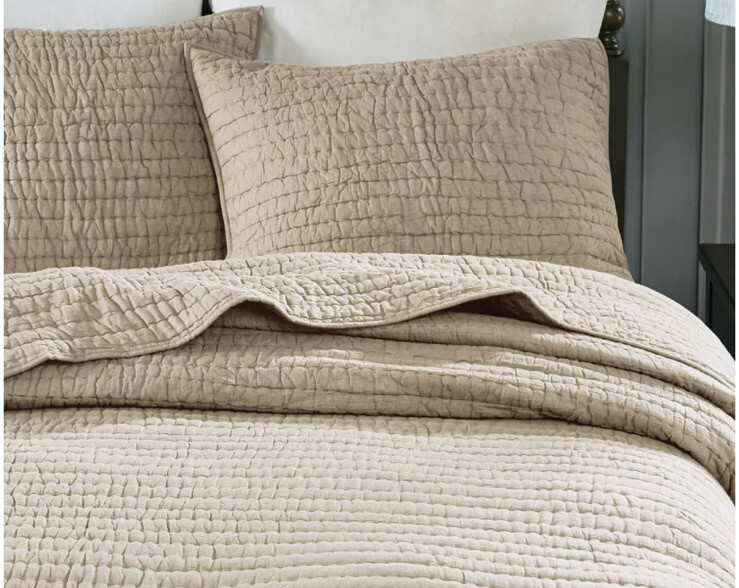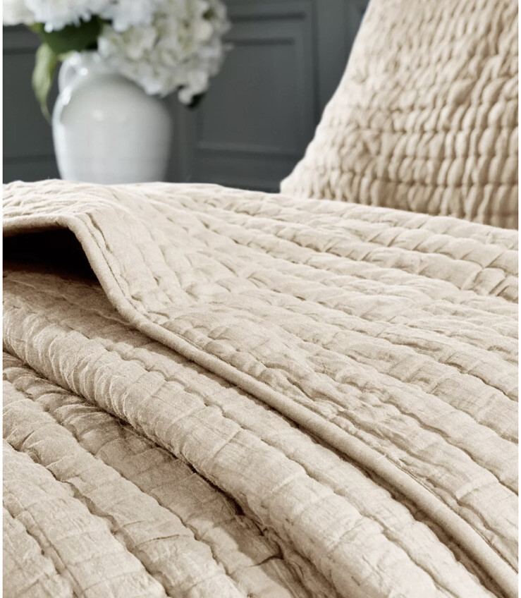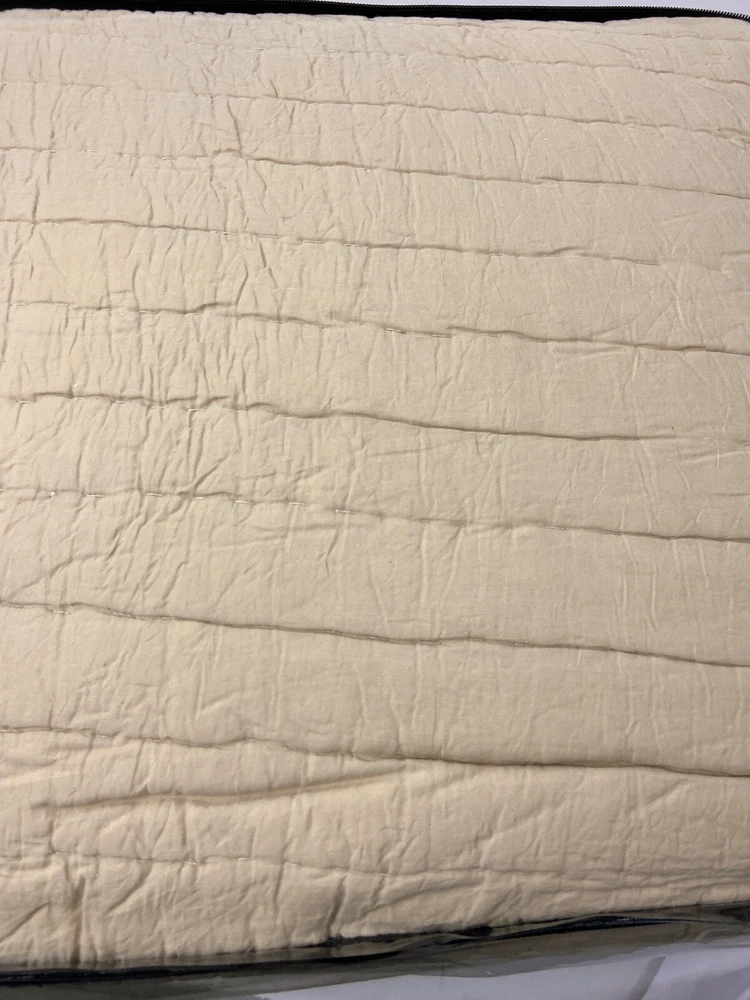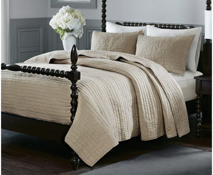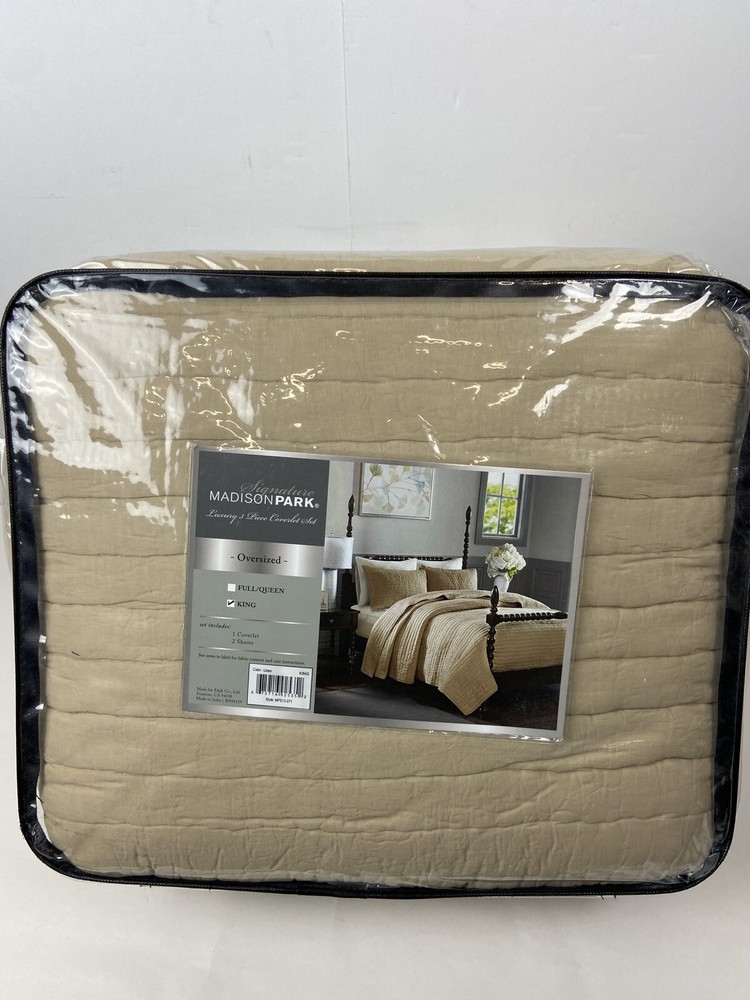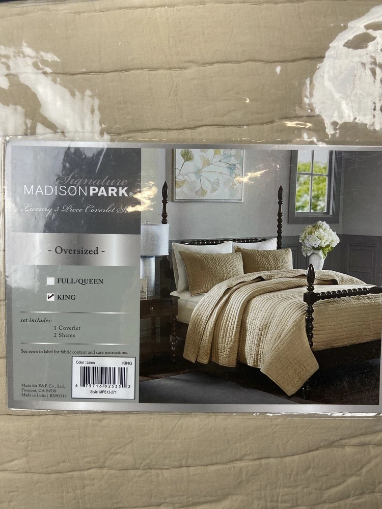 This Madison Park coverlet set is new in package! Size: King Color: Linen Retail Price: $590.00 Details: Feel the comfort and luxury by Madison Park Signature Serene cotton bedding set. Made by pre-shrunk cotton voile face fabric hand sewn with cotton batting, the channel stitching offers simplicity and comfort to your bedding ensemble. Use it alone for summer season or added layer for cold season. • Coverlet - 110" × 96". 2 Shams - 20" × 36" • Includes - Coverlet, 2 Shams • Bedding is oversized for better draping coverage in high depth mattress • Fabric Pattern - Solid • Coverlet/Sham - 100% Cotton Volie, Coverlet Fill - 250Gram 100% Cotton • Machine Washable • Imported